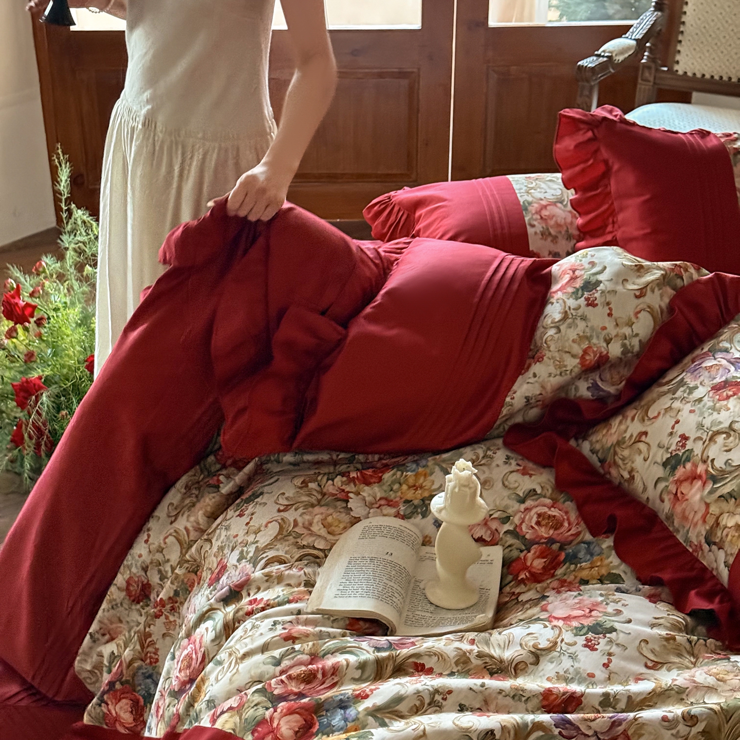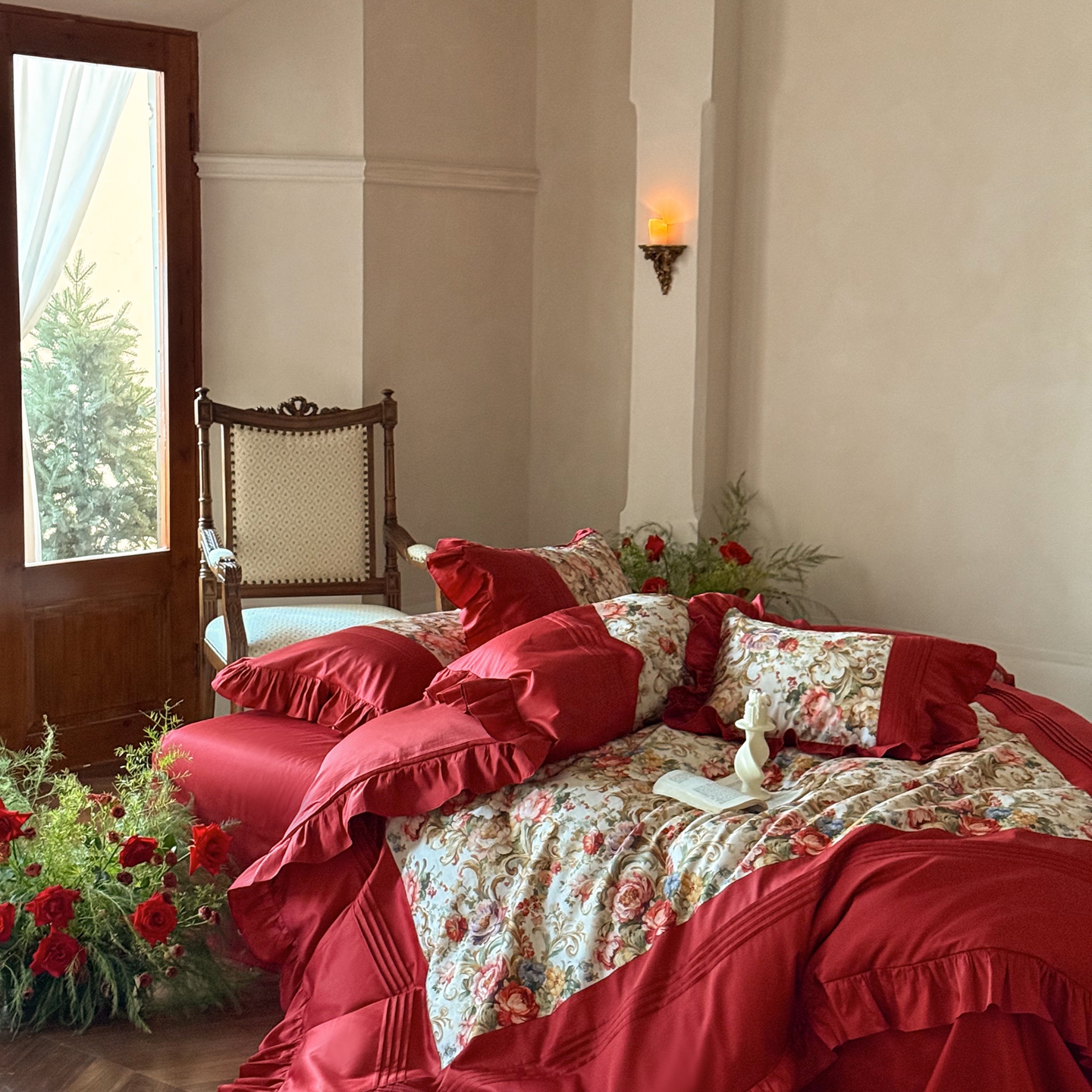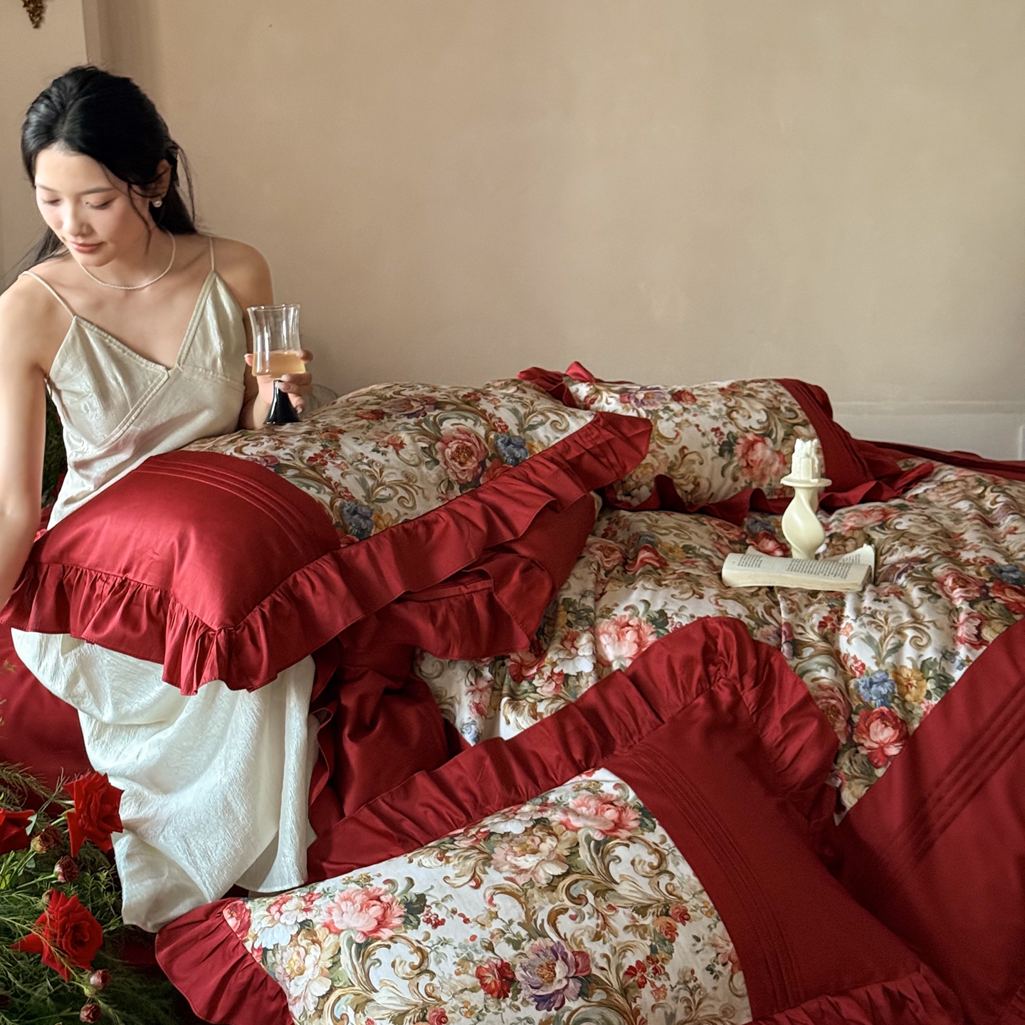 (总)优然居家纺 2025春夏新款木耳边喜字蝴蝶结小爱心复古红四件套-小欢喜,小欢喜