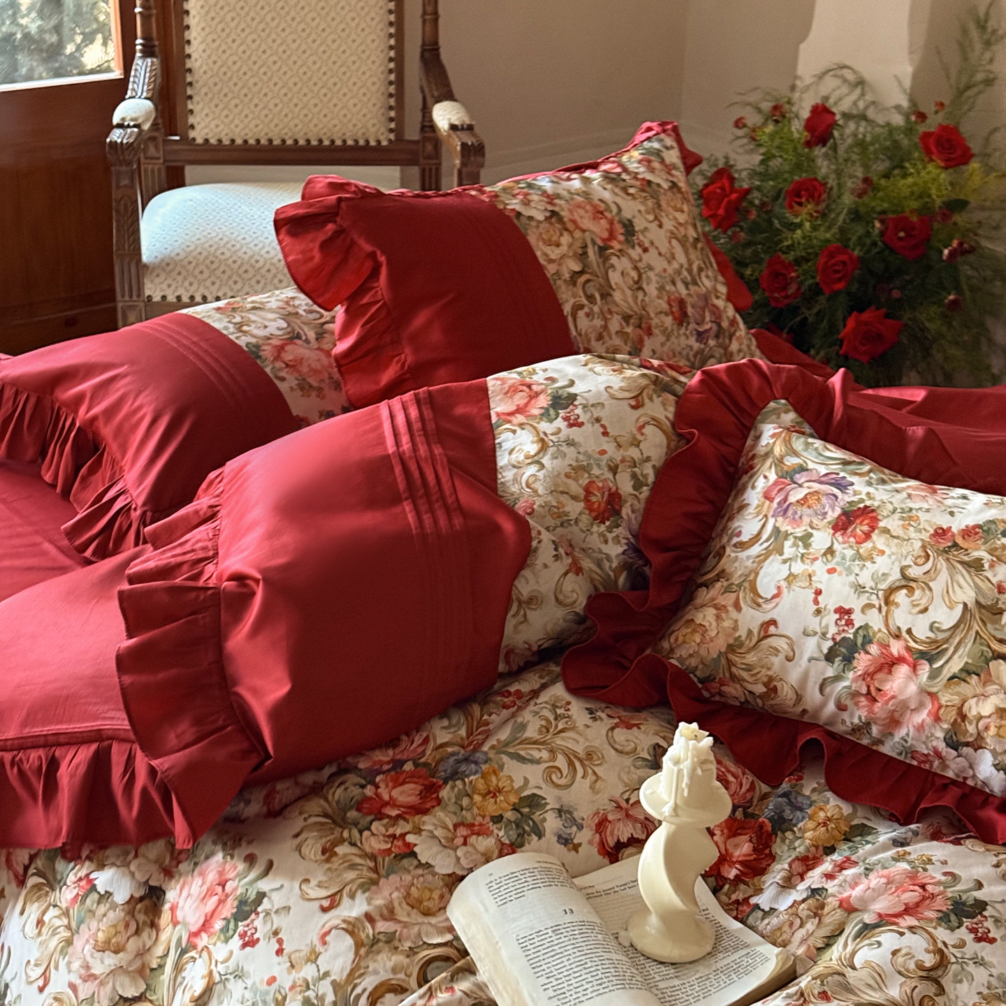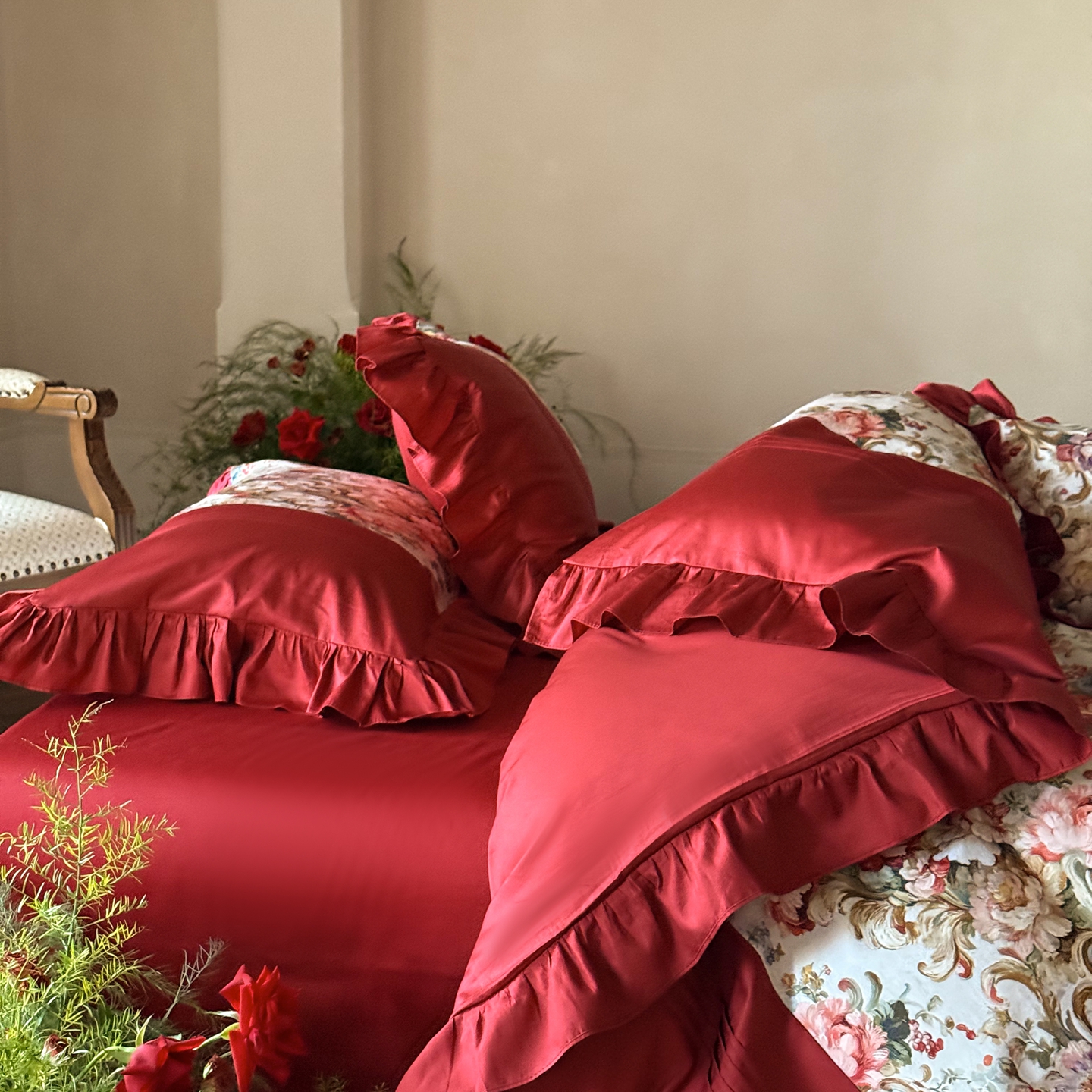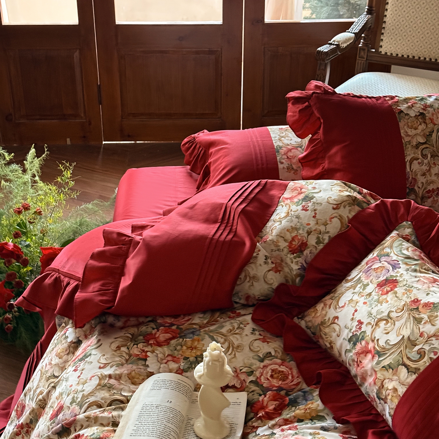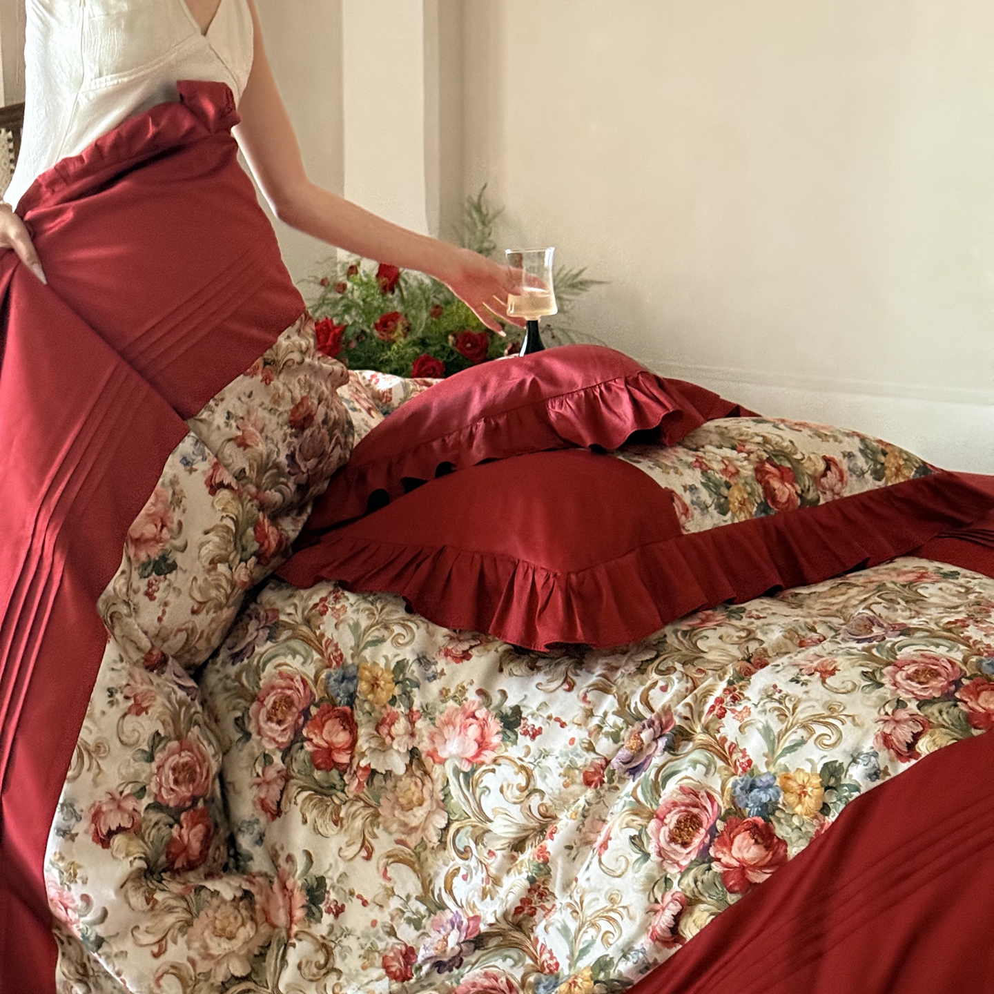 (总)优然居家纺 2025春夏新款木耳边喜字蝴蝶结小爱心复古红四件套-小欢喜,小欢喜