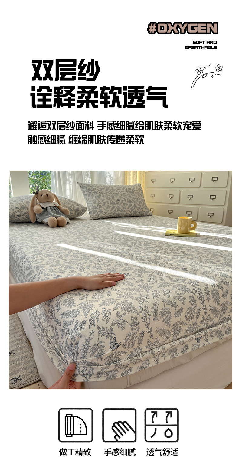 沐芷 2026 【提供买家秀】双层纱A类床笠单件/床笠三件套 床笠款床罩床垫保护套罩 东方草木