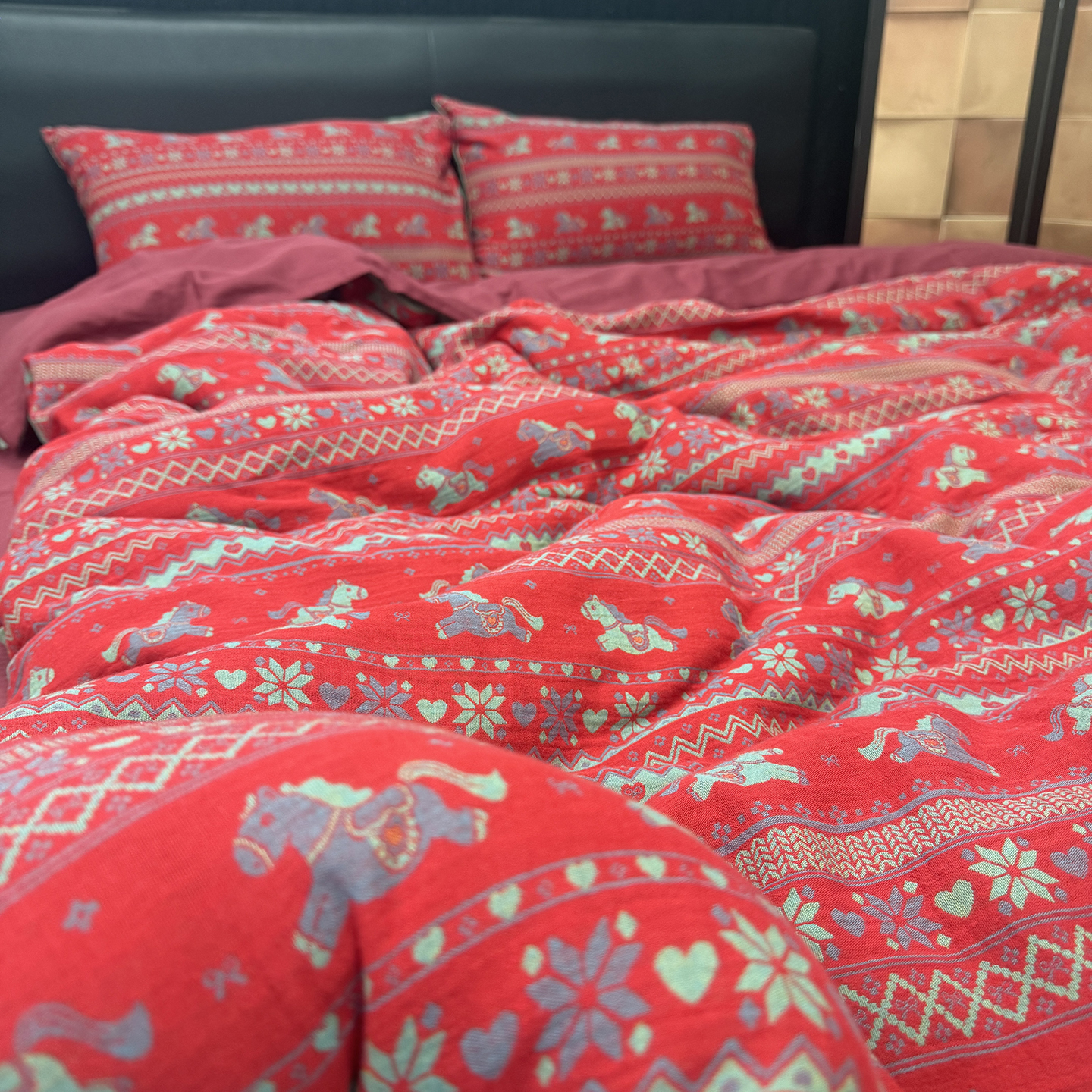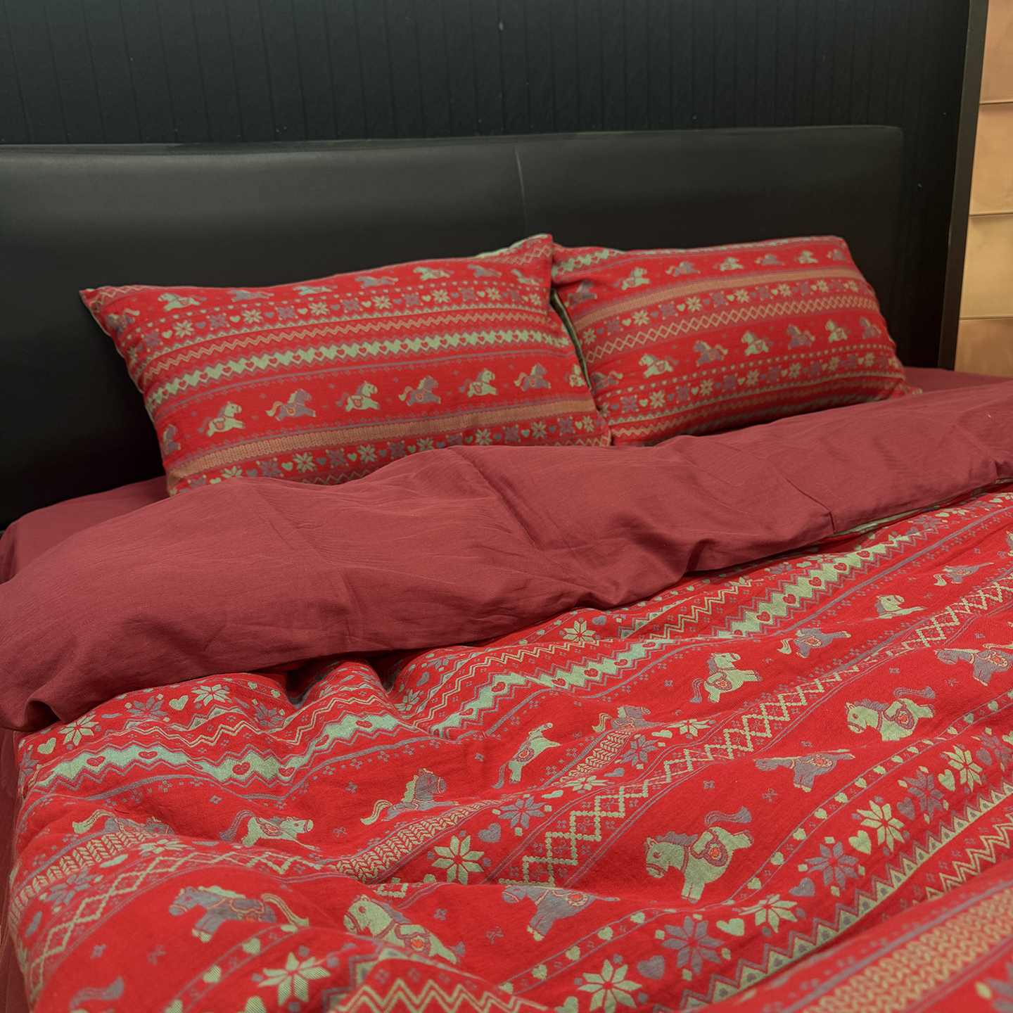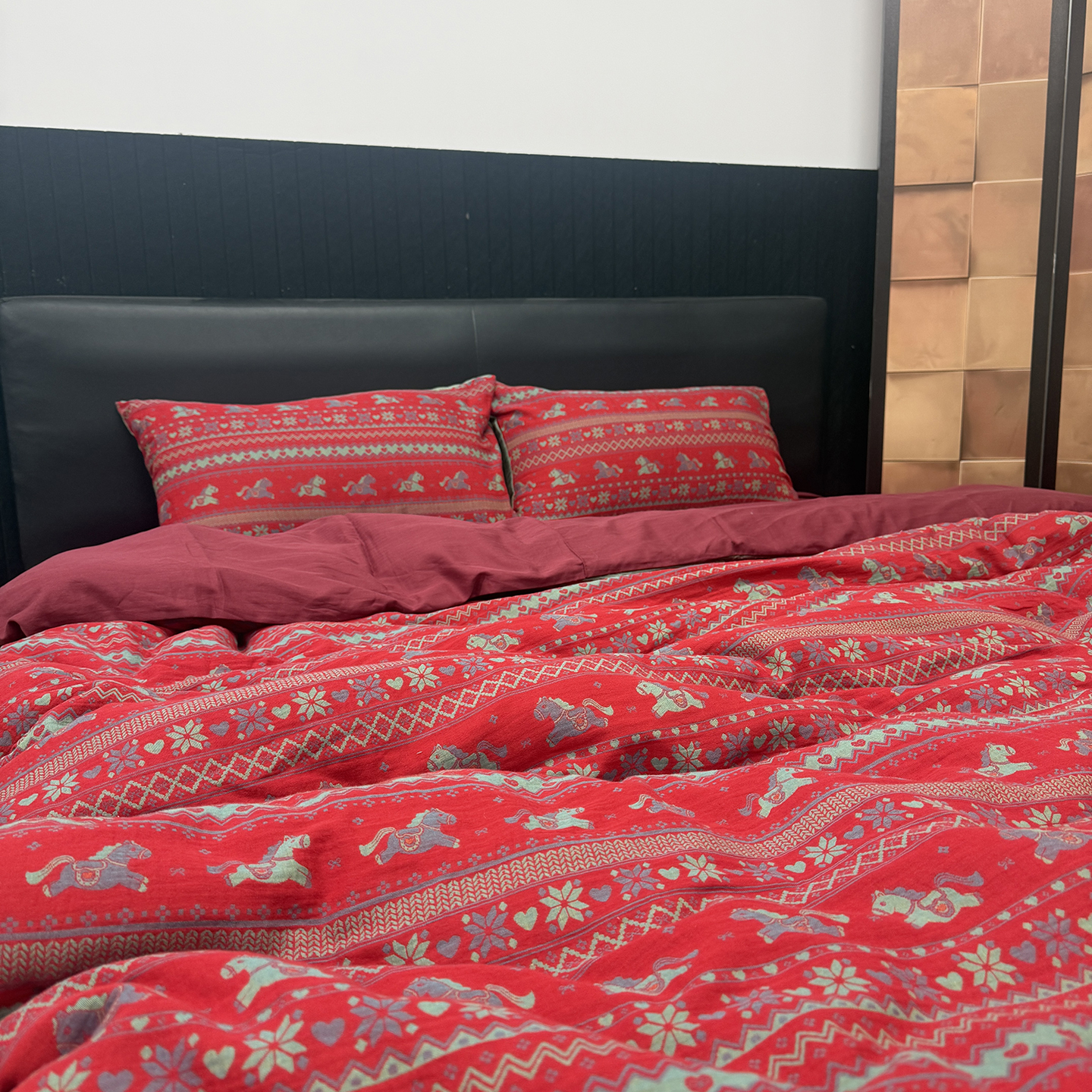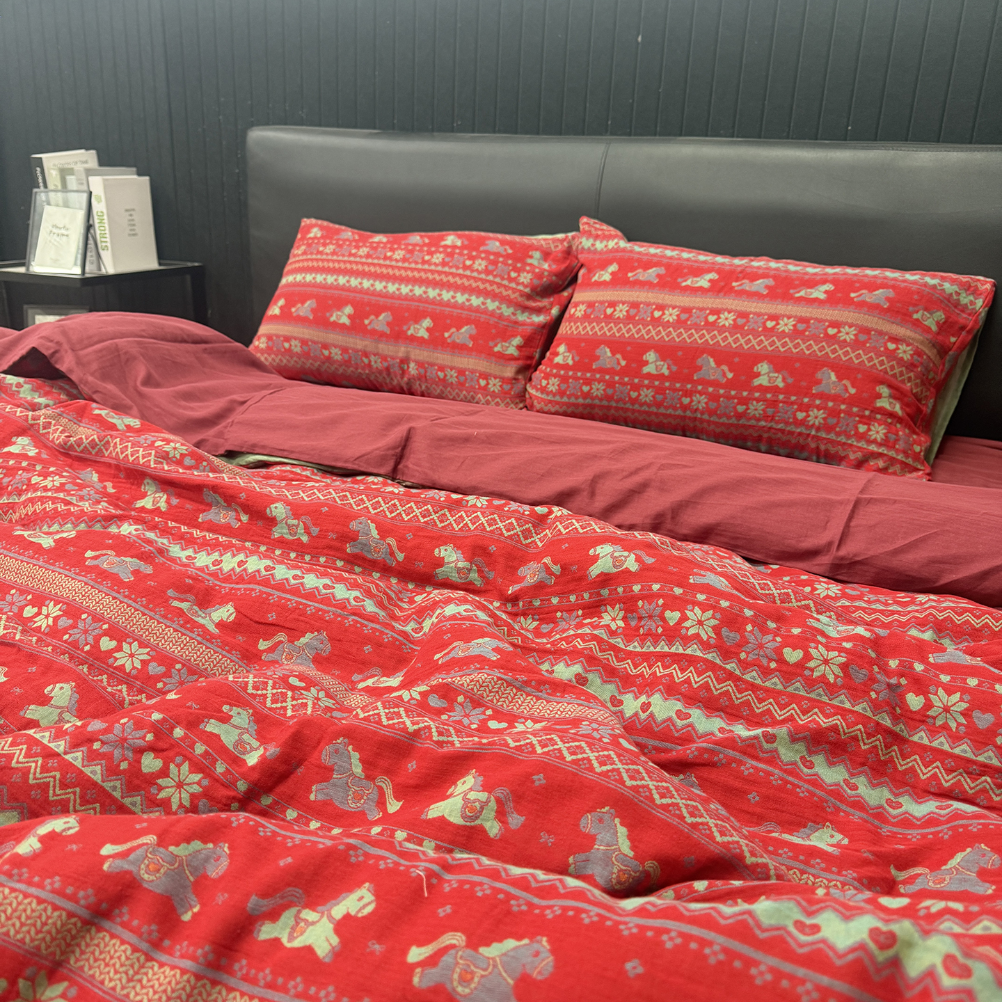 (总)仰望棉麻双层纱供应链 2026新款快乐小马全棉色织提花四件套