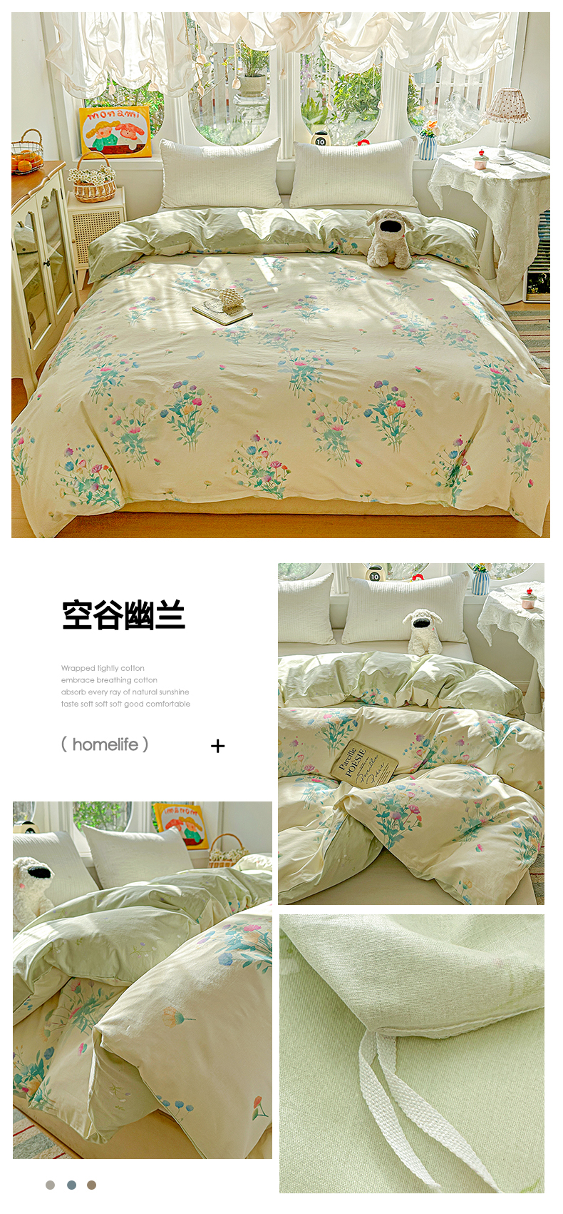 (总)佳汐蓝家纺 2026春夏新款棉麻皱皱双层纱四件套-栀子茉莉 控价:卷后不低于398,栀子茉莉-绿色床单,栀子茉莉-麻色床单