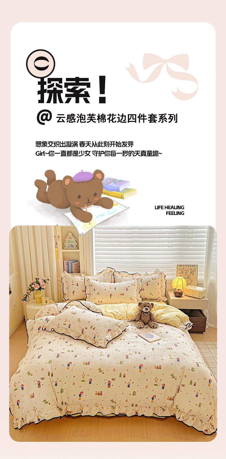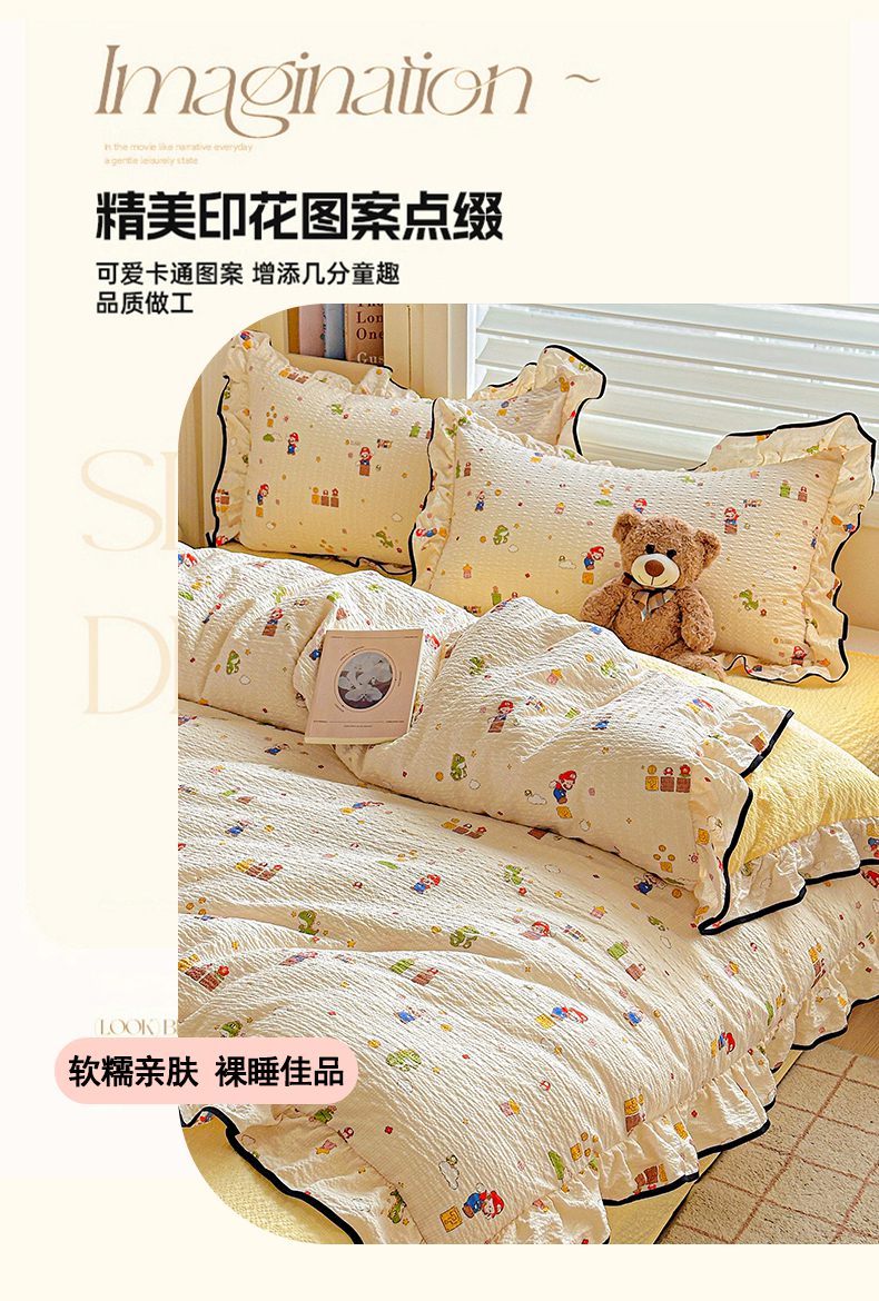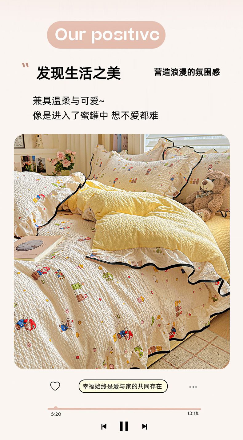 (总)芯贝儿 2026新品加厚法式泡芙棉水洗棉云感皱皱双层纱花边四件套,马上有钱,爱心蝴蝶结,彩色爱心,超级玛丽,蝶梦,快乐小熊,蓝调,萌宠,柠夏,奇奇乐园,青花,小飞马,小雪人,旋转木马
