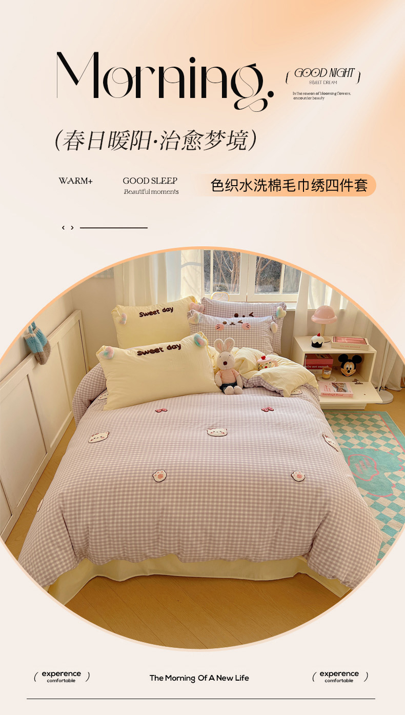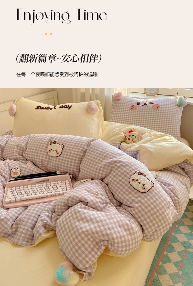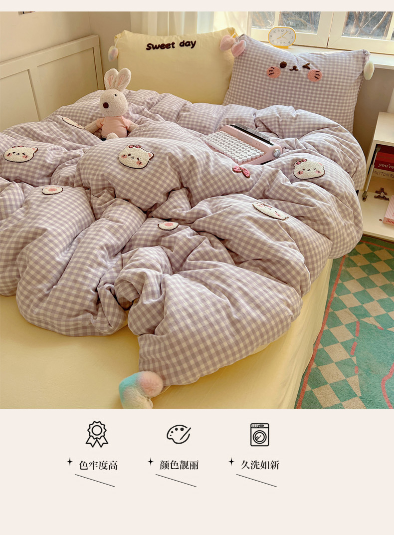 当前位置: 91家纺网 > 商品网购 > 床品套件 > 四件套 > 全棉普通四件套 > 丽涵家纺 2026新款全棉色织水洗棉毛巾绣四件套-甜心小猫 甜心小猫-紫格-简单款