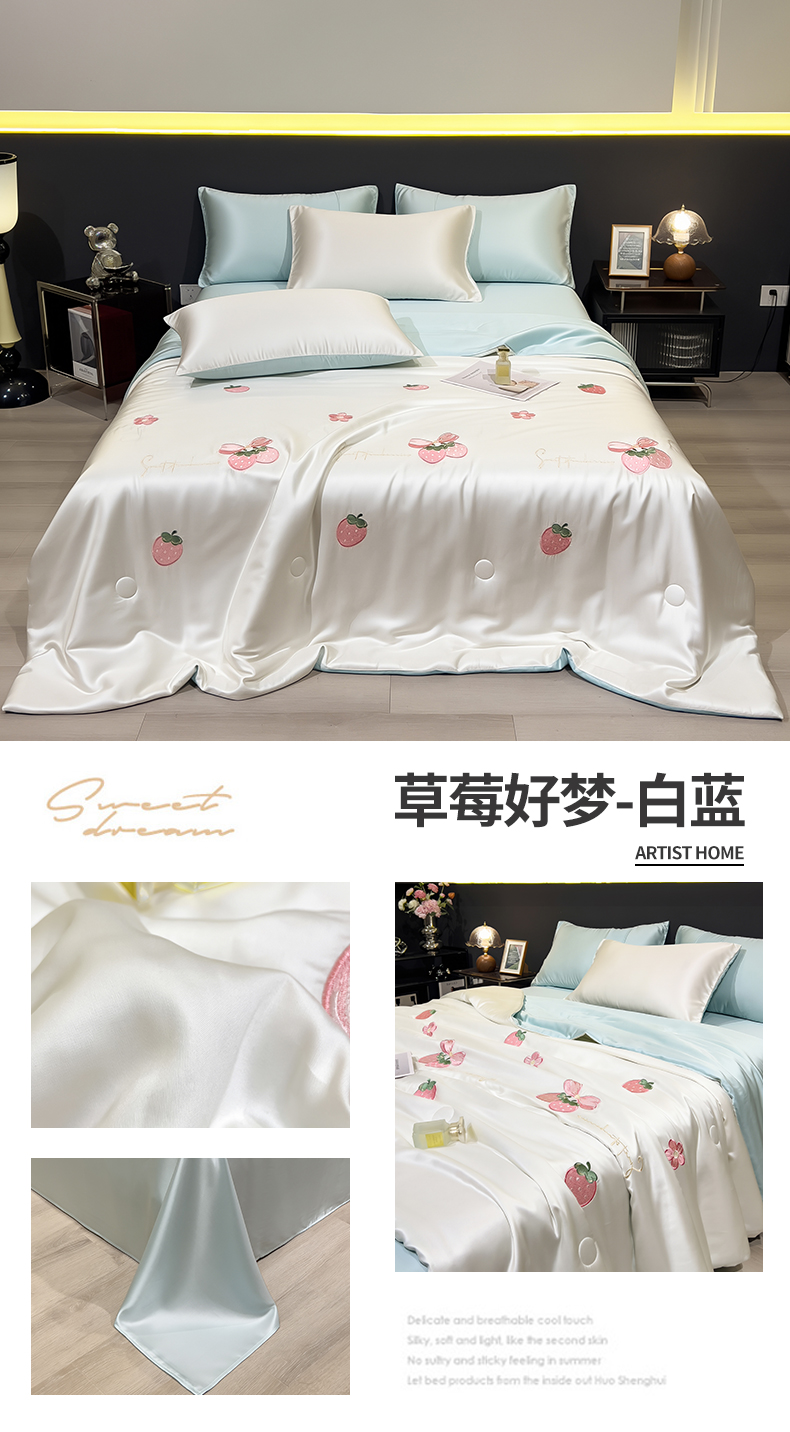 • 91家纺网 家纺一手货源 找家纺 兄弟坊 2026新款水洗冰丝刺绣夏被夏凉被夏被四件套 草莓好梦-白蓝