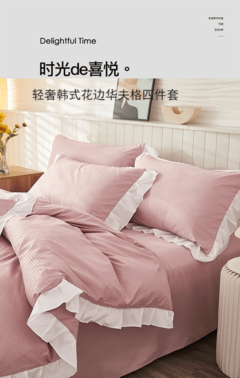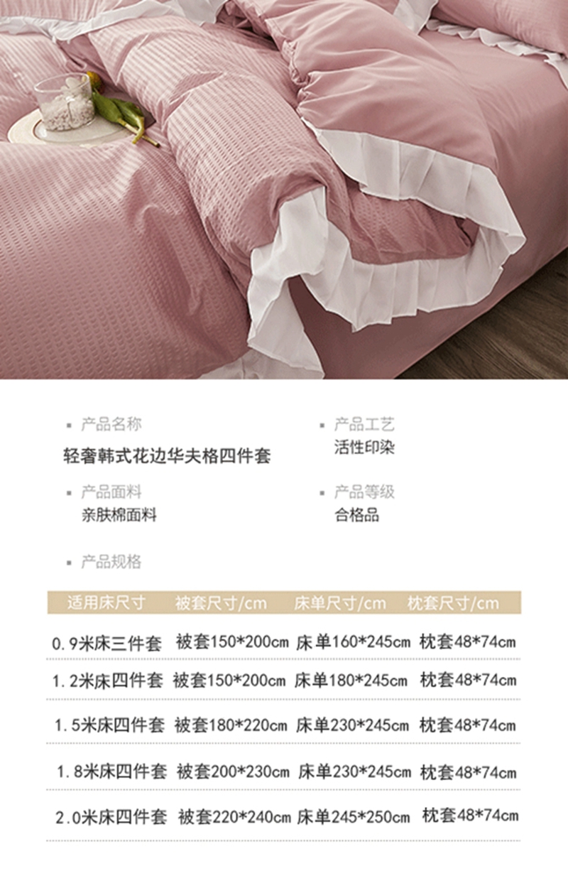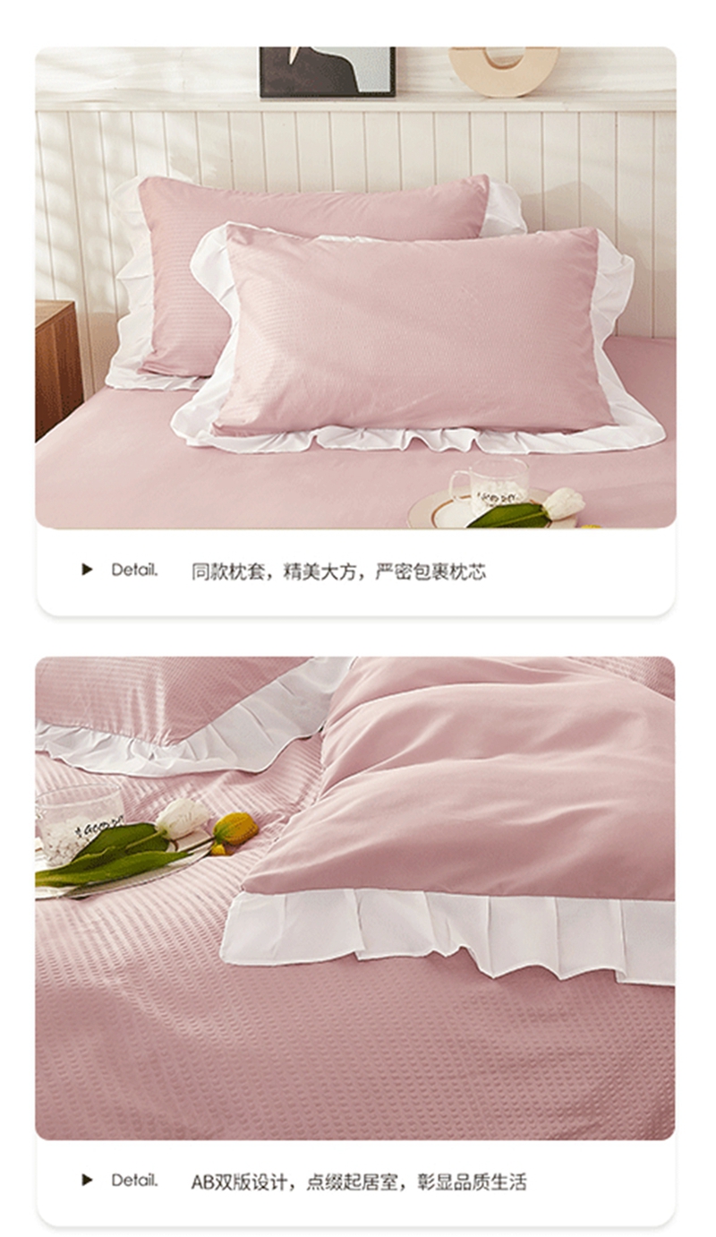 当前位置: 91家纺网 > 商品网购 > 床品套件 > 四件套 > 其它四件套 > 啊雅家居 2026新款轻奢韩式花边华夫格四件套 梦幻粉