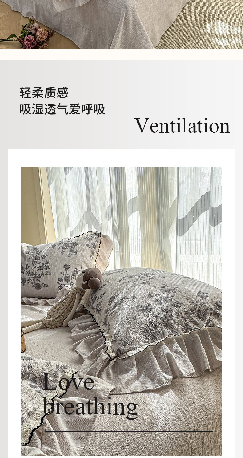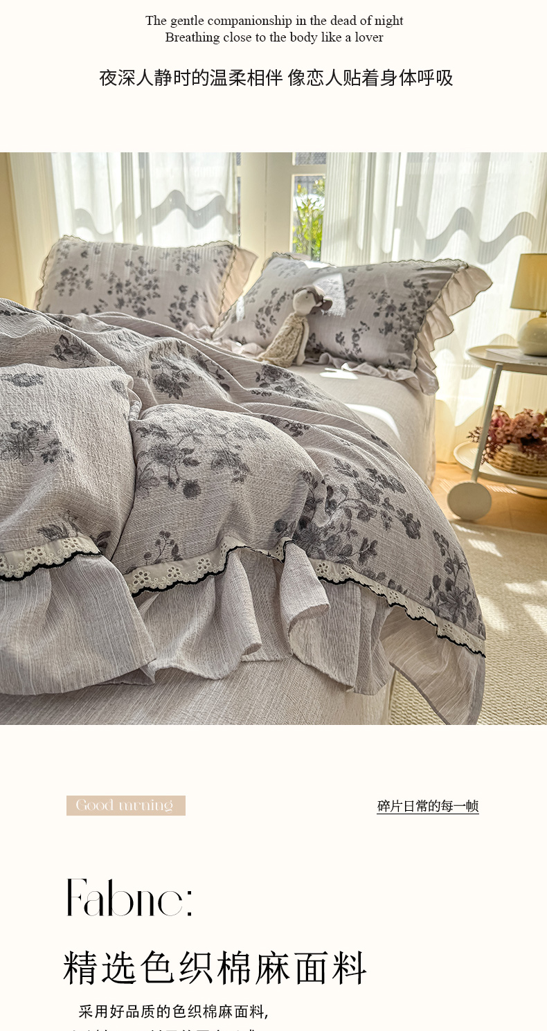 大麦家纺 2026新款水洗色织棉麻花边四件套 玫瑰之吻