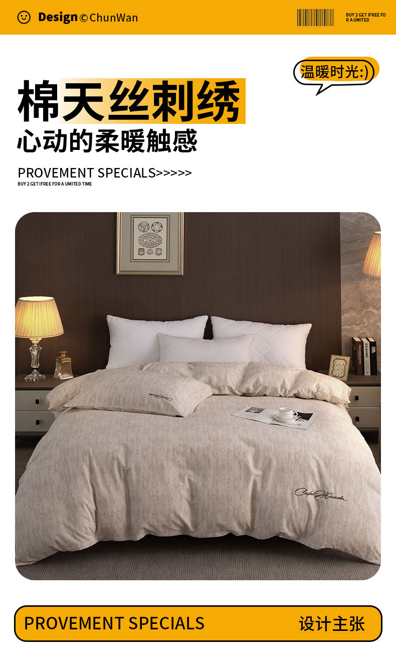 (总)春皖家纺 2026春夏新款天丝棉刺绣四件套,宝绮蓝,亮绮黄,曼妮-贝壳色,曼妮-绿萝纱,曼妮-云褐色,曼妮-紫,苔绮绿,钛绮灰,樱绮丝