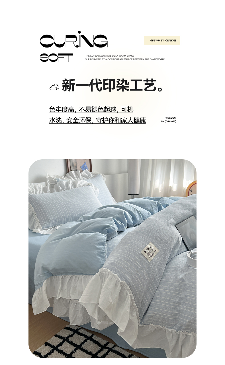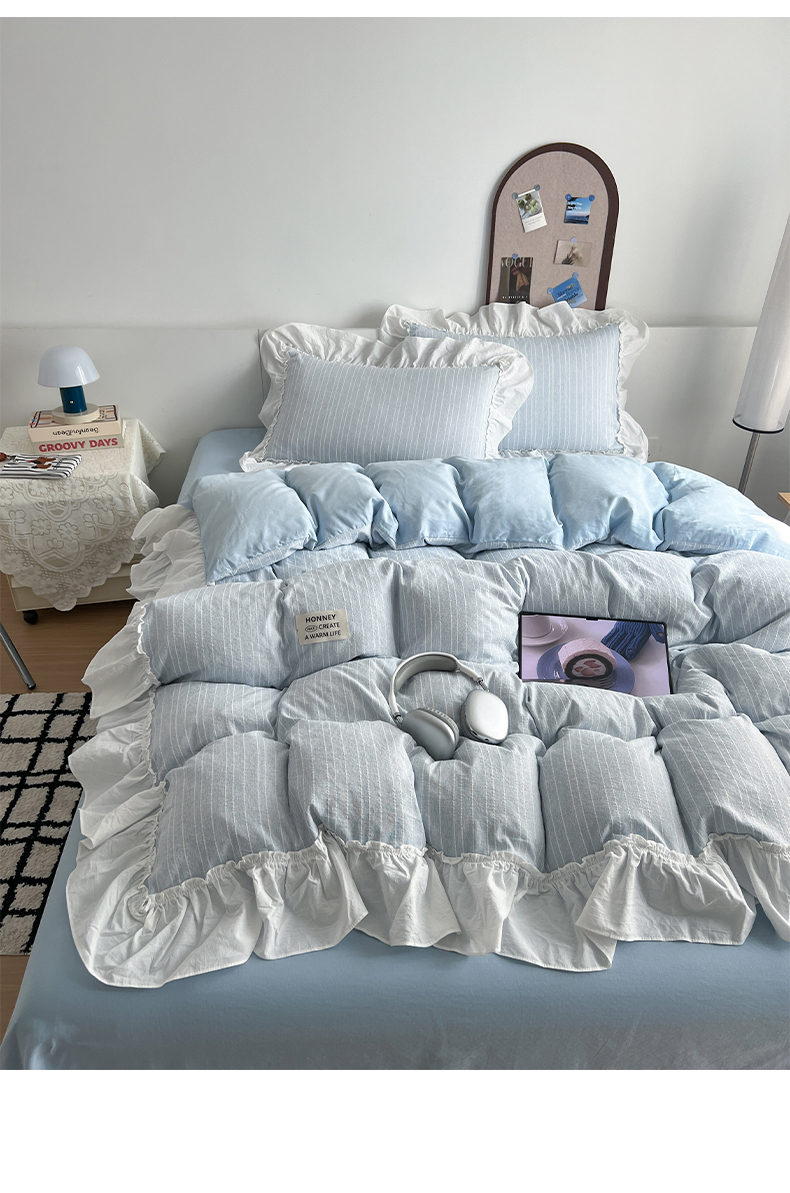 当前位置: 91家纺网 > 商品网购 > 床品套件 > 四件套 > 化纤普通四件套 > 晨曦家纺 2026新款荷叶花边泡芙纱提花四件套可水洗棉四件套少女风 温柔灰蓝