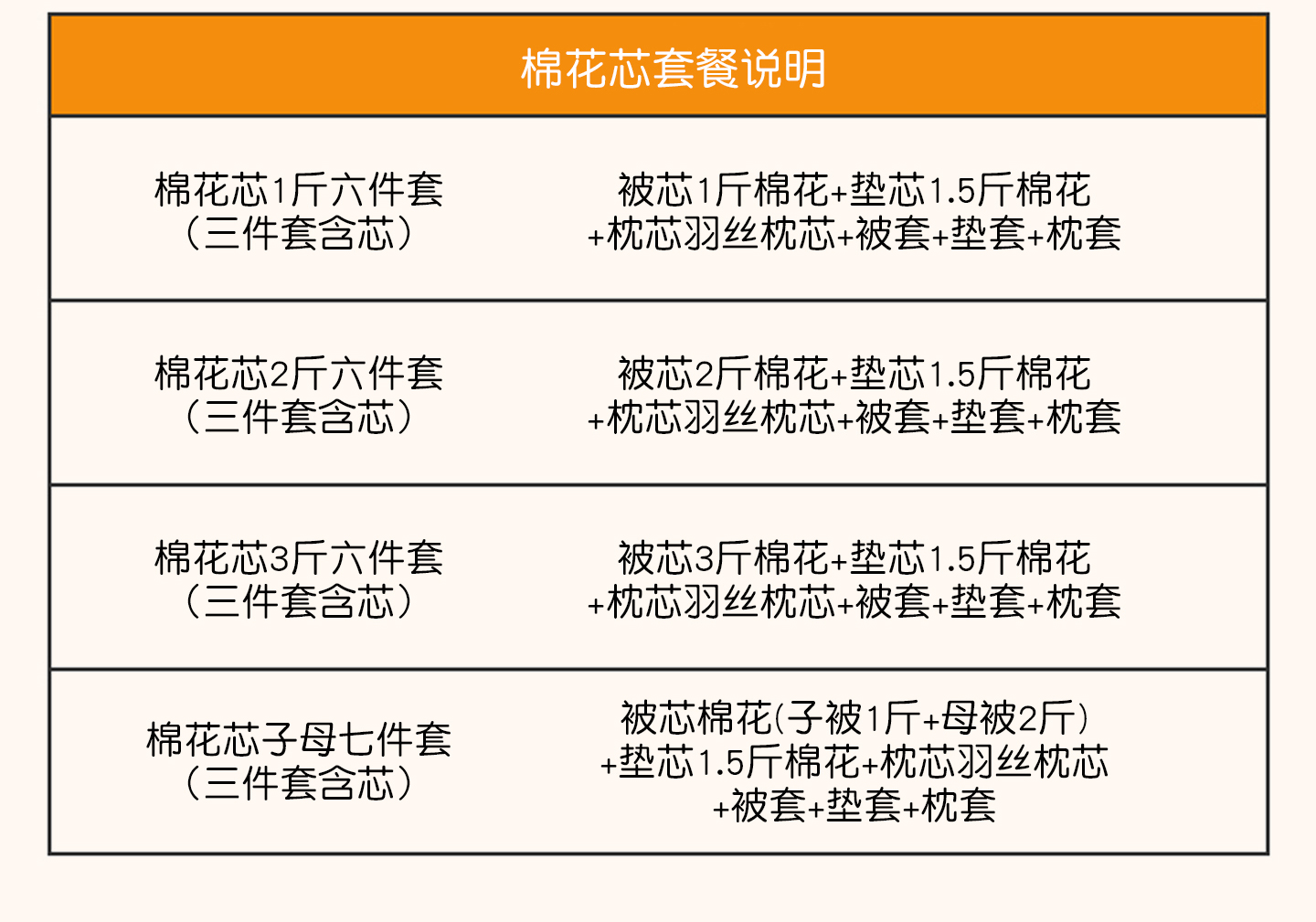棉花芯1斤六件套(三件套含芯) | ¥155.00 |