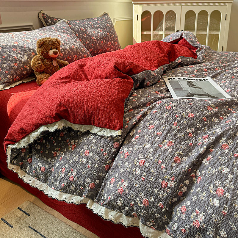 (总)一比一家纺 2026新款彩色全棉花边木棉皱皱纱四件套,阿吉豆,初心粉,初心蓝,扶摇,赫本,花间女孩,花漫漫,花蜜,阑珊,罗卡,奶芙喵,甜心格格,午后花园,小马驹,邂逅,野餐兔,樱花季,悠然,紫烟