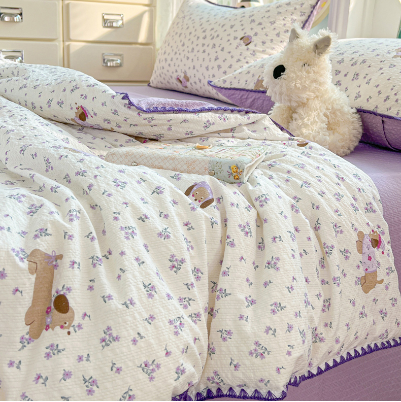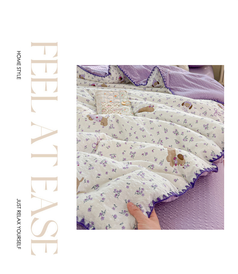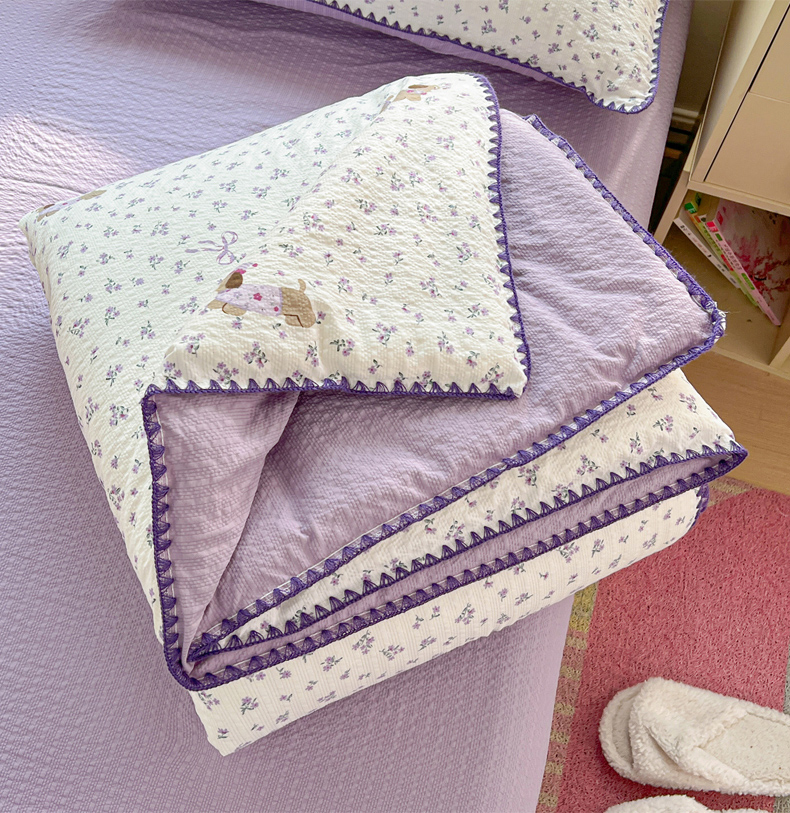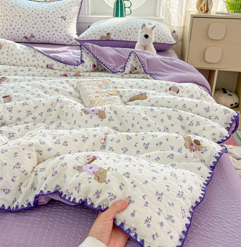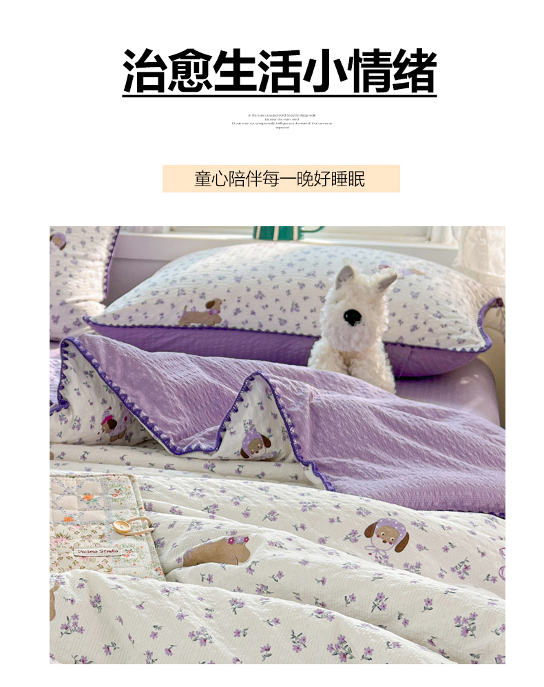 商品名称:恒尚居 2026新款A类泡芙纱贝壳边夏被夏凉被四件套空调被三角针绣边 【紫调小狗】贝壳边