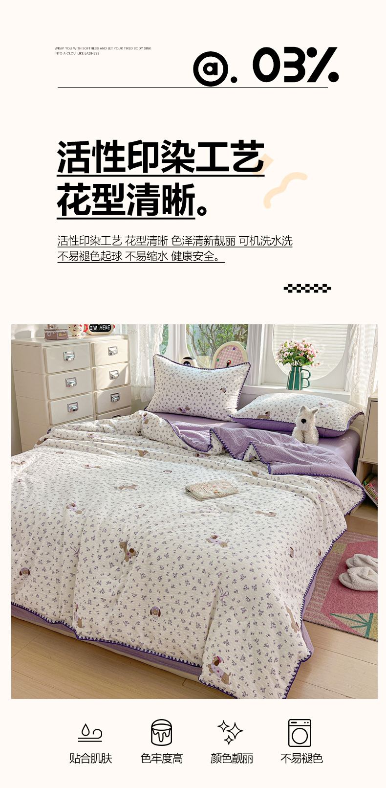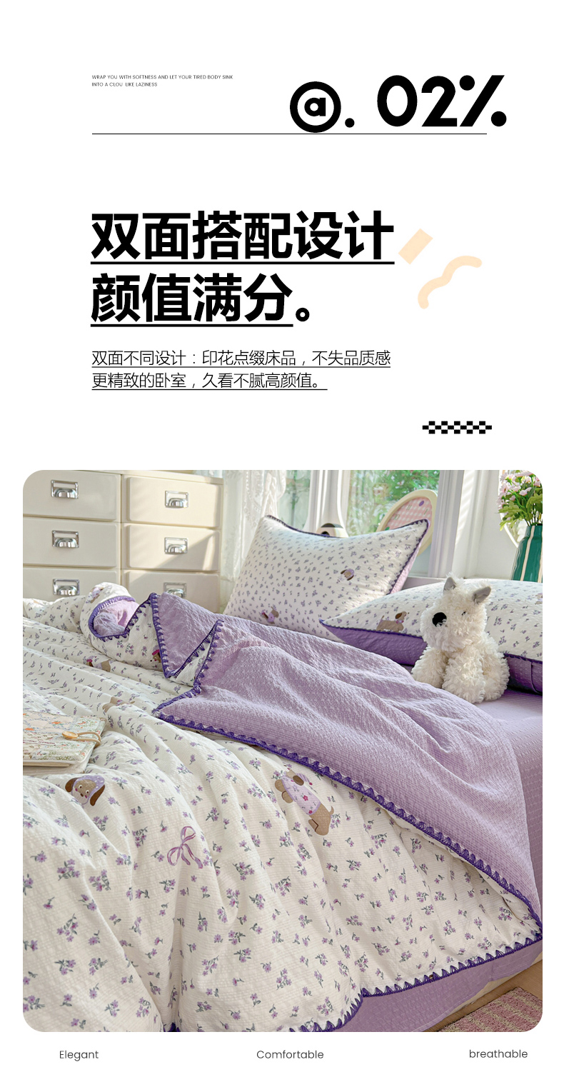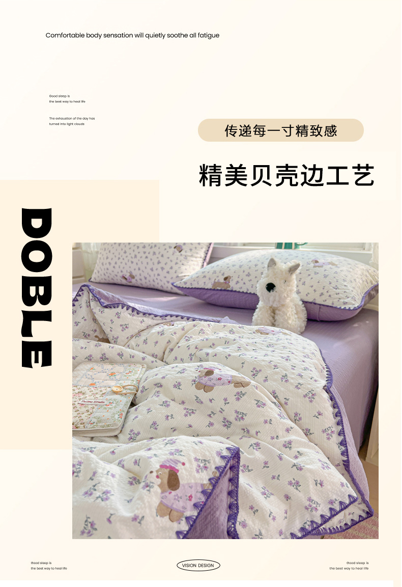 商品名称:恒尚居 2026新款A类泡芙纱贝壳边夏被夏凉被四件套空调被三角针绣边 【紫调小狗】贝壳边