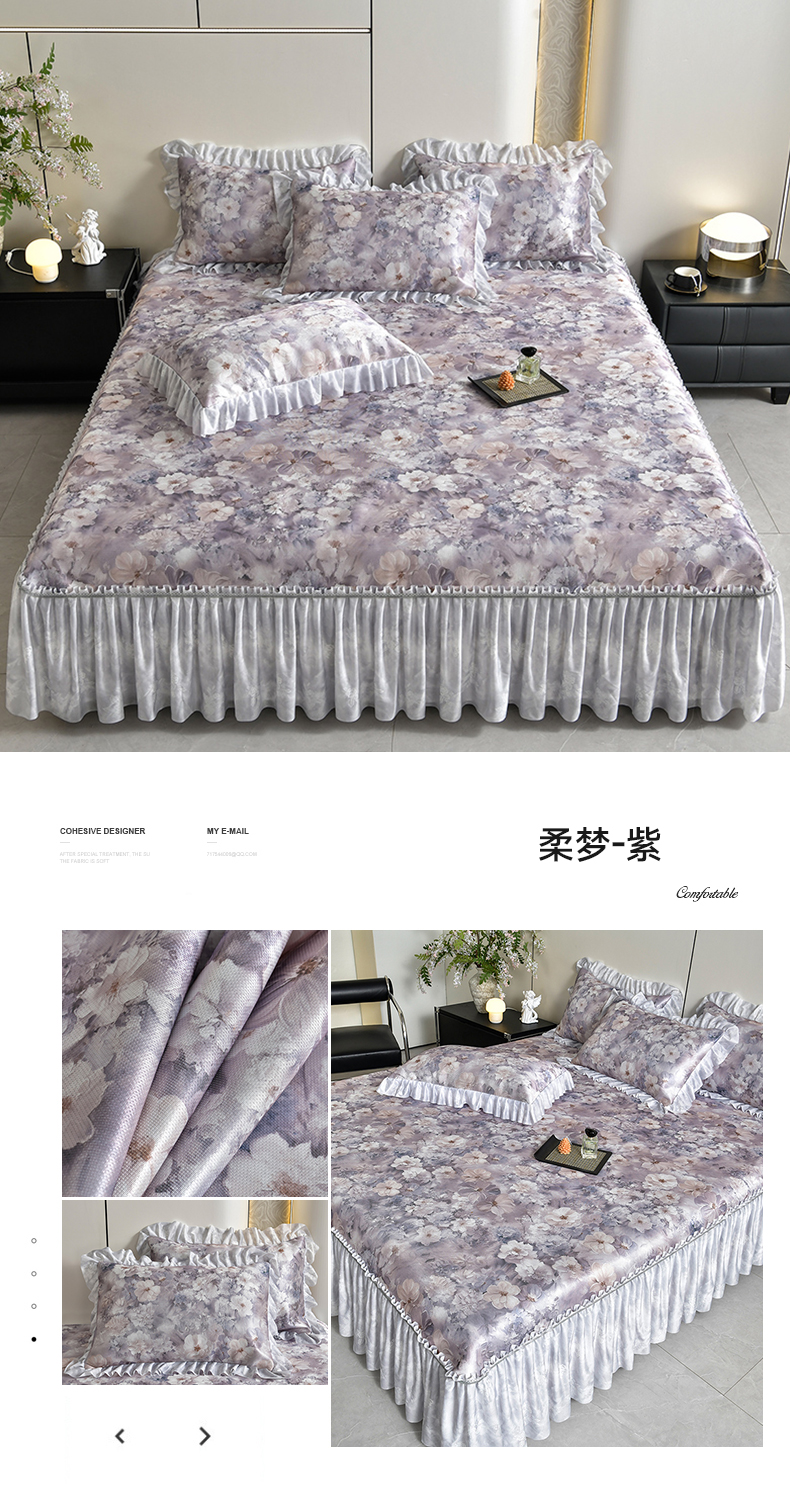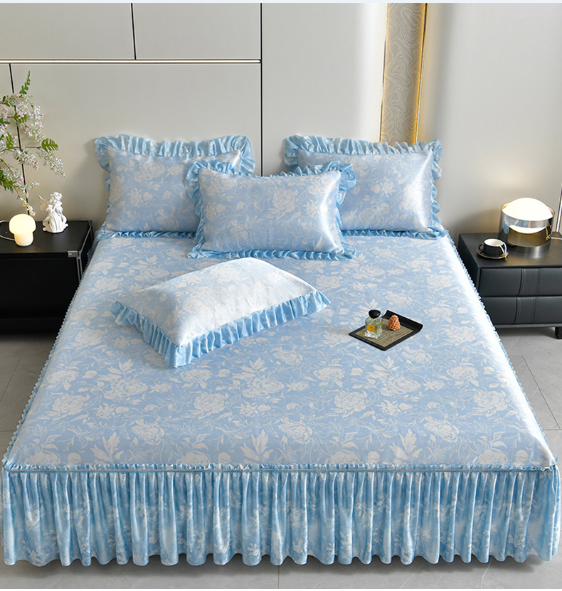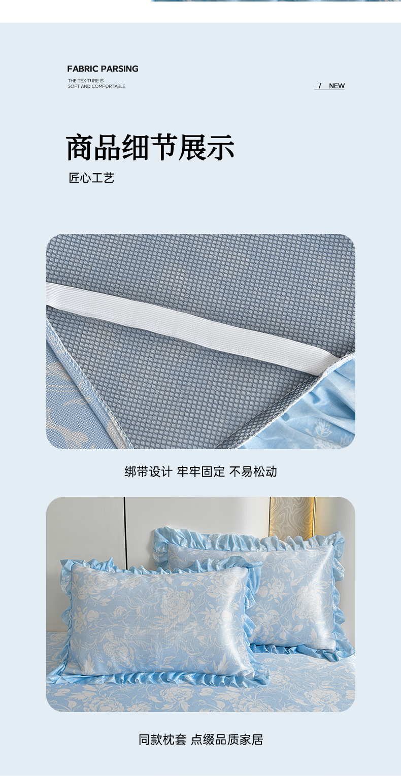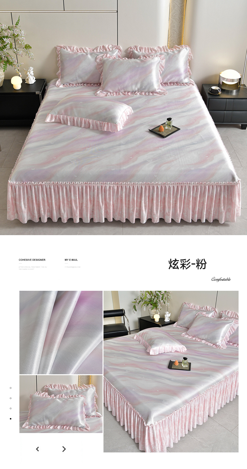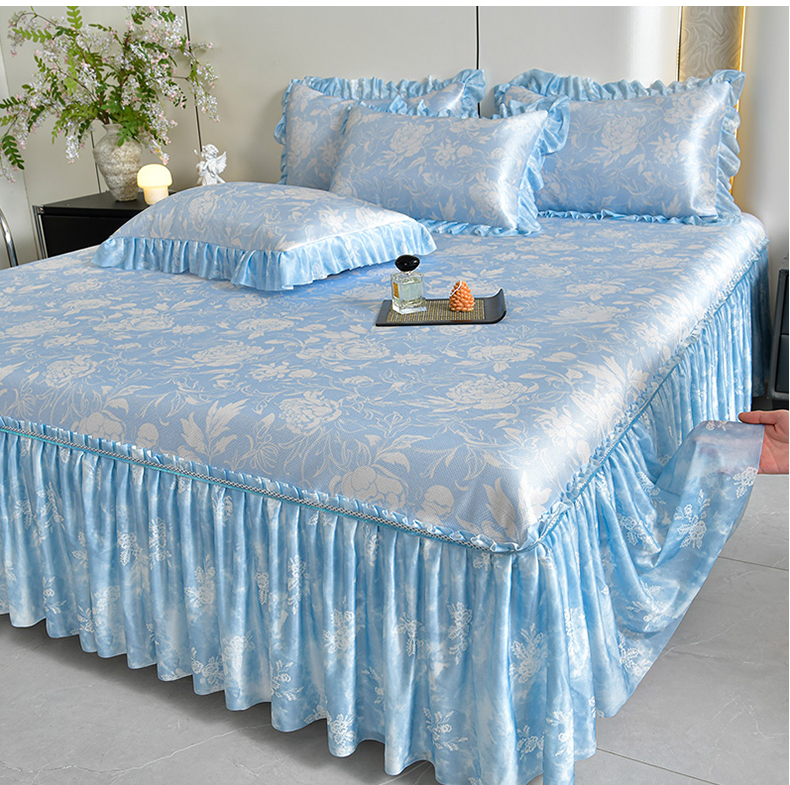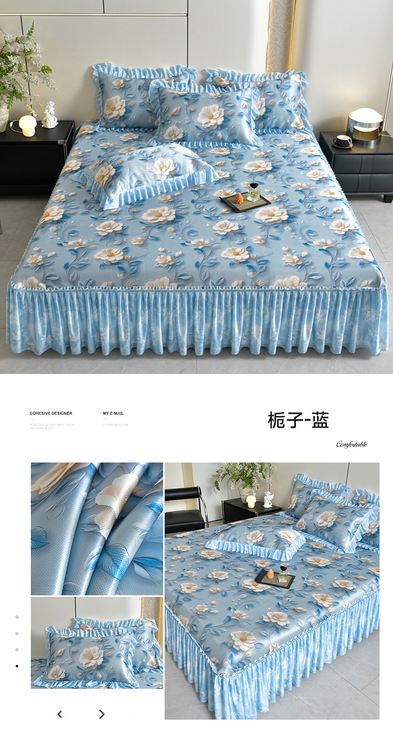 (总)畅畅家纺 2026春夏新款豆豆冰丝印花复合床裙款席子凉席三件套,花颜-蓝,花语-绿,柔梦-绿,柔梦-紫,炫彩-粉,栀子-蓝