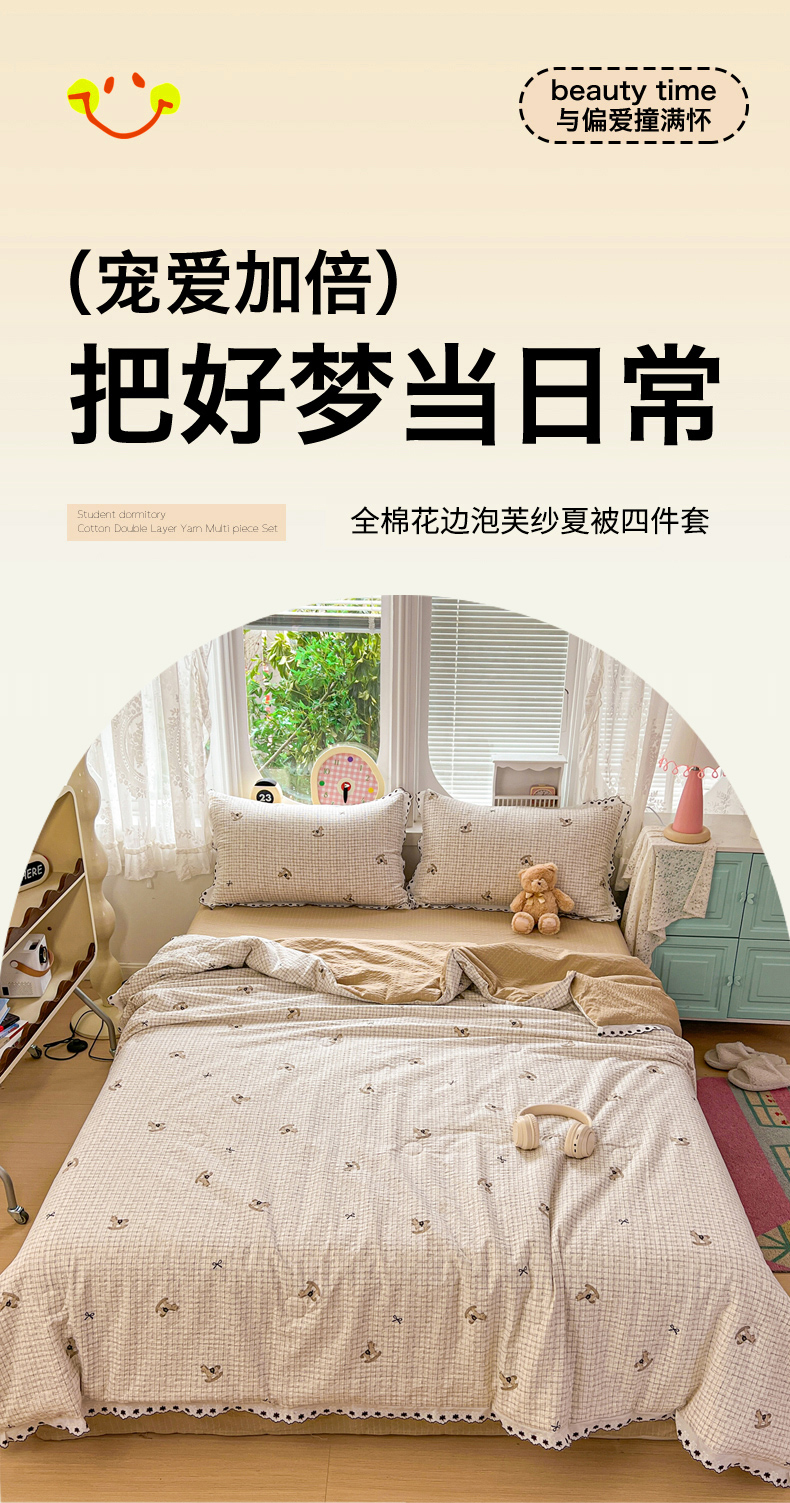 (总)恒尚居 2026新款A类泡芙纱床盖四套件泡芙棉双层纱小花边床垫床褥,波点奶芙小花边,彩虹木马小花边,费尔岛小狗小花边,粉糖泡泡猫小花边,兰格奶狗小花边,奶黄星星人小花边,细格木马小花边,阳光条纹小花边,字母喵喵小花边
