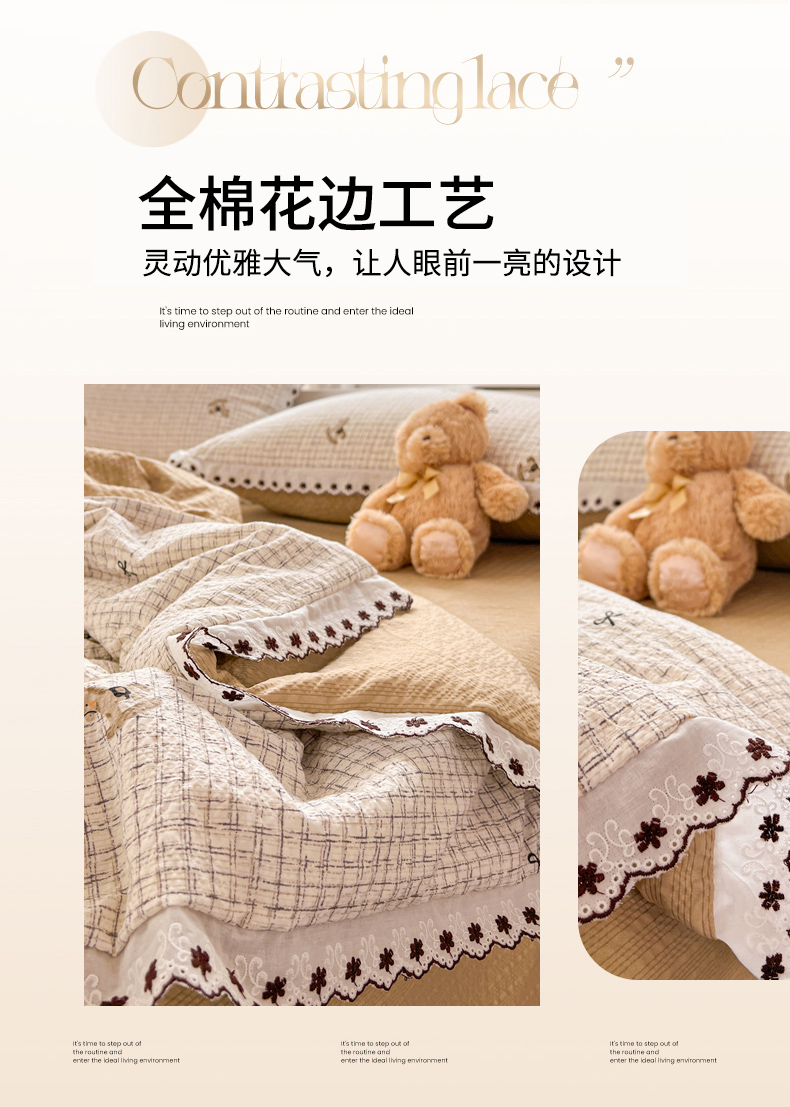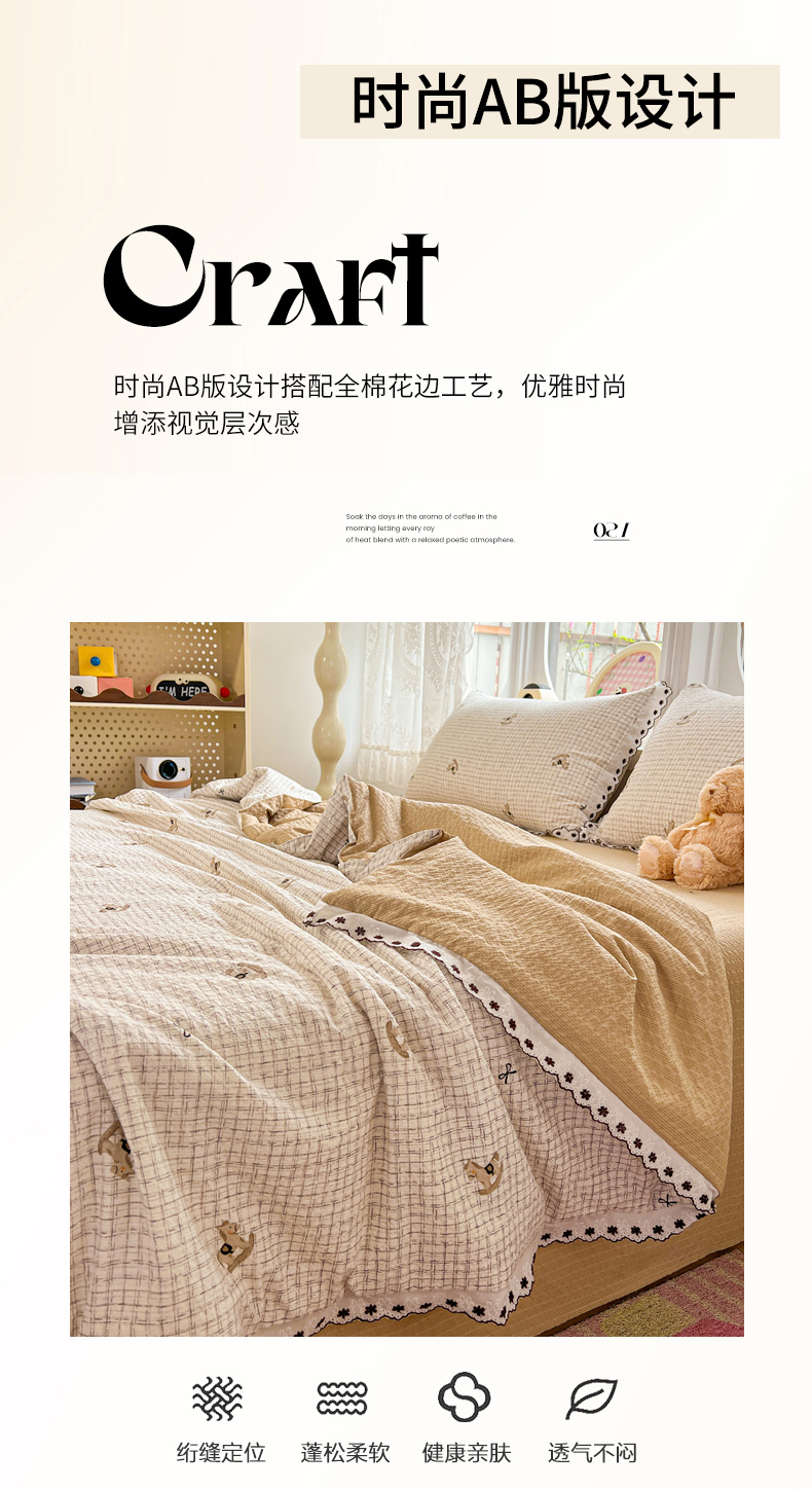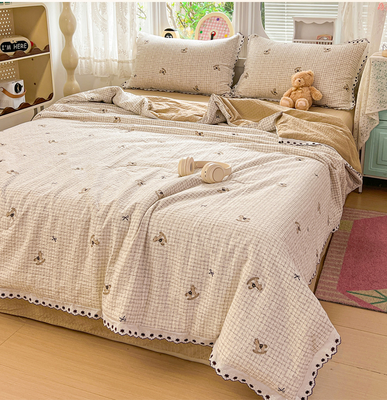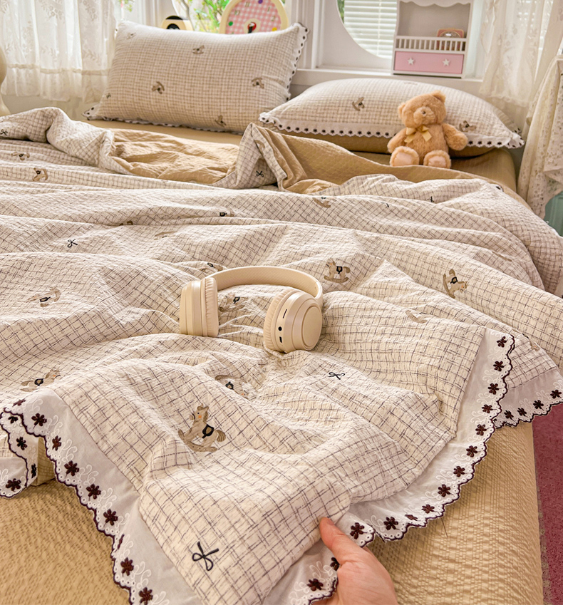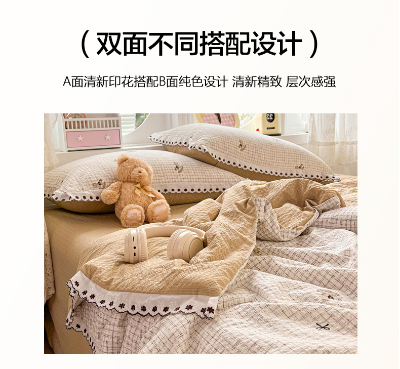 • 91家纺网 家纺一手货源 找家纺 恒尚居 2026新款A类泡芙纱花边夏被夏凉被空调被四套件 【细格木马】全棉花边