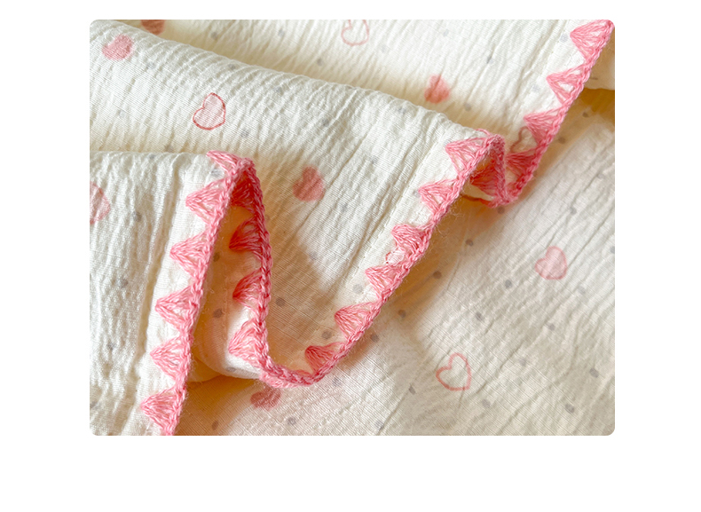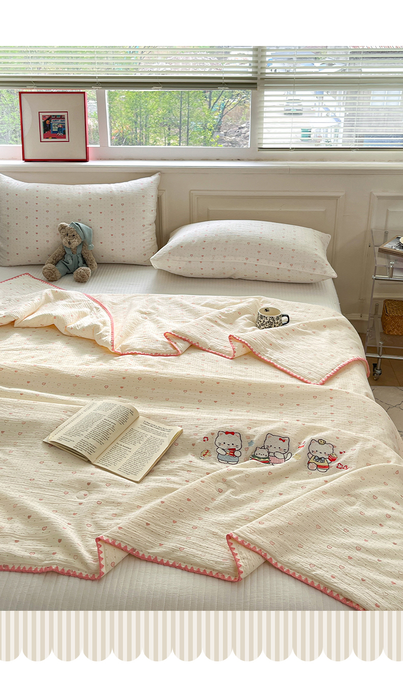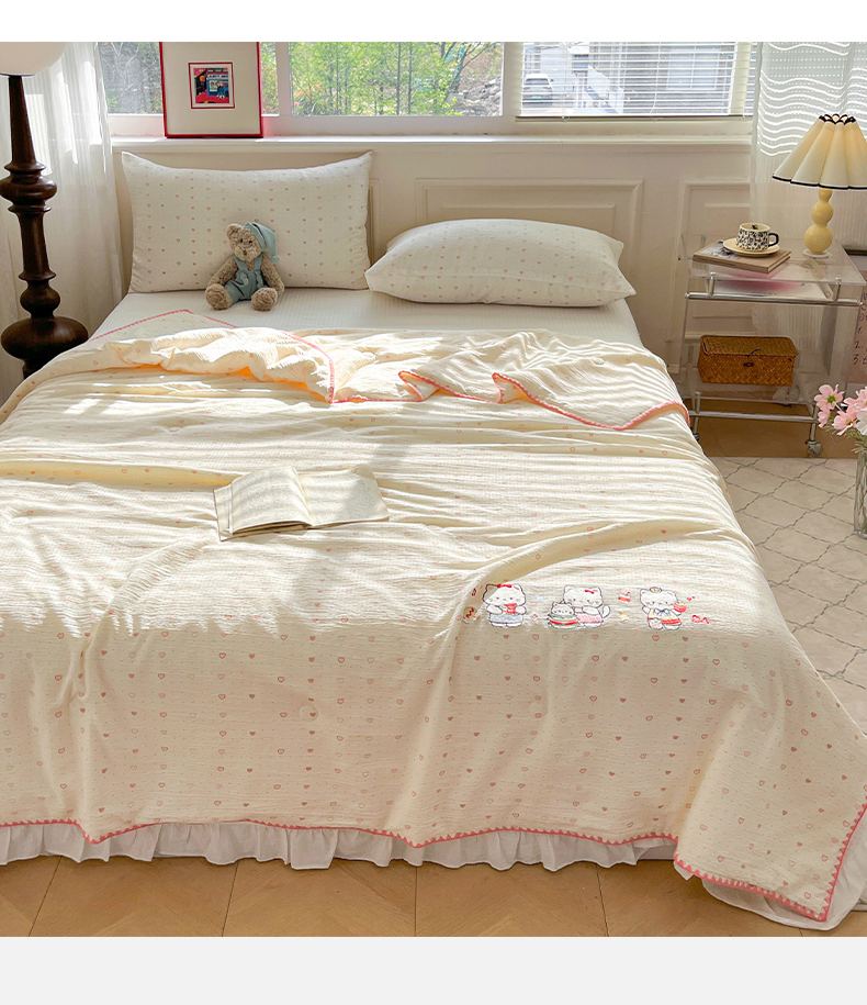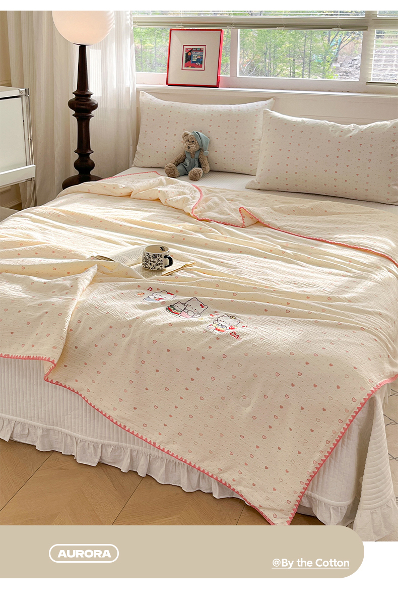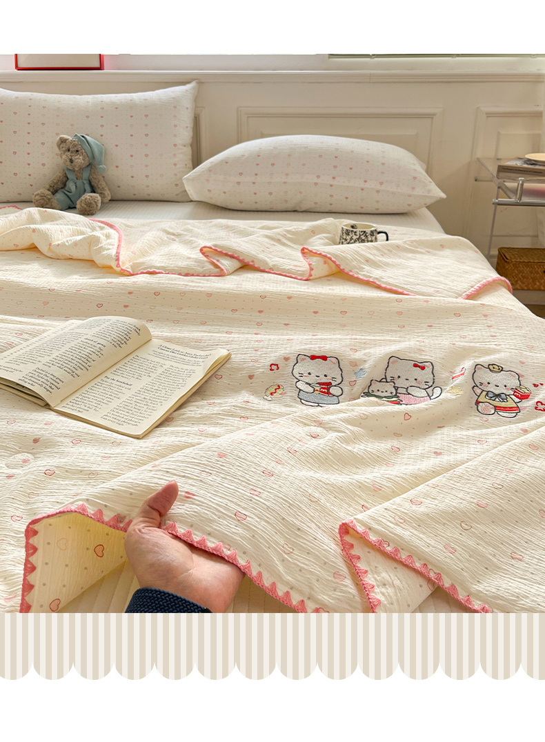 一加一 2026新款皱皱纱绣花三角针大豆夏被夏凉被空调被三件套 爱心猫(粉)