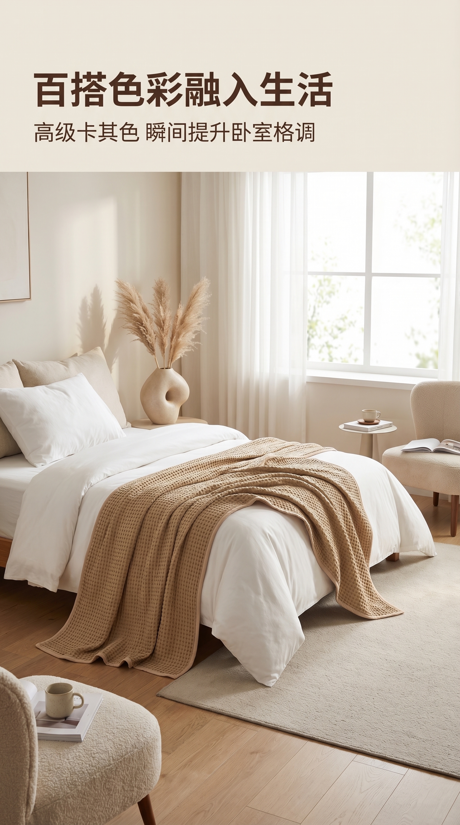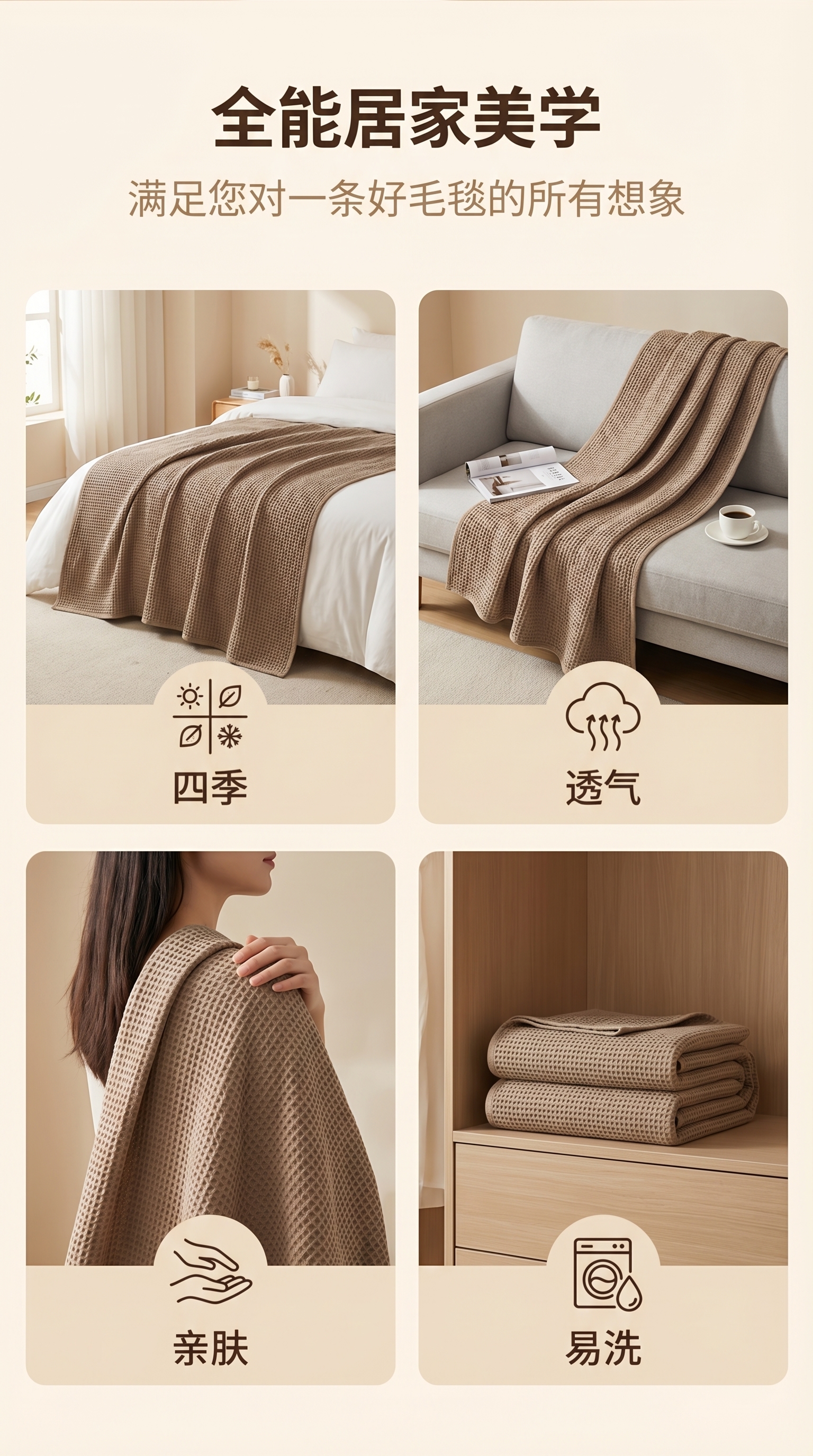 七七家纺 2026新款全棉纯棉华夫格毛毯夏被毯子 松露咖