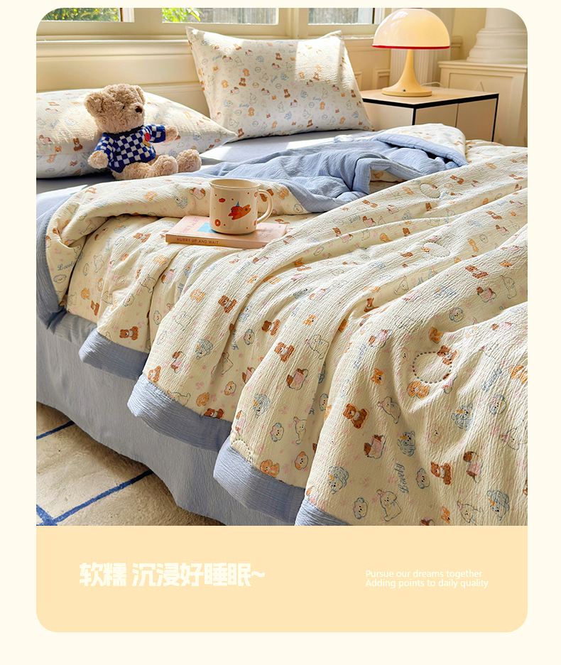(总)几禾 2026新款A类云感双层纱夏被木棉皱皱纱棉花被小清新印花夏被夏凉被费尔岛空调被,奔跑猫,蛋糕派,可可小狗,蓝枝,猫趣,抹茶小猫,嫩芽,泡芙狗,软萌狗,狮子派对,兔子乐队,顽皮熊粉,顽皮熊蓝,挽歌,摘星