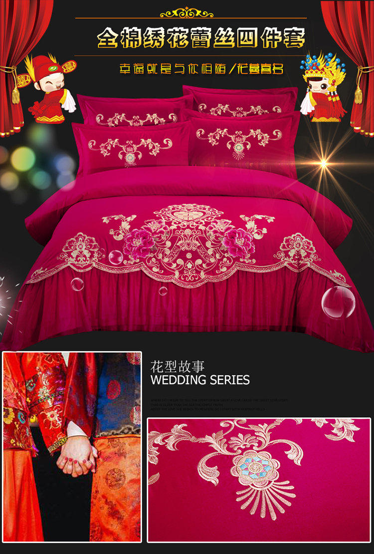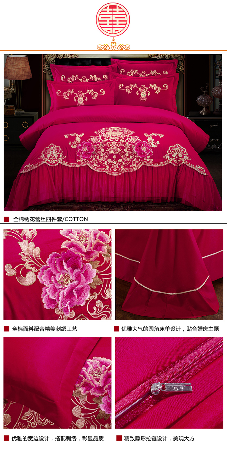 慕她家纺 婚庆四件套大红蕾丝刺绣全棉纯棉花蔓喜多砖红
