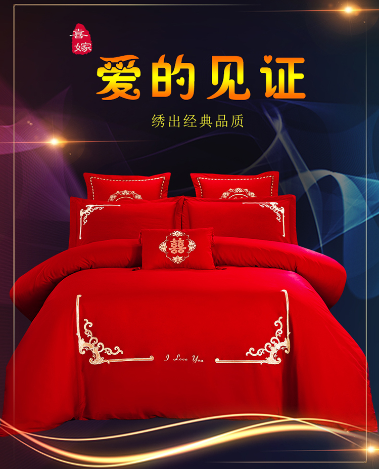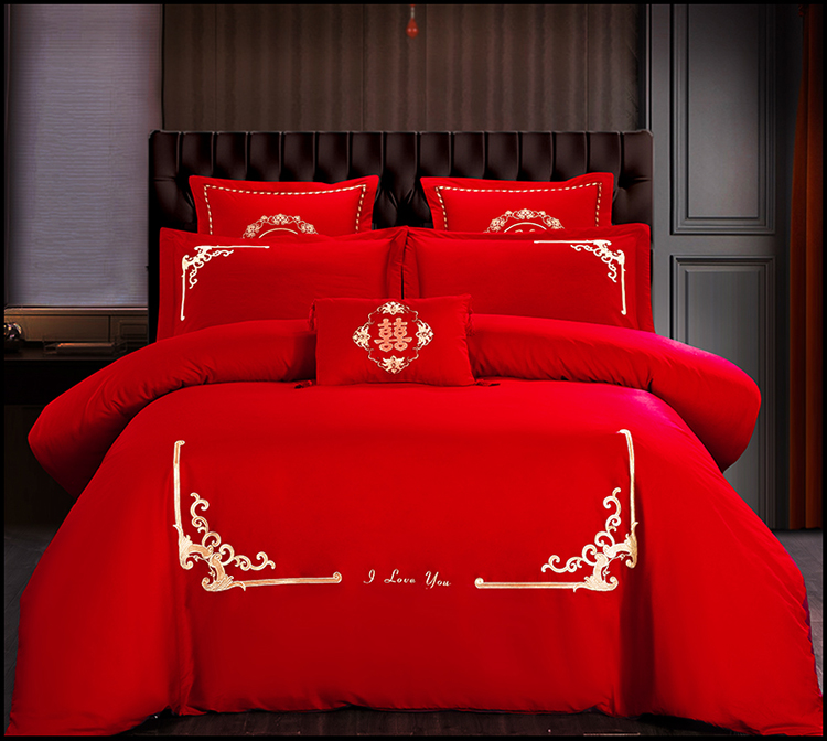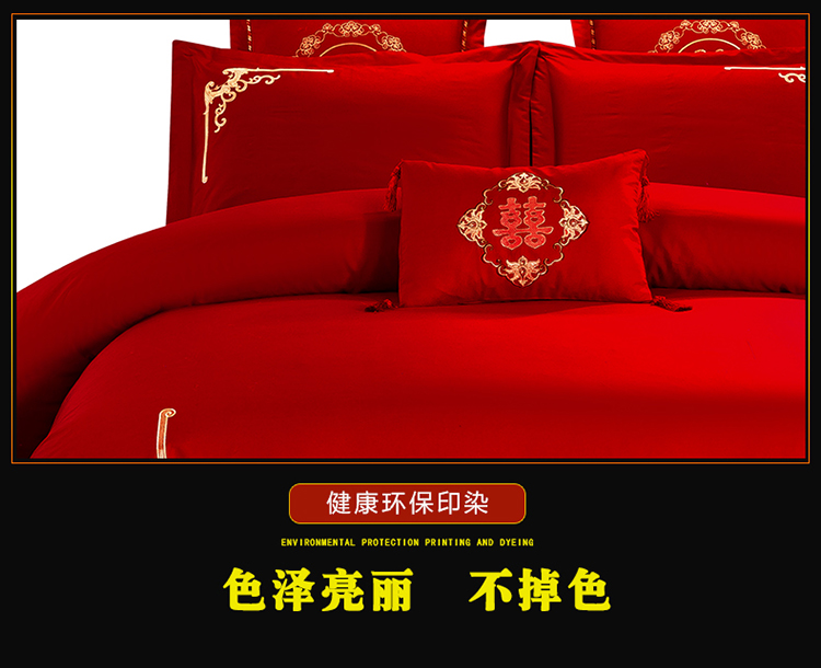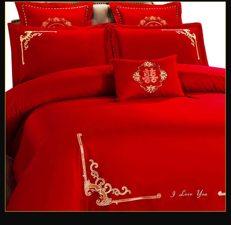 慕她家纺 简约婚庆四件套大红色刺绣全棉纯棉六多件套爱的见证