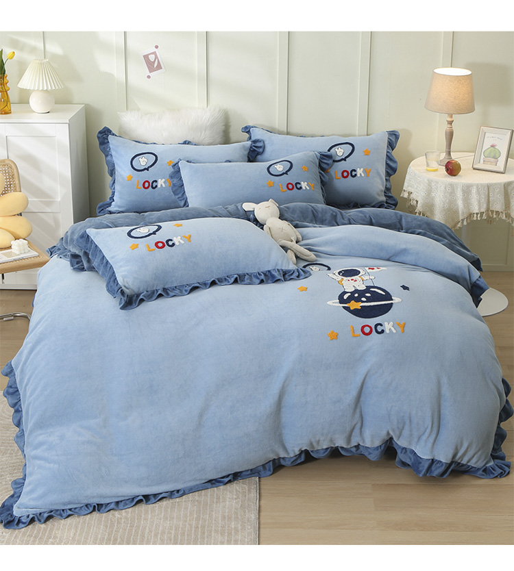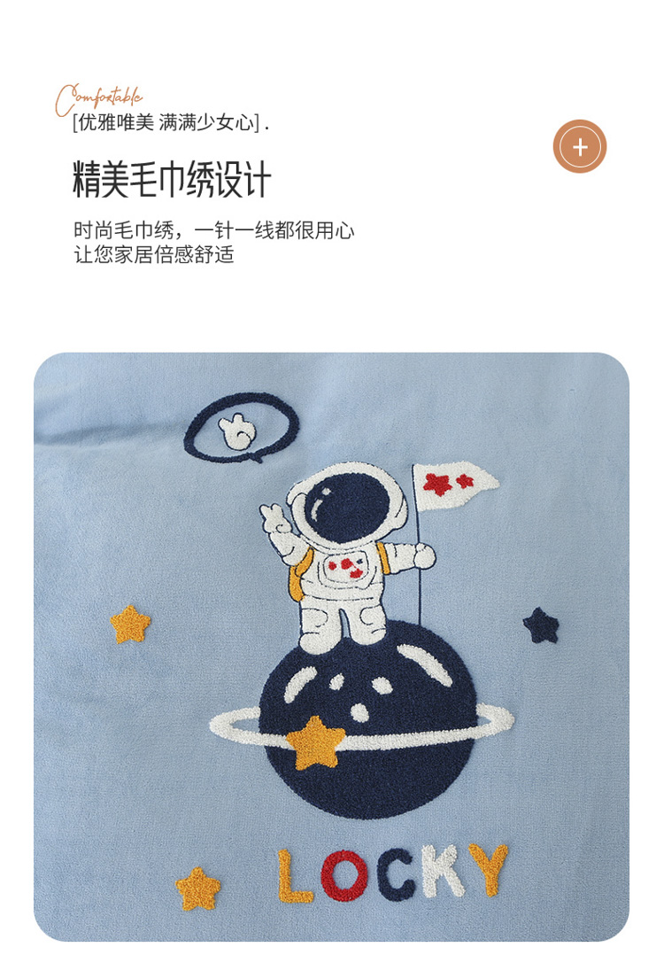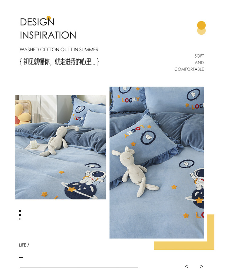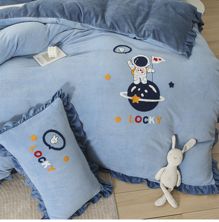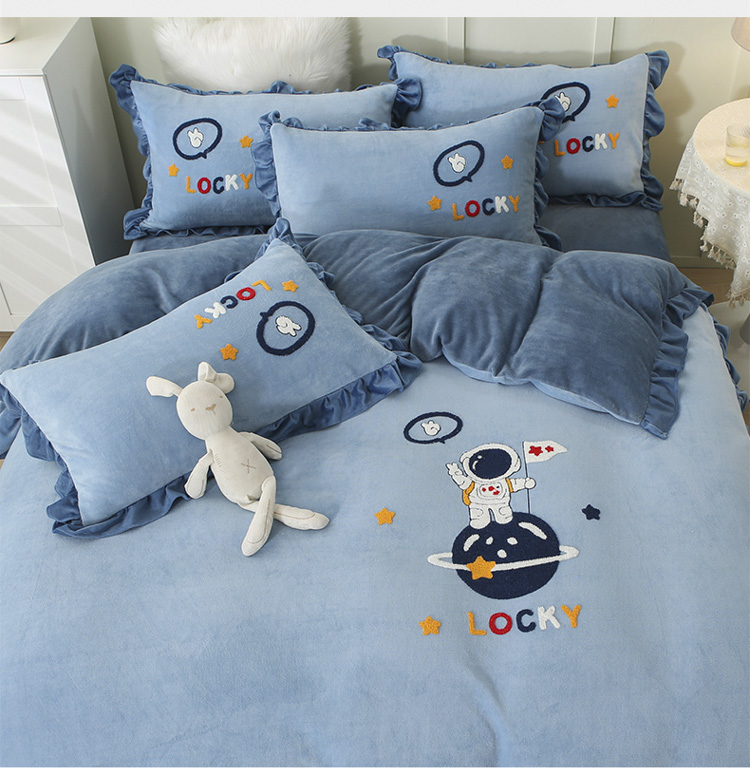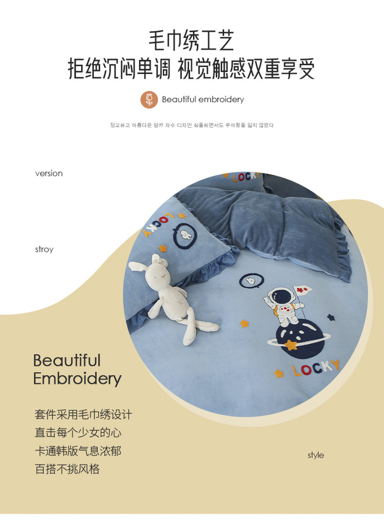 沐辰 2021新款韩版毛巾绣加厚牛奶绒四件套 太空人-蓝