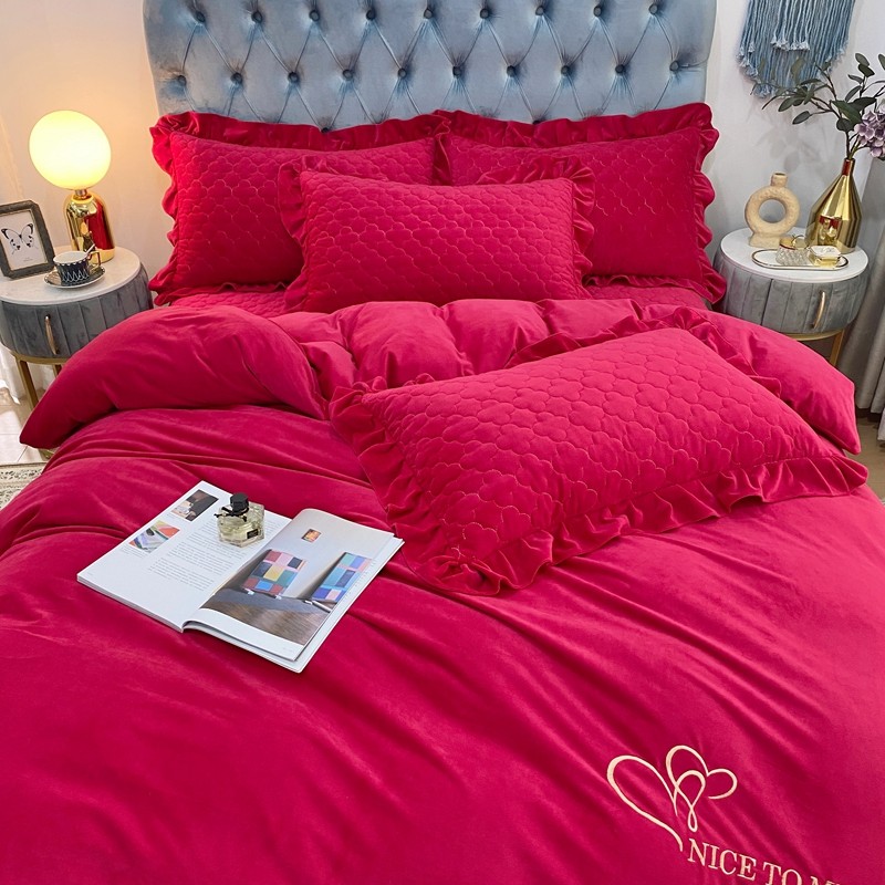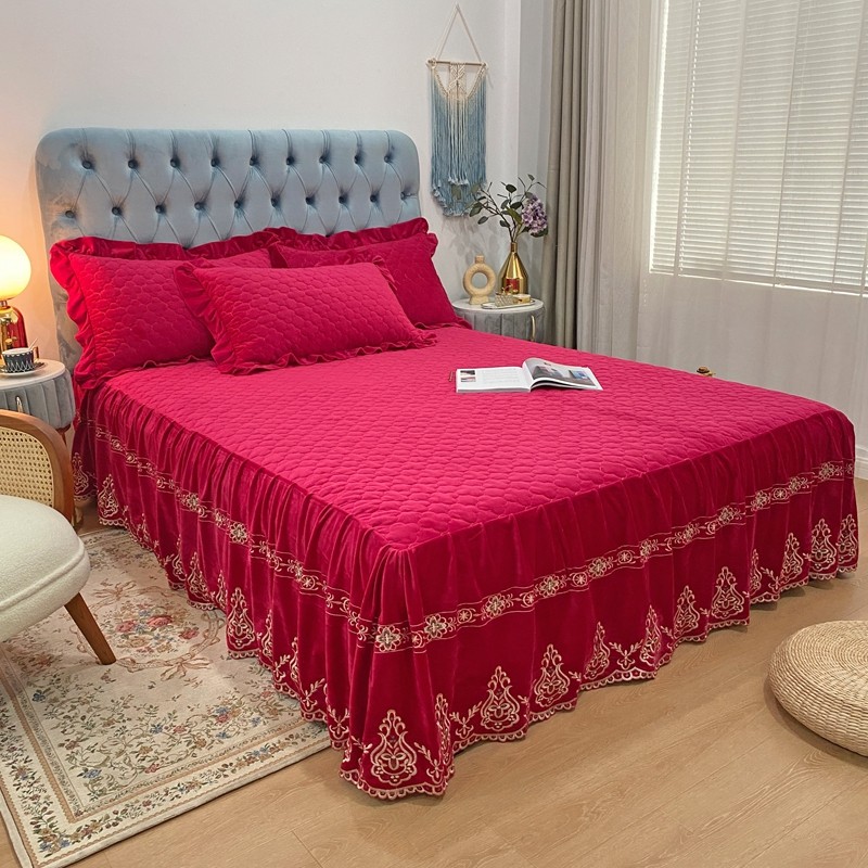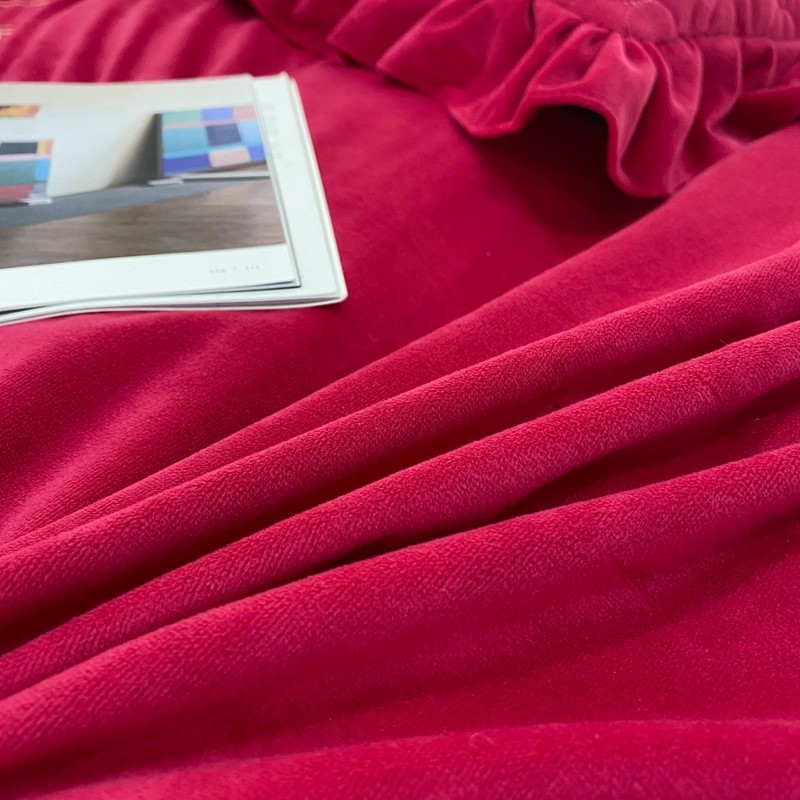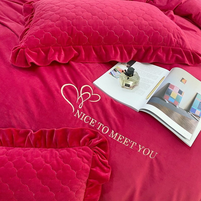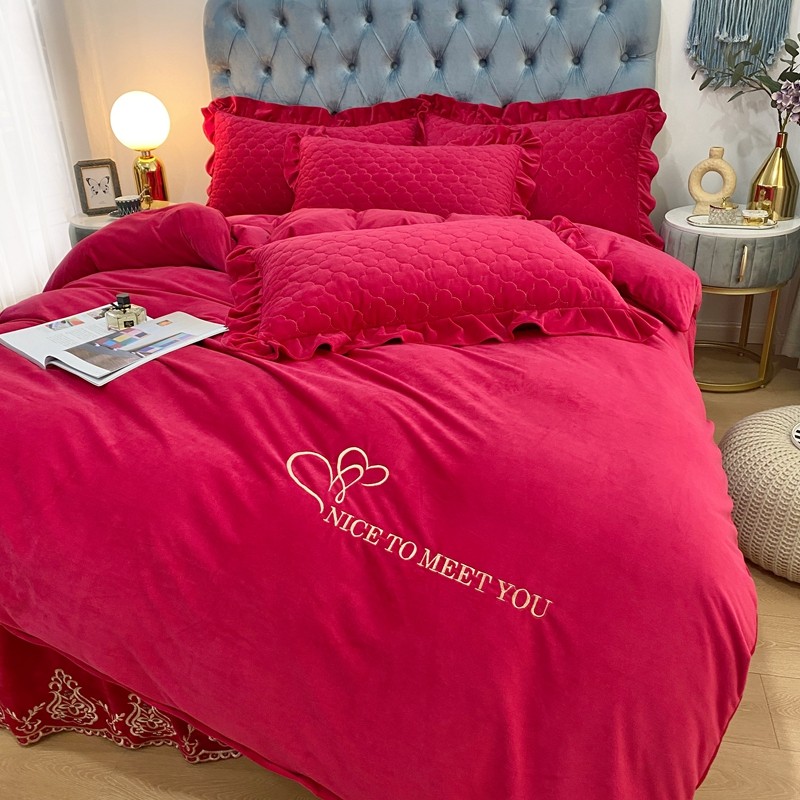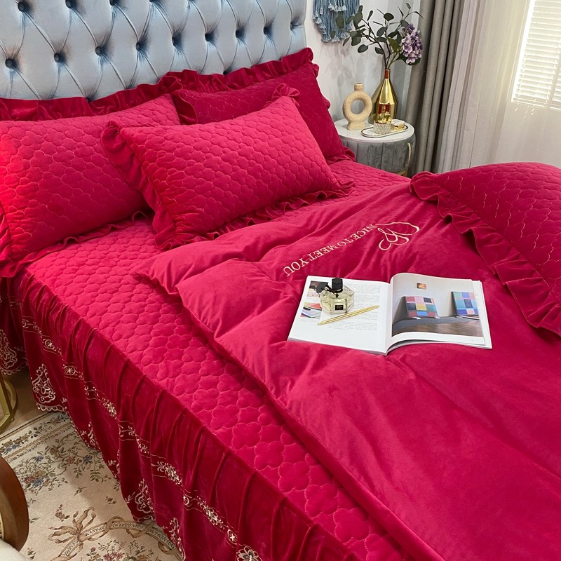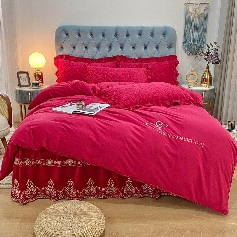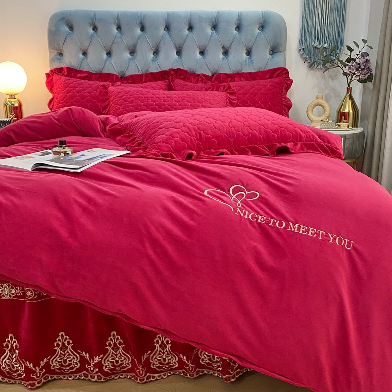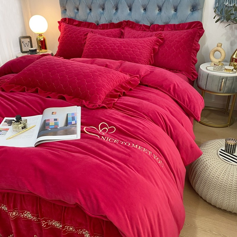 星尚 2021新款秋冬高定婴儿绒夹棉绣花床裙四件套 酒红