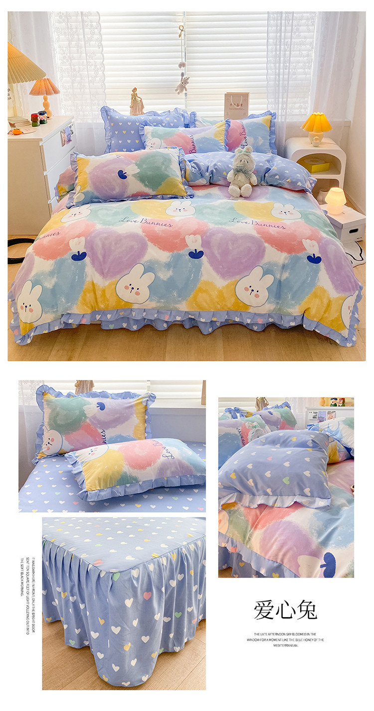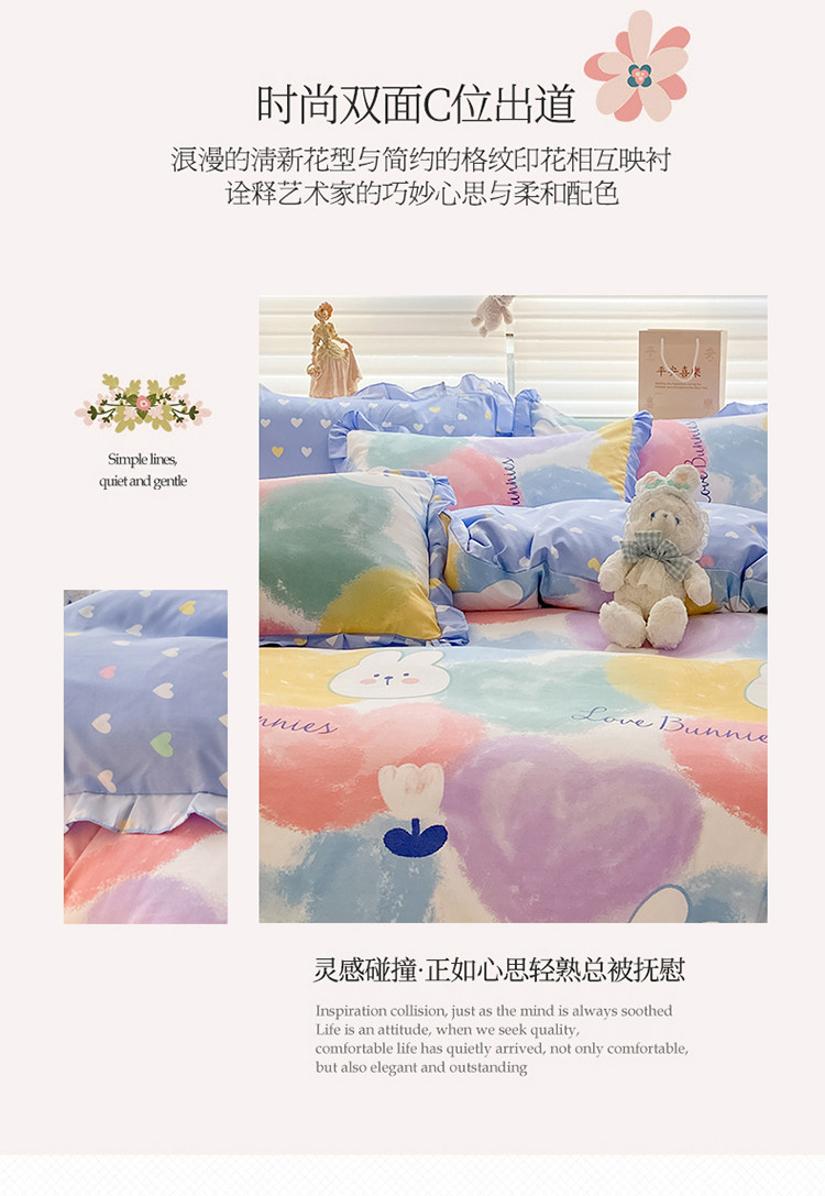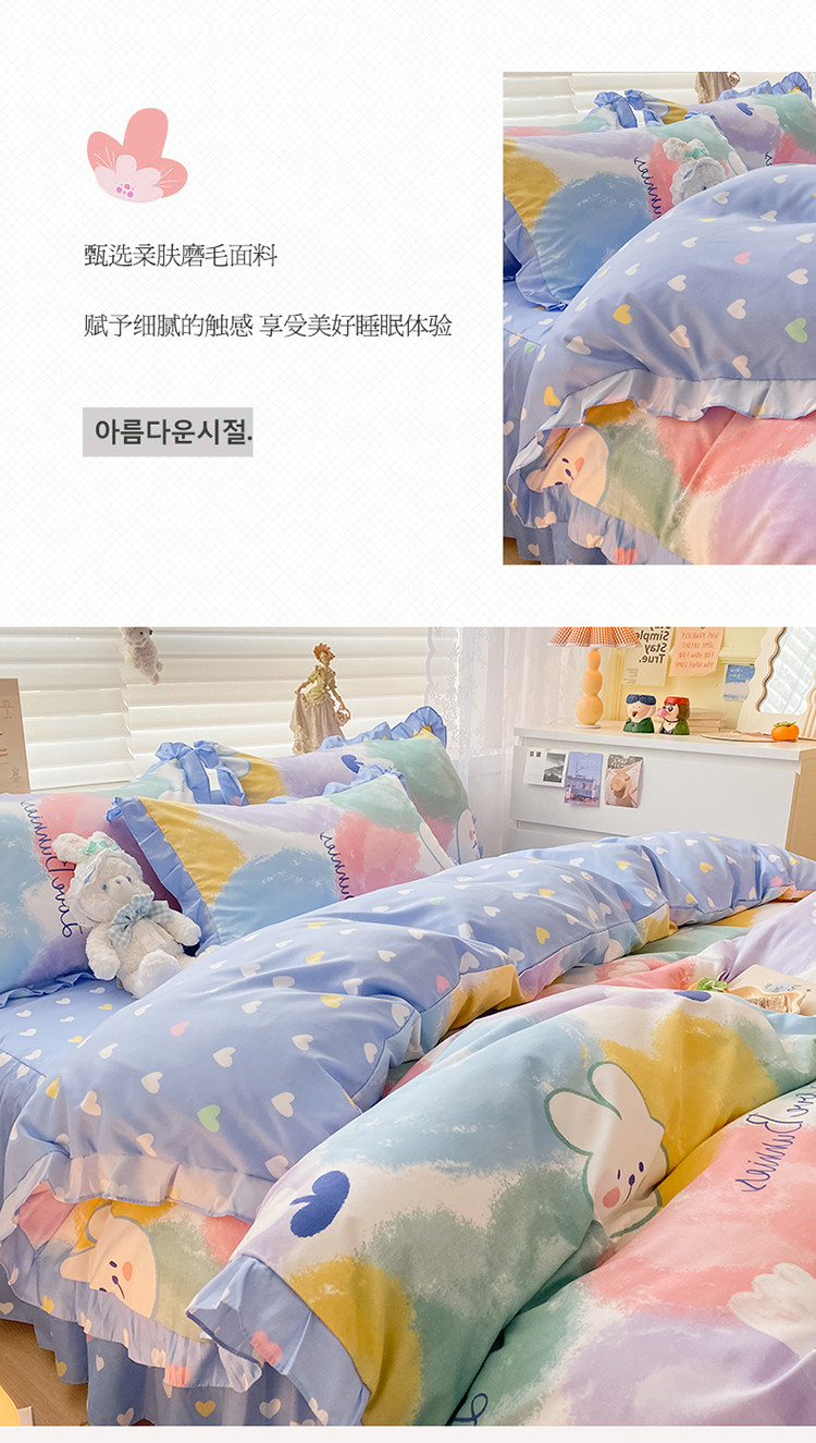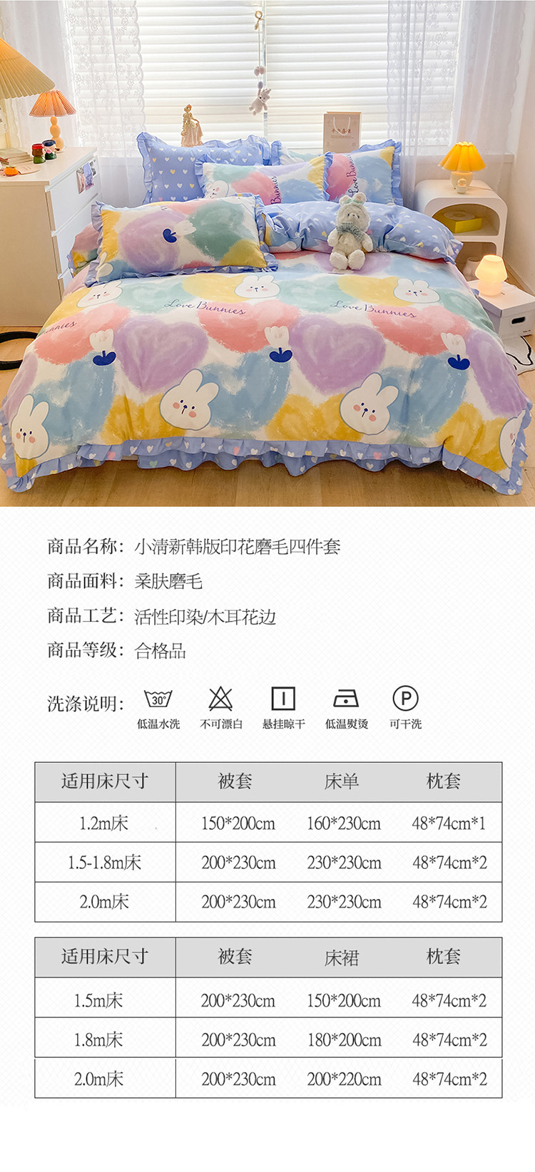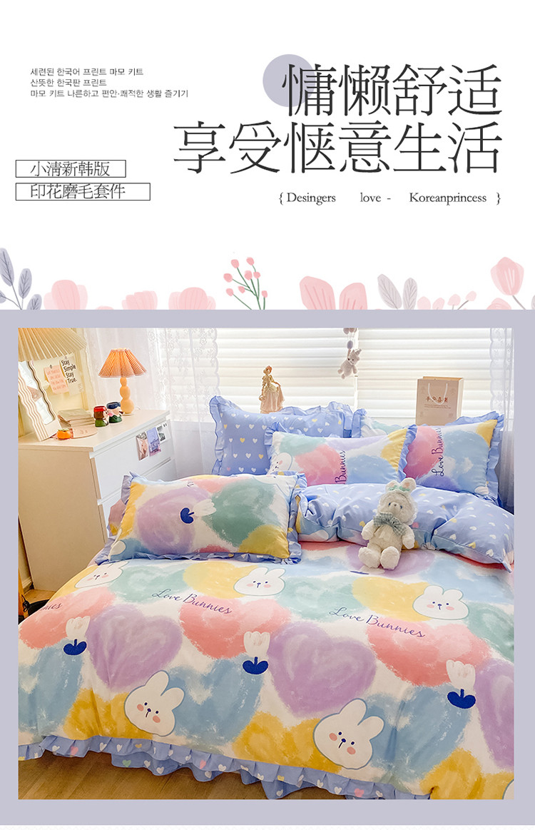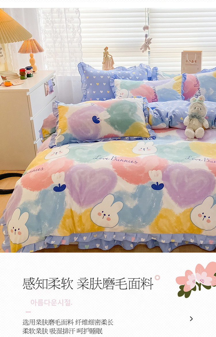 当前位置: 91家纺网 > 商品网购 > 床品套件 > 四件套 > 上尚居 2024新款小清新韩版花边磨毛四件套水洗棉爱心兔