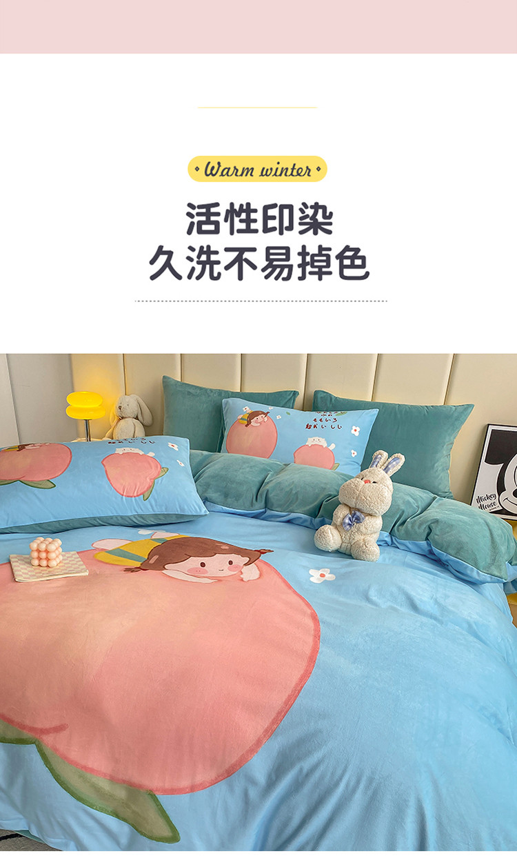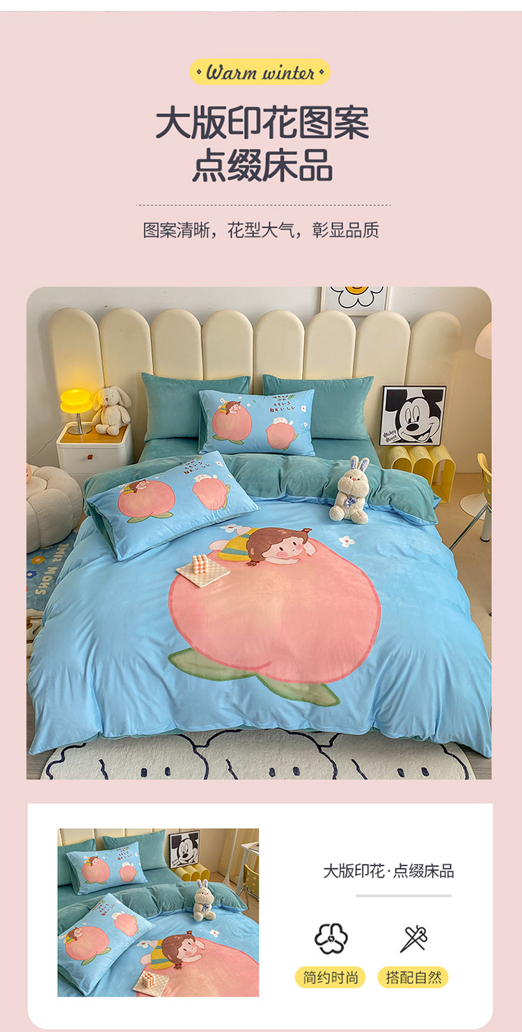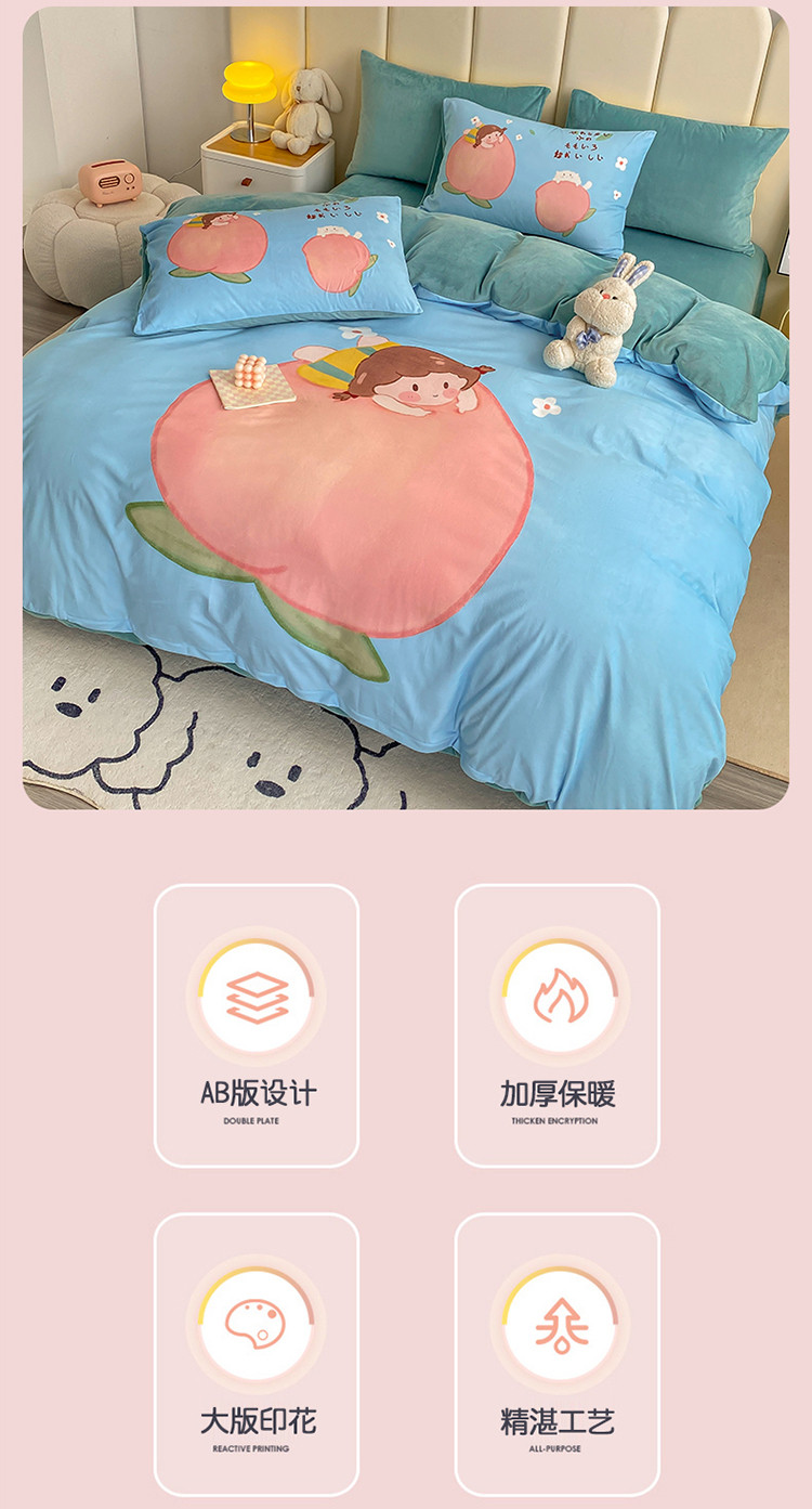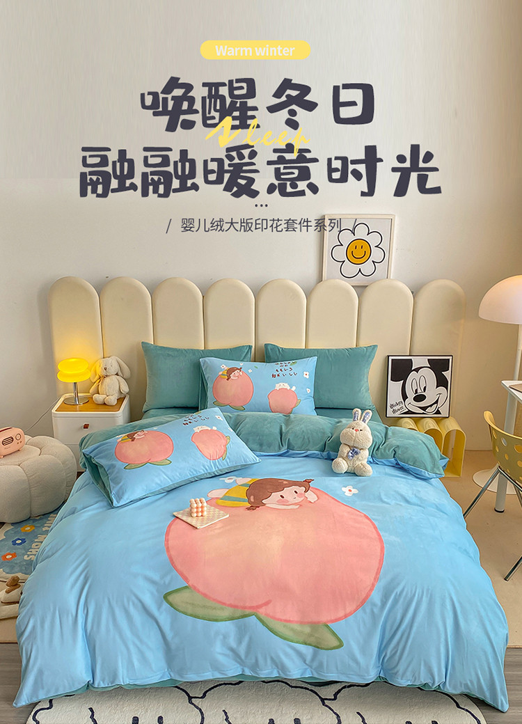 当前位置: 91家纺网 > 商品网购 > 床品套件 > 四件套 > 宝宝绒四件套 > 博雅 2022新款婴儿绒大版印花系列四件套 桃子女孩