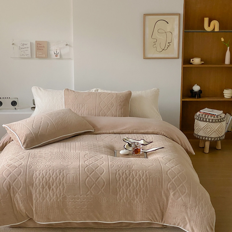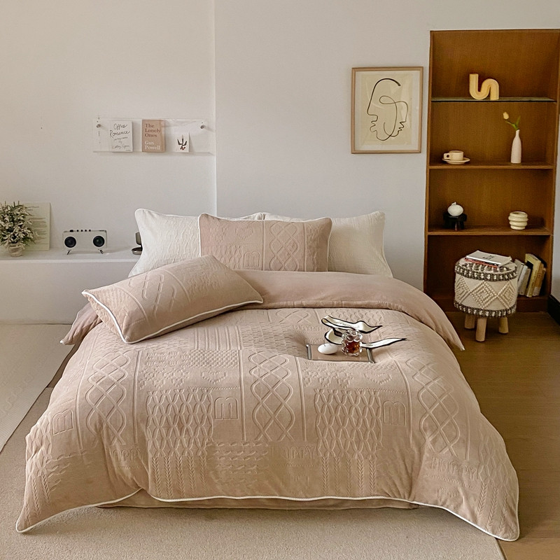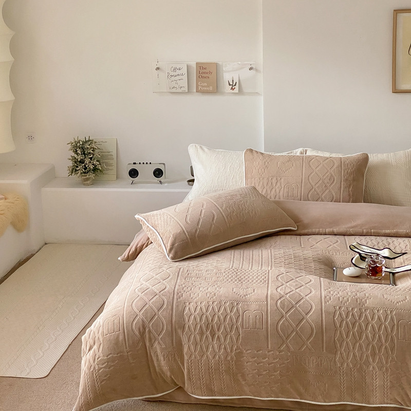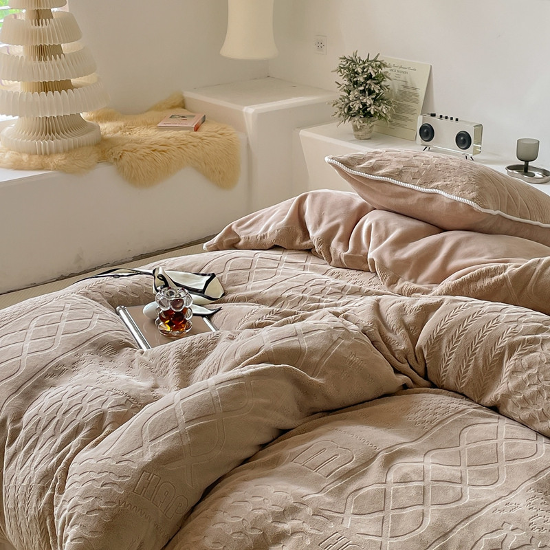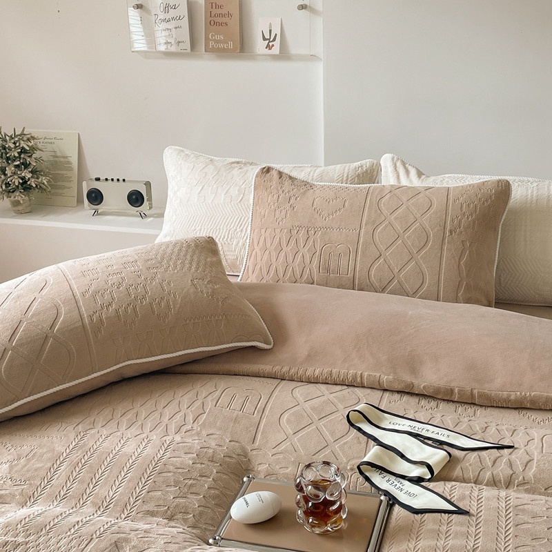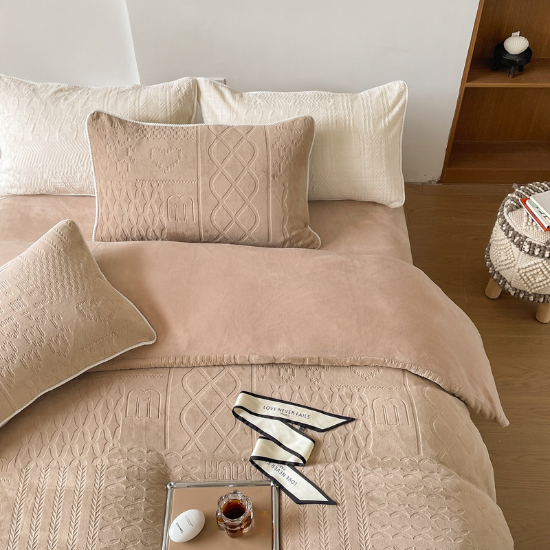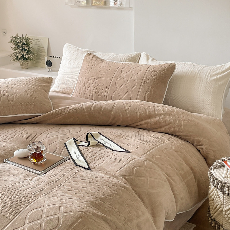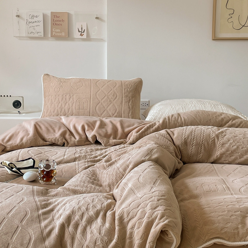 源启生活 2022冬季新品立体雕花牛奶绒嵌绳款四件套 奶咖