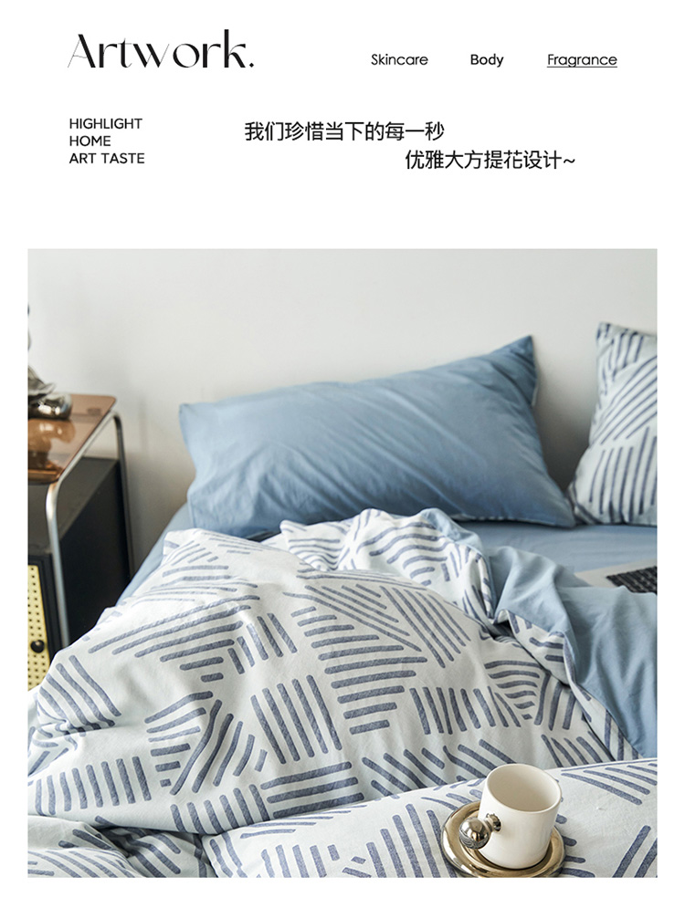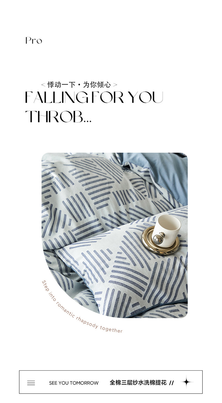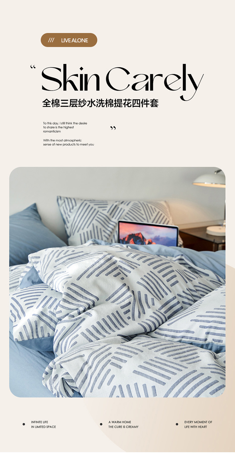 雅居纺 2023新款全棉三层纱提花四件套 简格-蓝