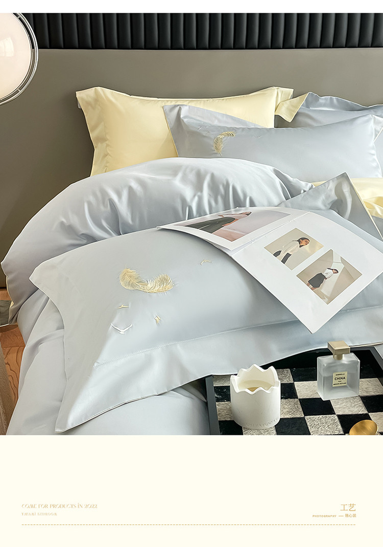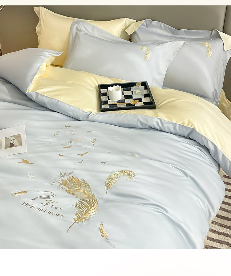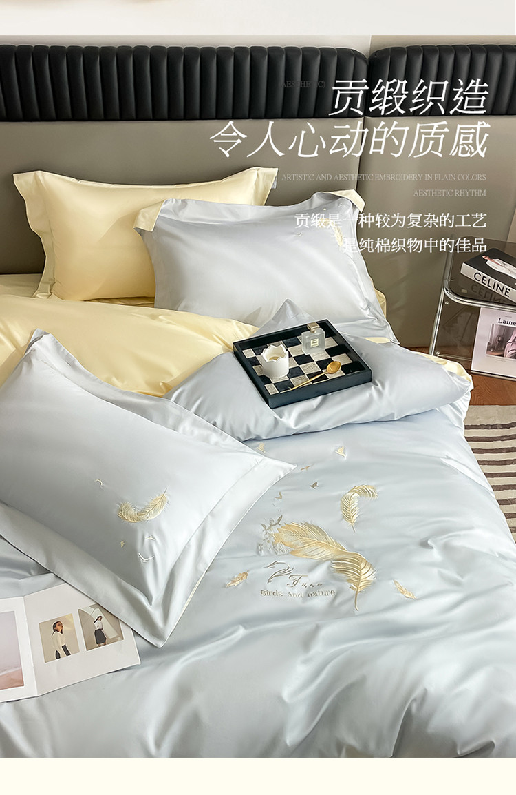 商品名称:蓝米卡夫2024新全棉高级感长绒棉刺绣四件套兰羽系列 兰羽-海澜奶黄