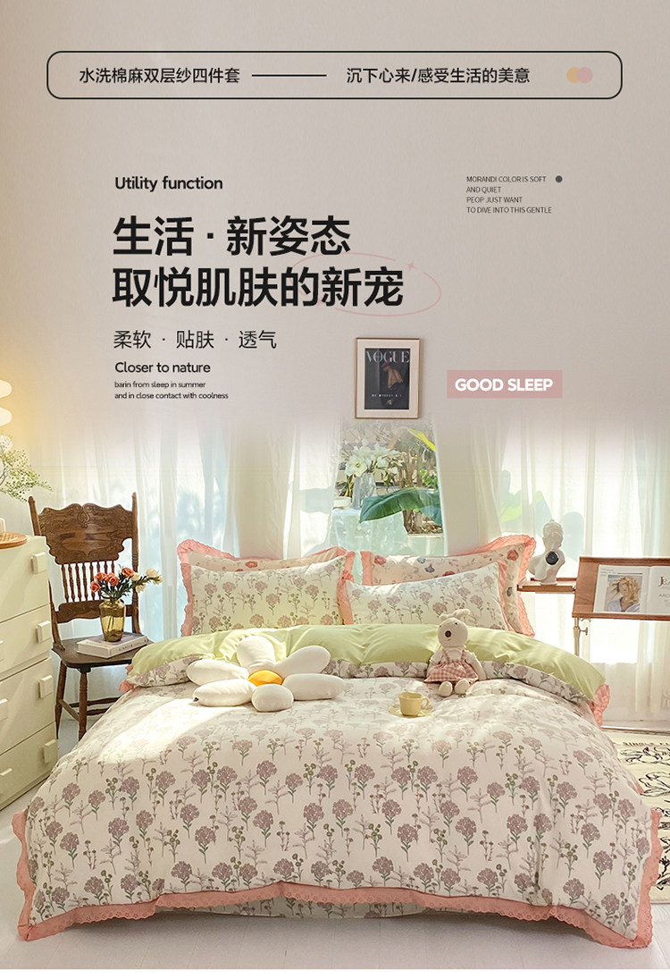 商品名称:艾米 2023新款水洗棉麻双层纱系列四件套 薰衣草豆沙