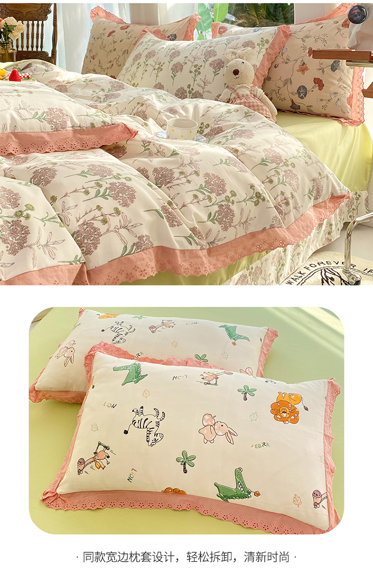 总艾米家居2025新款水洗真丝雪纺花边贴布绣四件套-达菲小熊,白色,薄荷绿,宾利蓝,淡粉,豆沙,鹅黄,灰色,天蓝,香槟,玉色