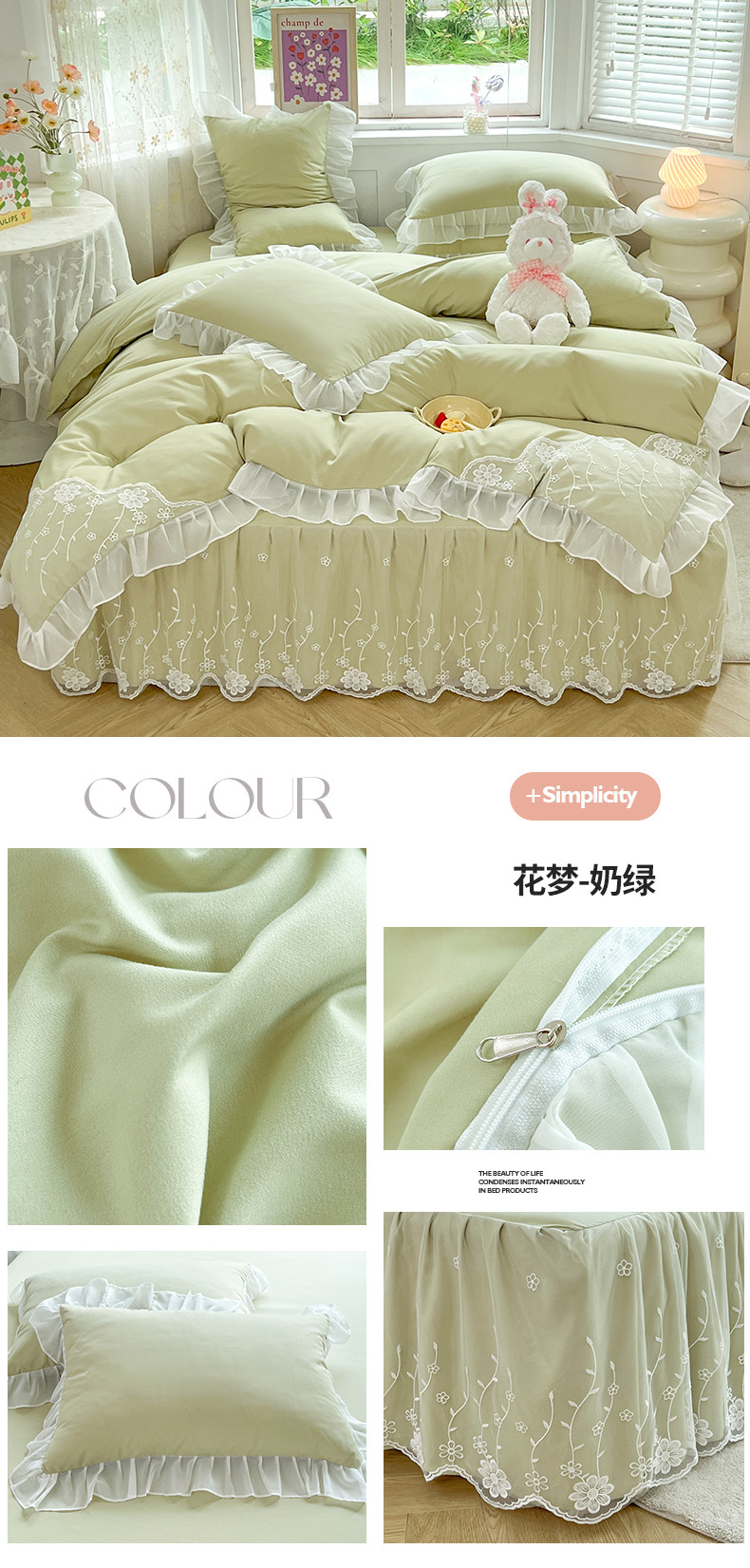 芭比蔓家纺 2025年新款雕花牛奶绒花边四件套-爱丽丝 爱丽丝-绿,爱丽丝-绿