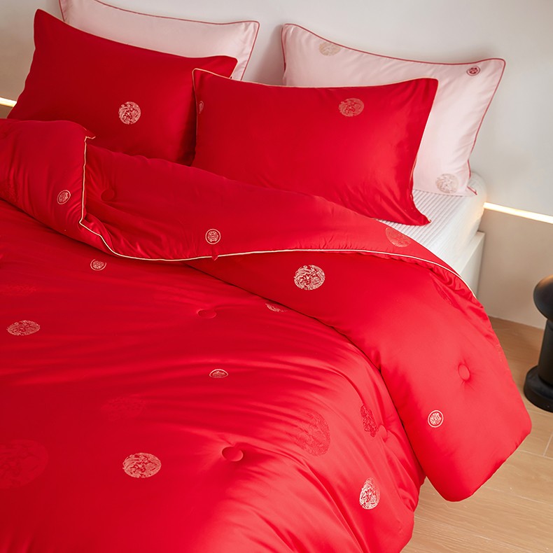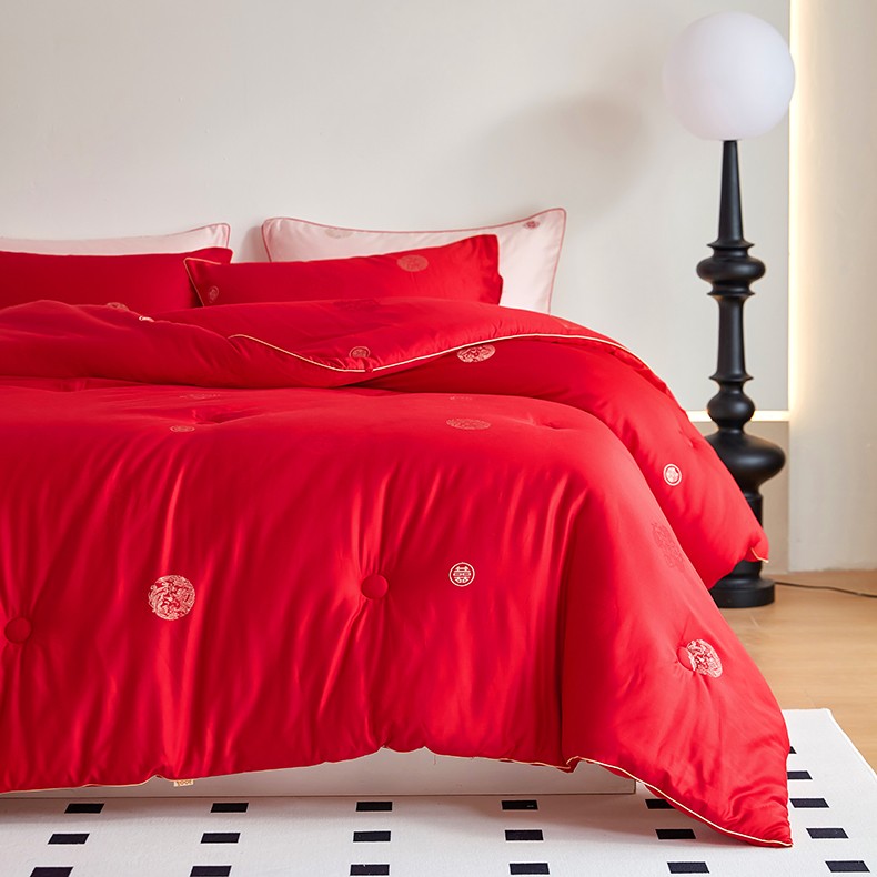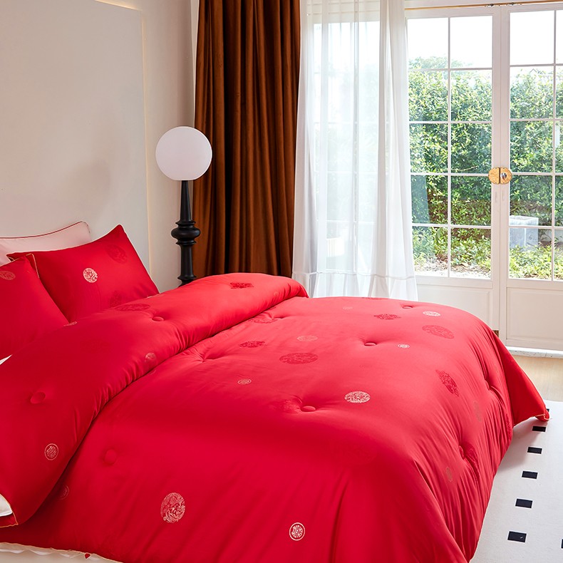 新款 100支天丝棉大提花蚕丝大豆被婚庆结婚喜庆大红秋冬被芯婚庆被 百年好合红色