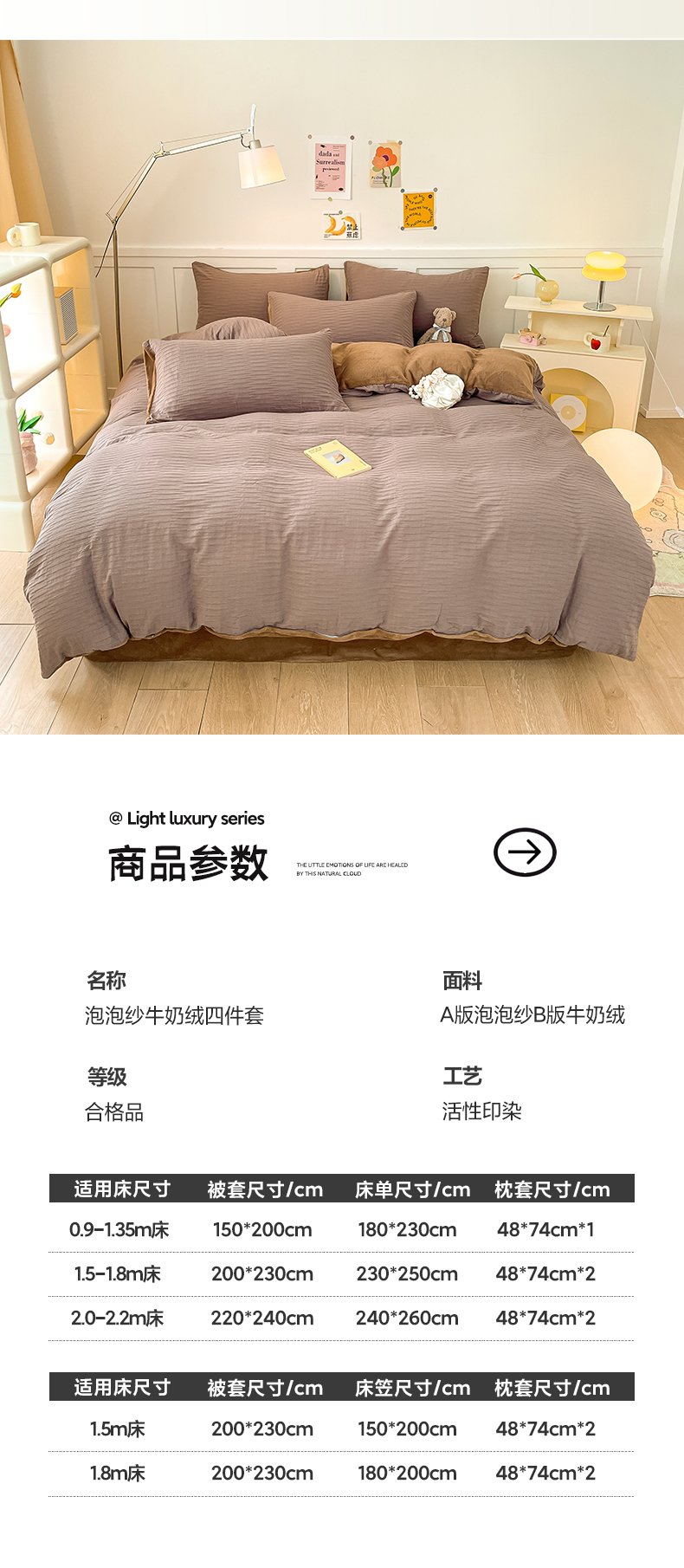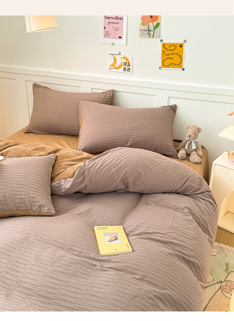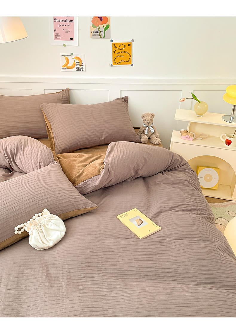 商品名称:雅居纺家纺 2023新款全棉泡泡纱牛奶绒四件套 泡泡纱+绒-魔幻咖