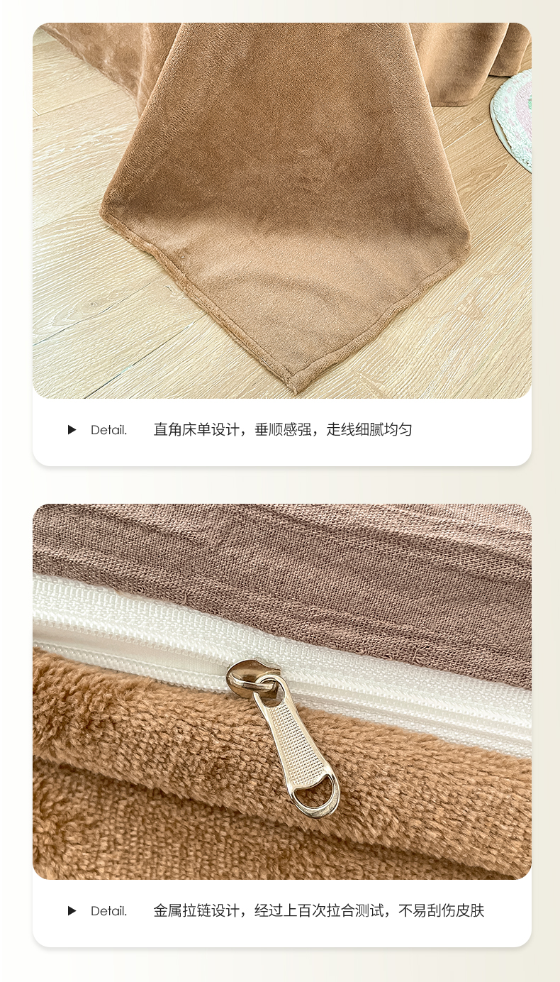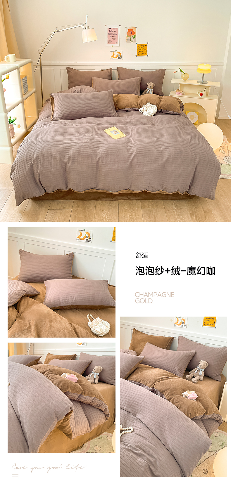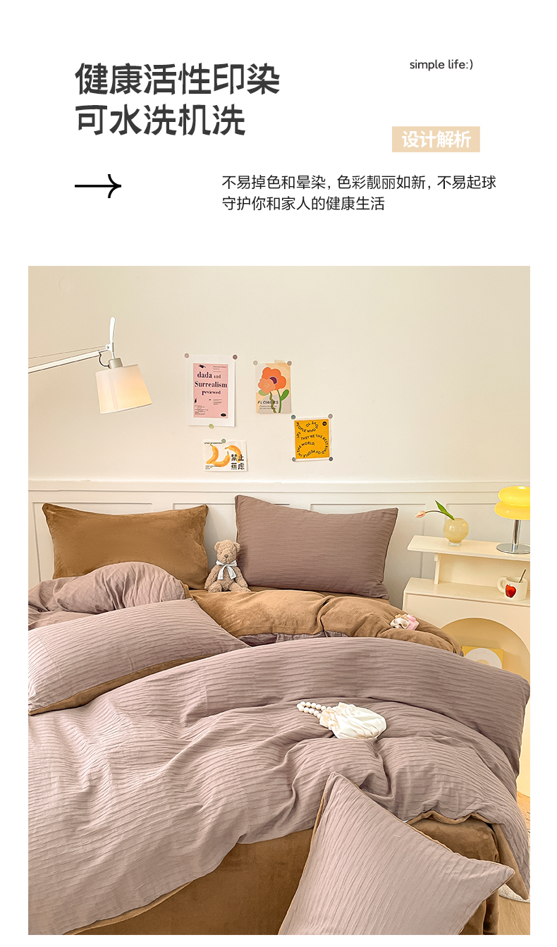 商品名称:雅居纺家纺 2023新款全棉泡泡纱牛奶绒四件套 泡泡纱+绒-魔幻咖