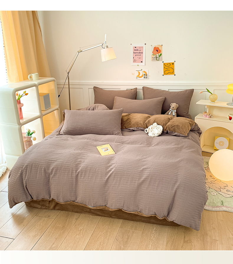 雅居纺家纺 2023新款全棉泡泡纱牛奶绒四件套 泡泡纱+绒-魔幻咖