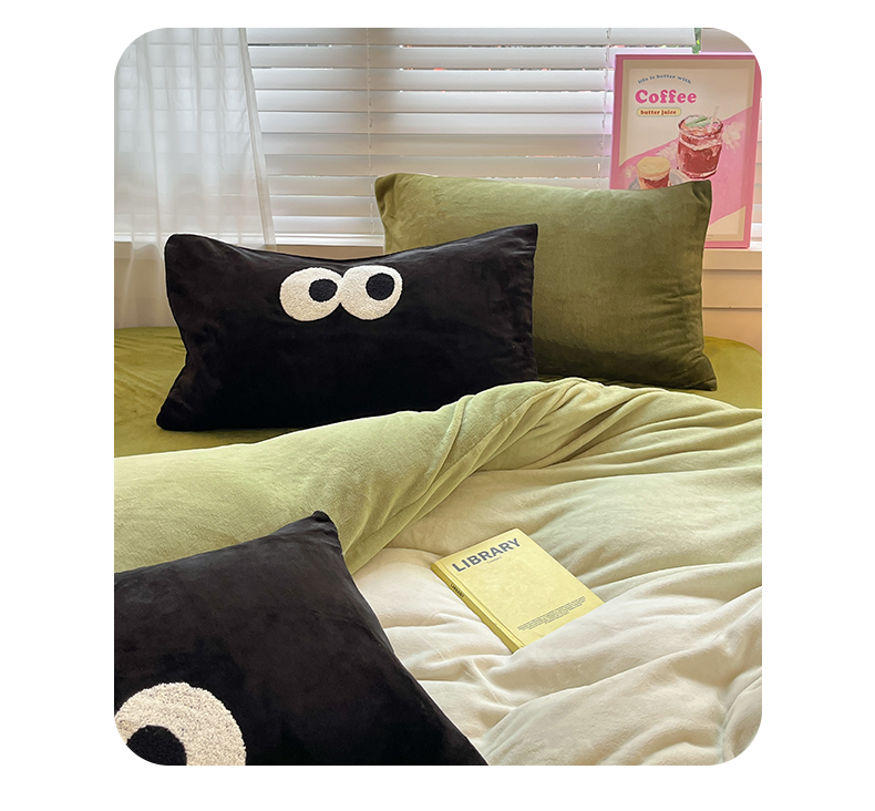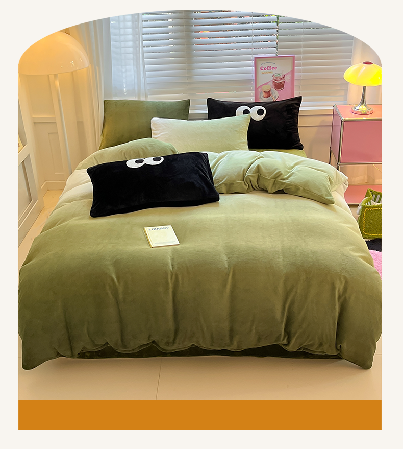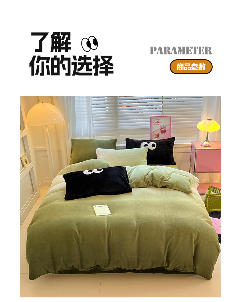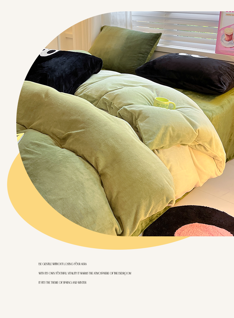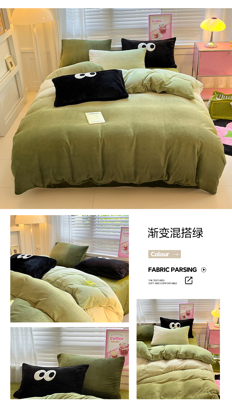 商品名称:雅居纺家纺 2023新款毛巾绣混搭牛奶绒四件套 渐变混搭绿