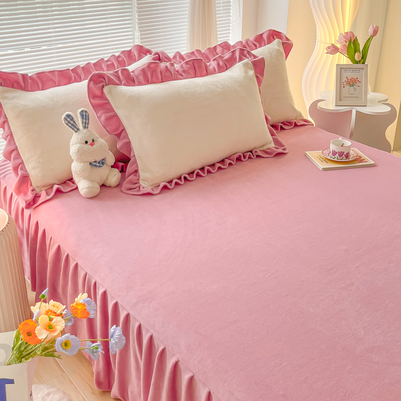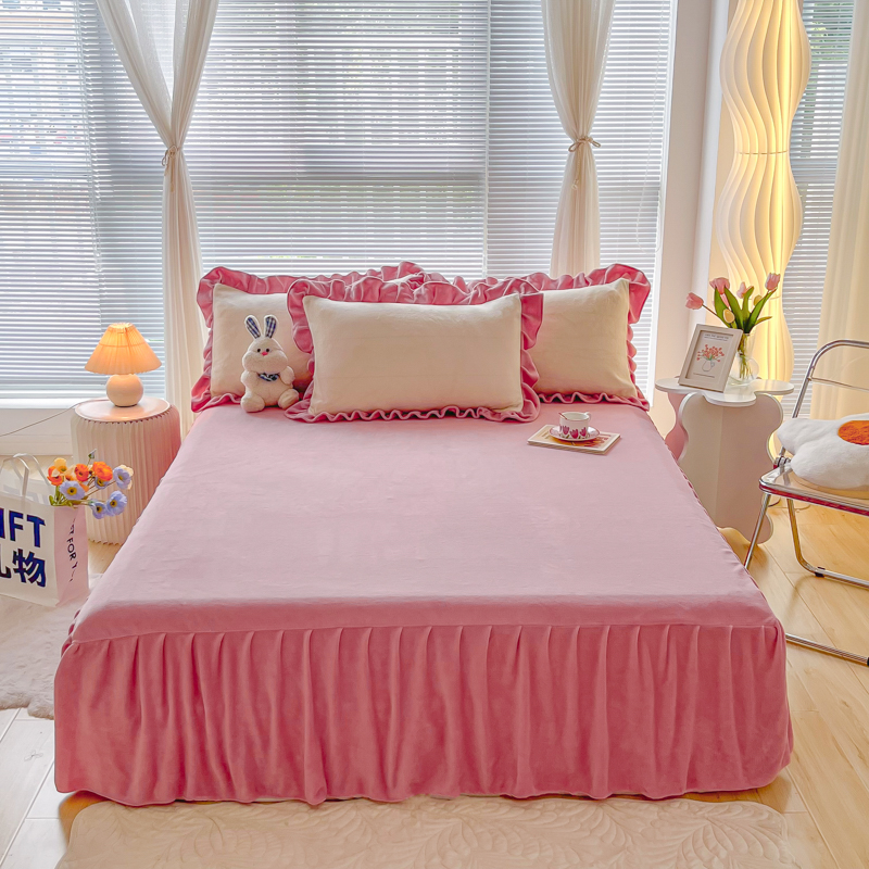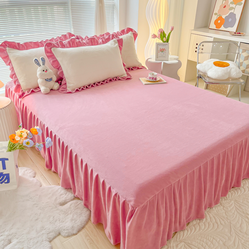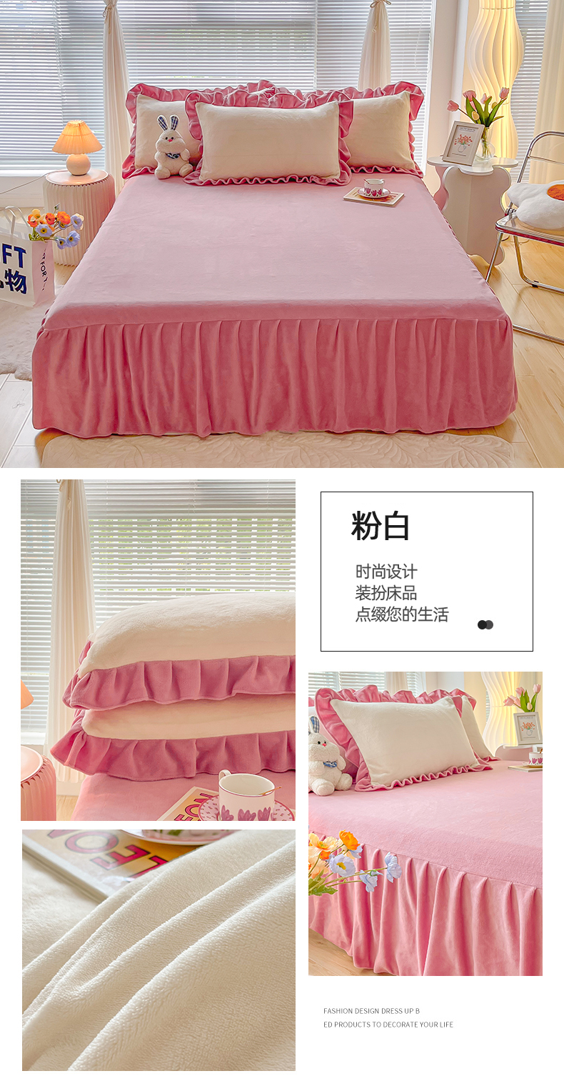 商品名称:十里居 2023新款纯色韩版花边牛奶绒单床裙三件套 粉白