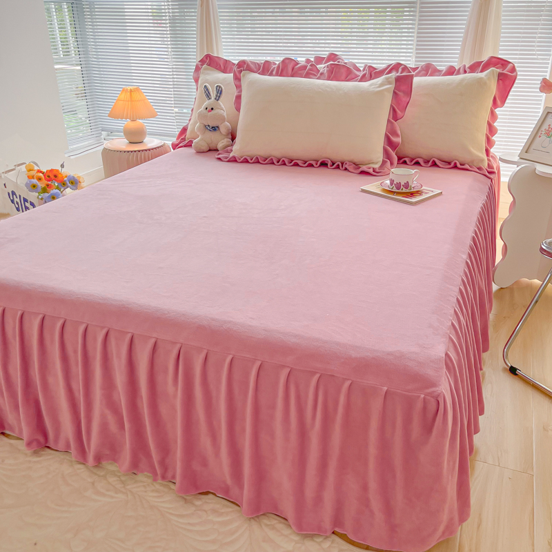 十里居 2023新款纯色韩版花边牛奶绒单床裙三件套 粉白