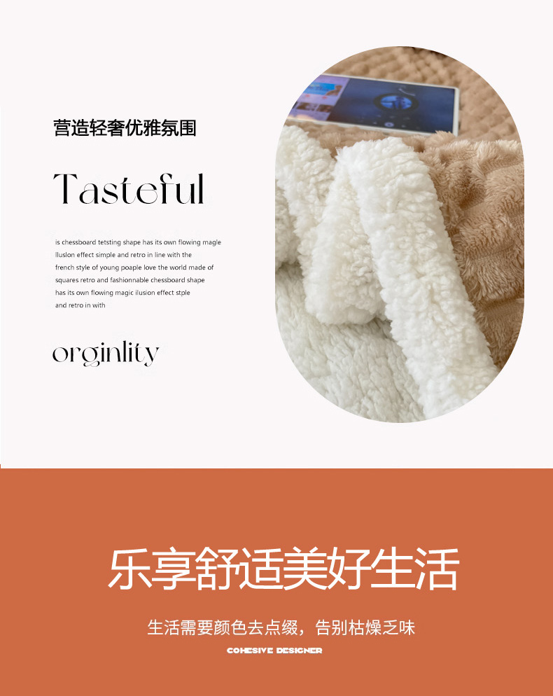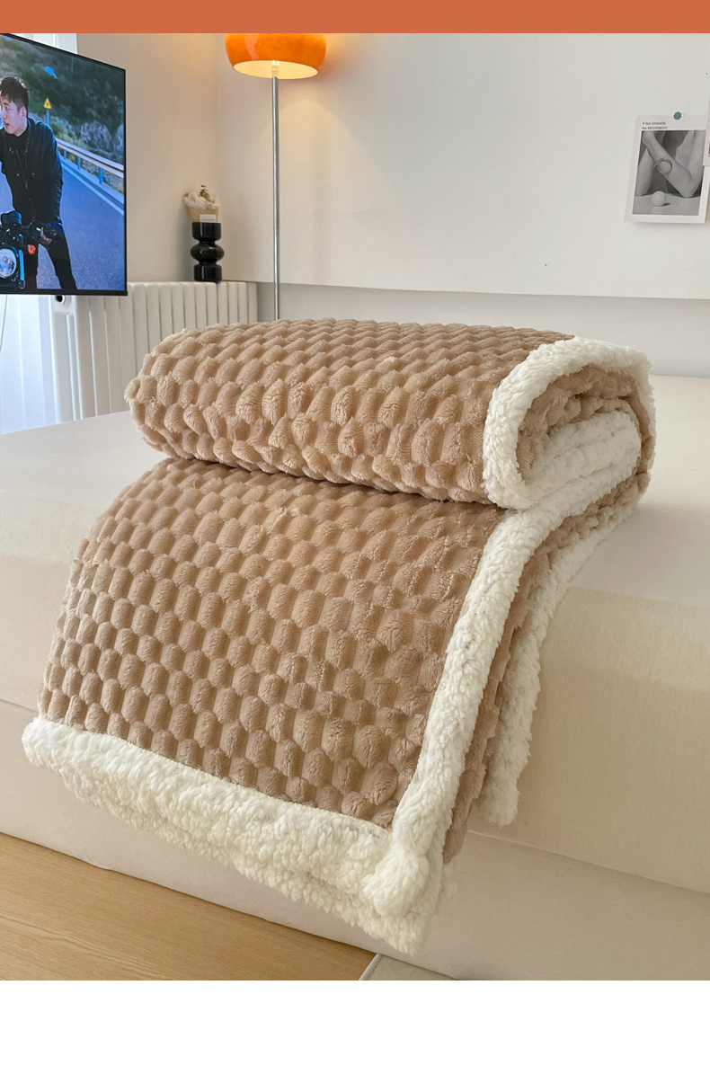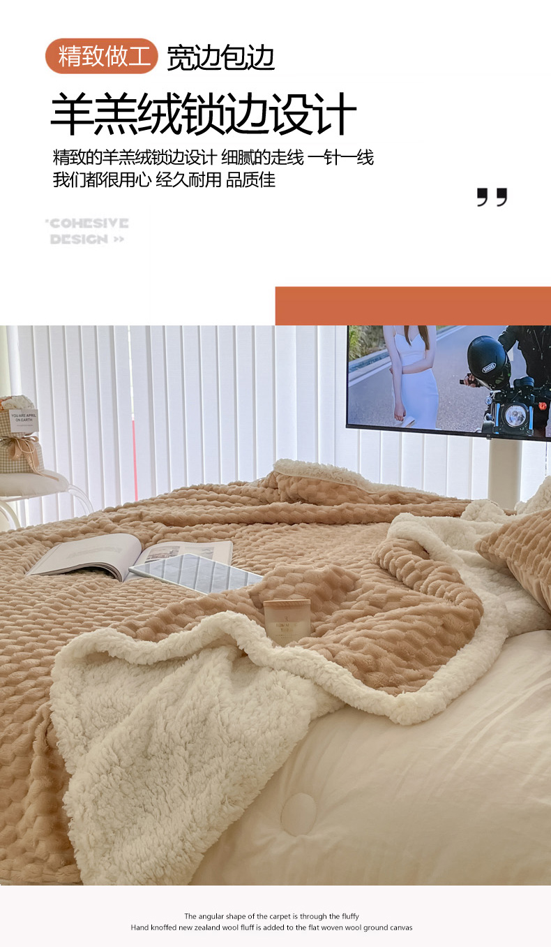 商品名称:沐慕 2023新款纯色简约龟背绒拼羊羔绒毛毯 米驼