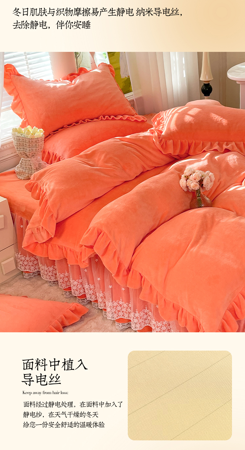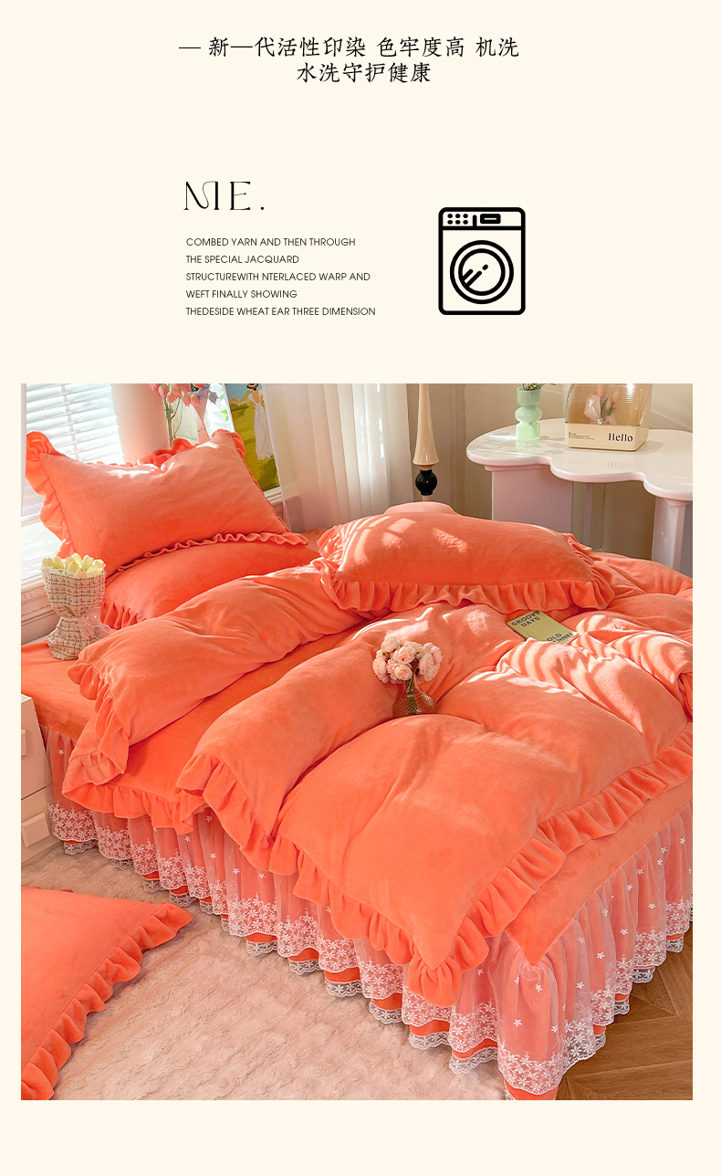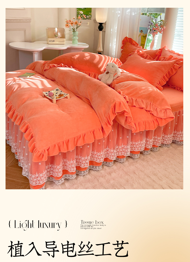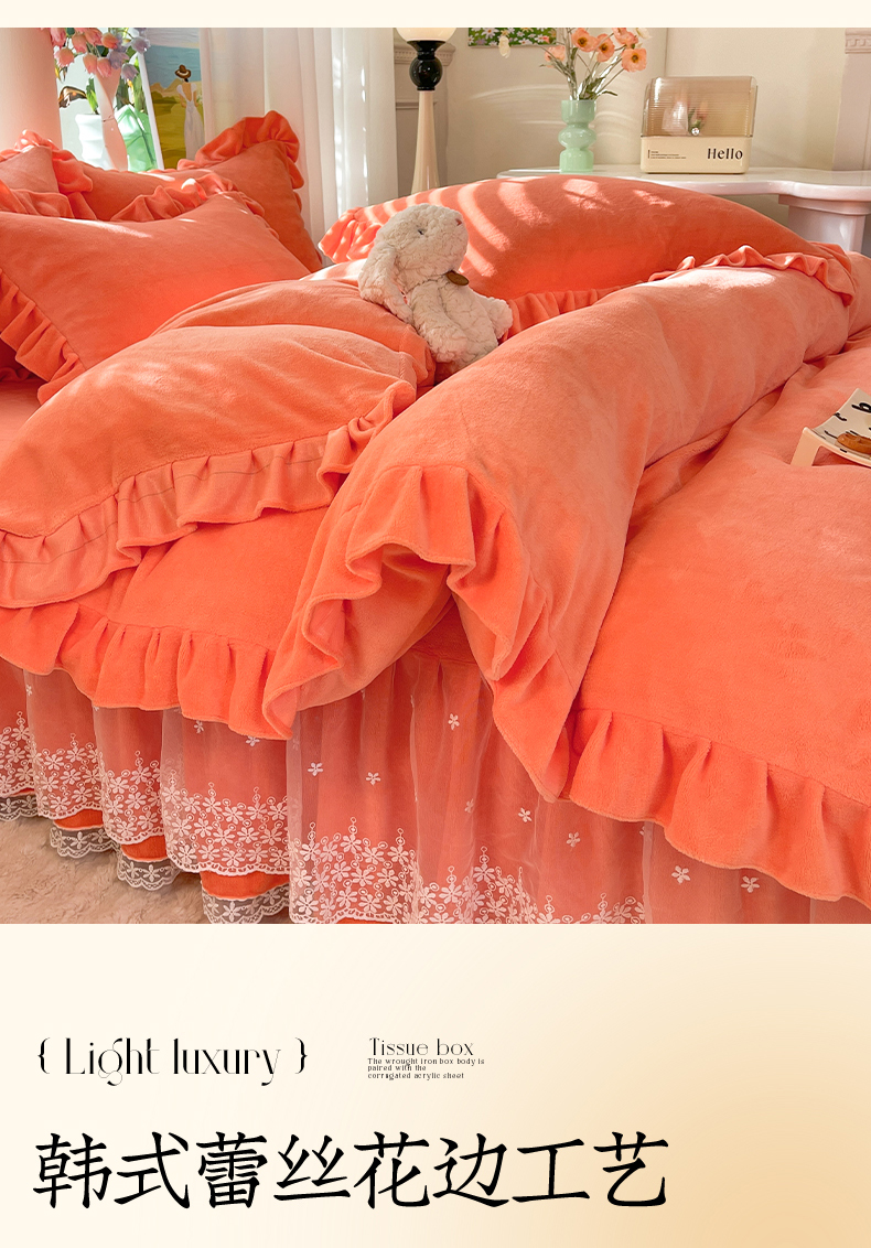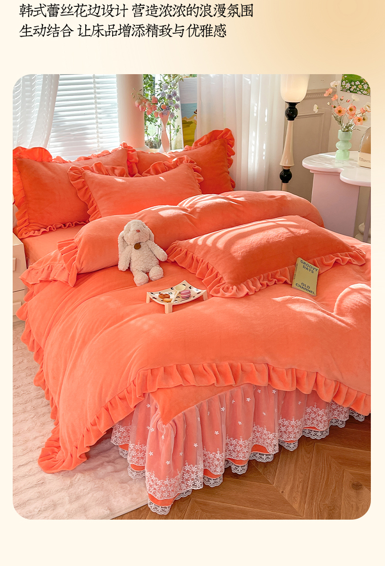 商品名称:【8斤重】2025新款秋冬加厚牛奶绒床裙款四件套法式浪漫蕾丝花边工艺-遇见系列 遇见-香妃橙