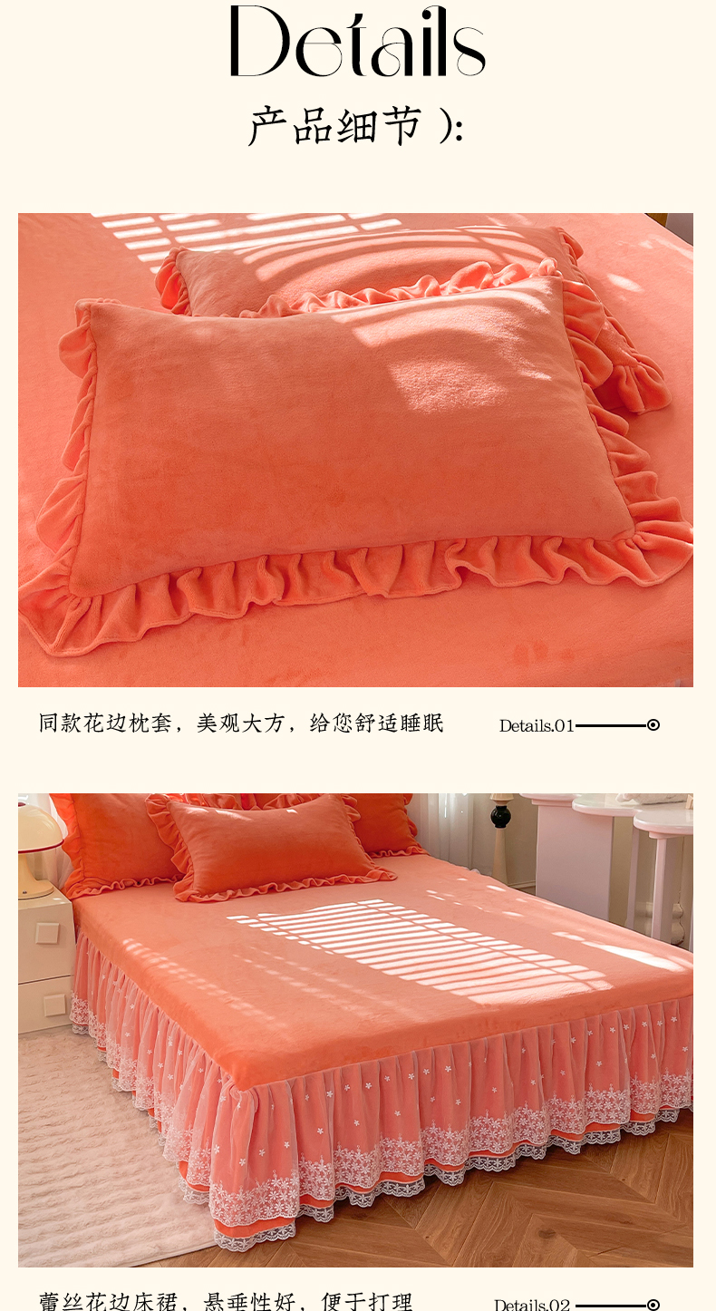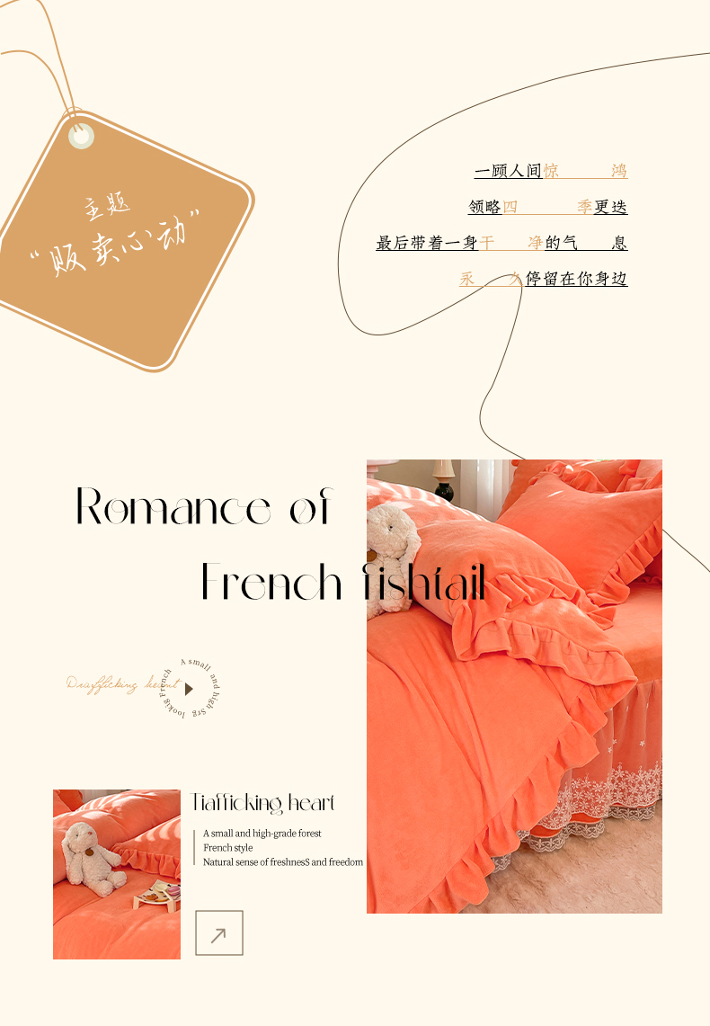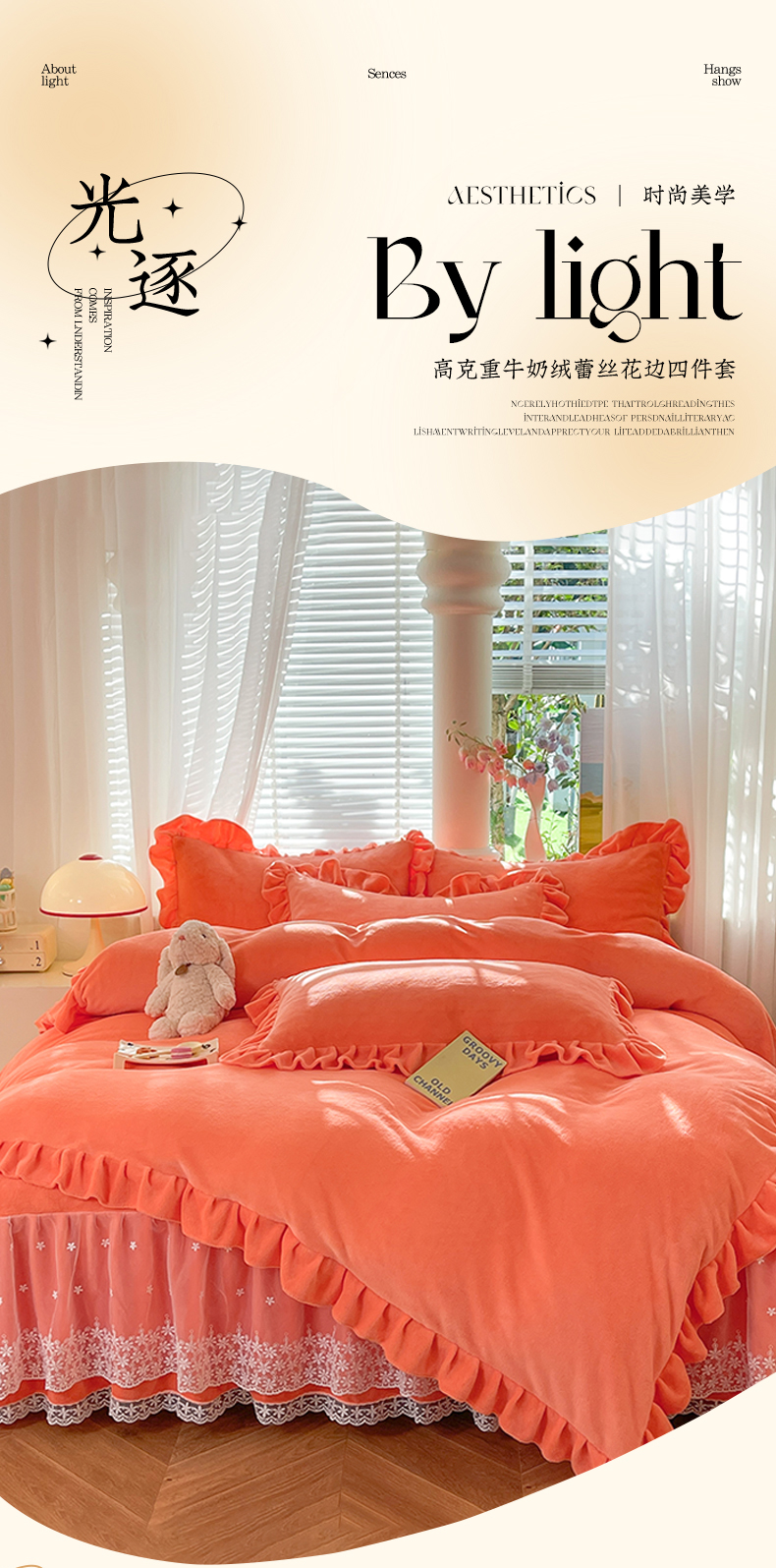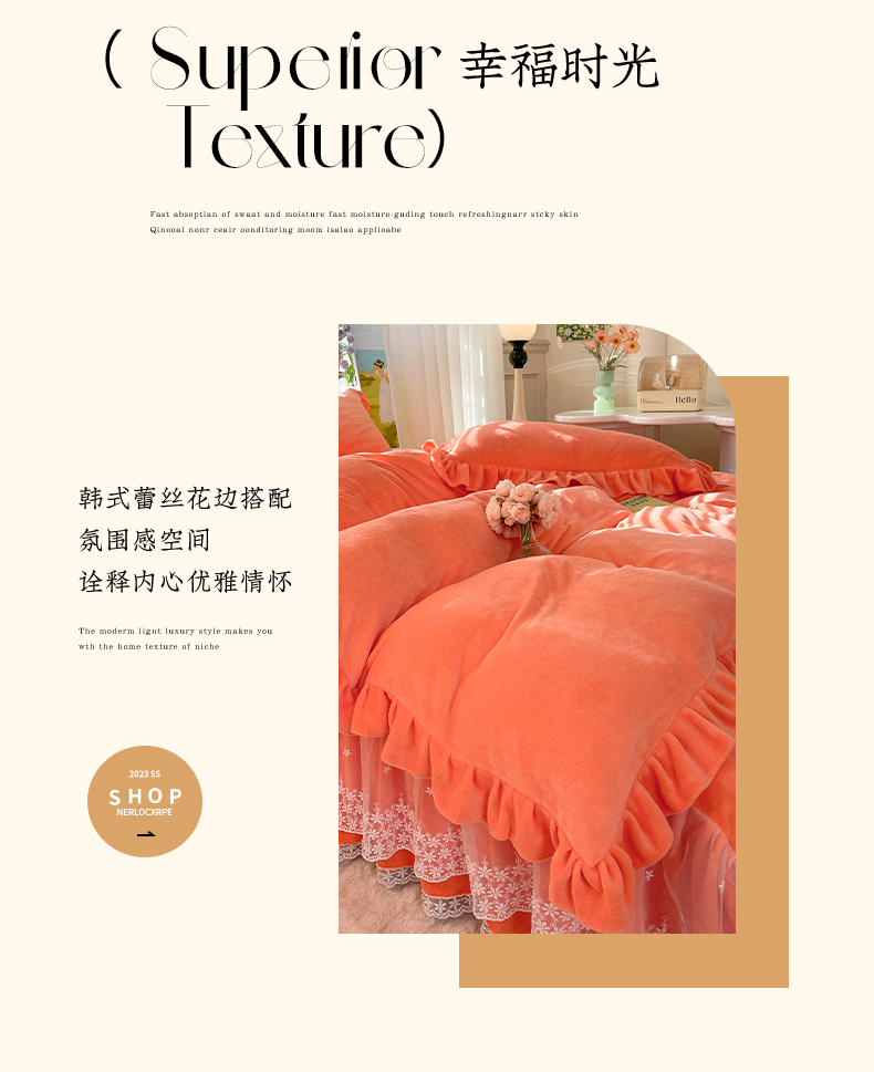 商品名称:【8斤重】2025新款秋冬加厚牛奶绒床裙款四件套法式浪漫蕾丝花边工艺-遇见系列 遇见-香妃橙