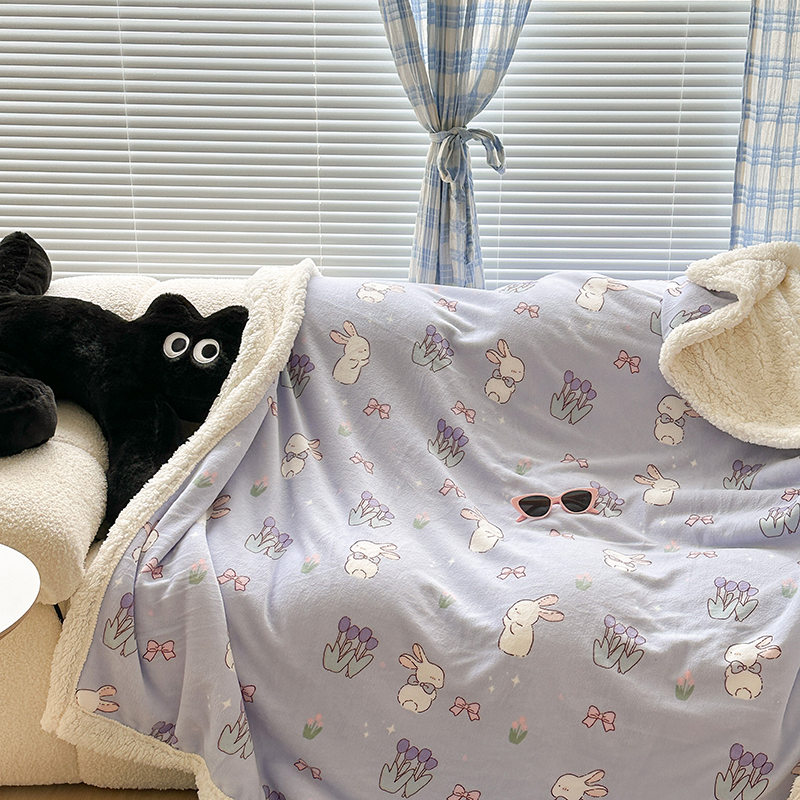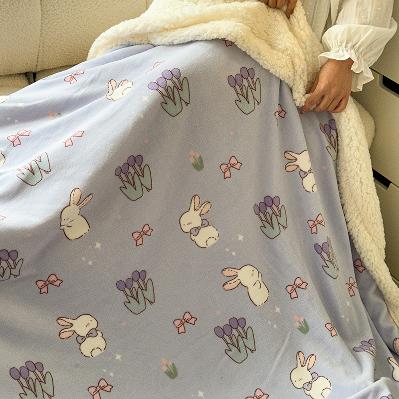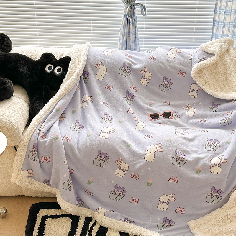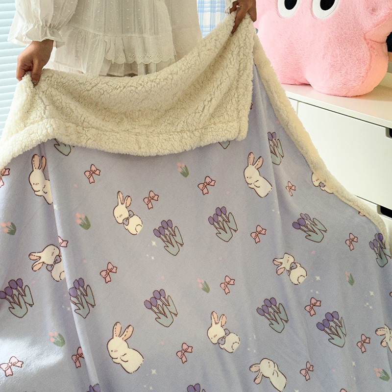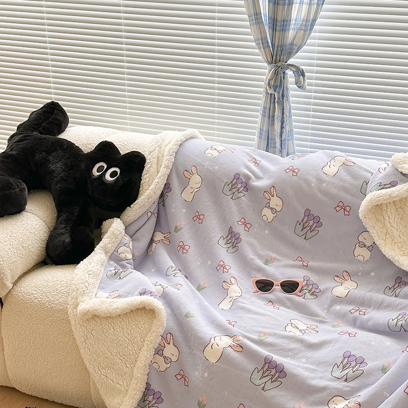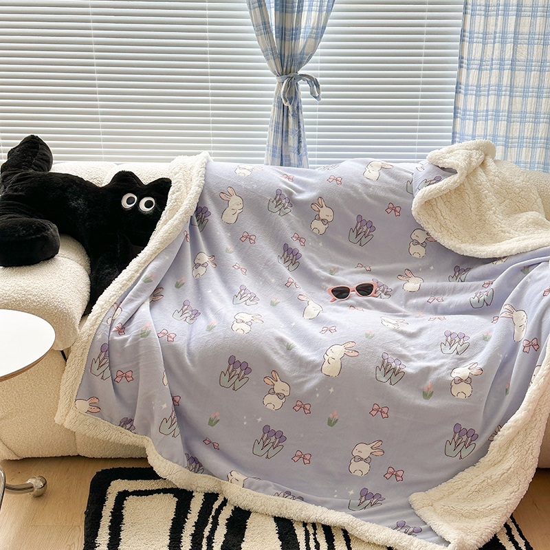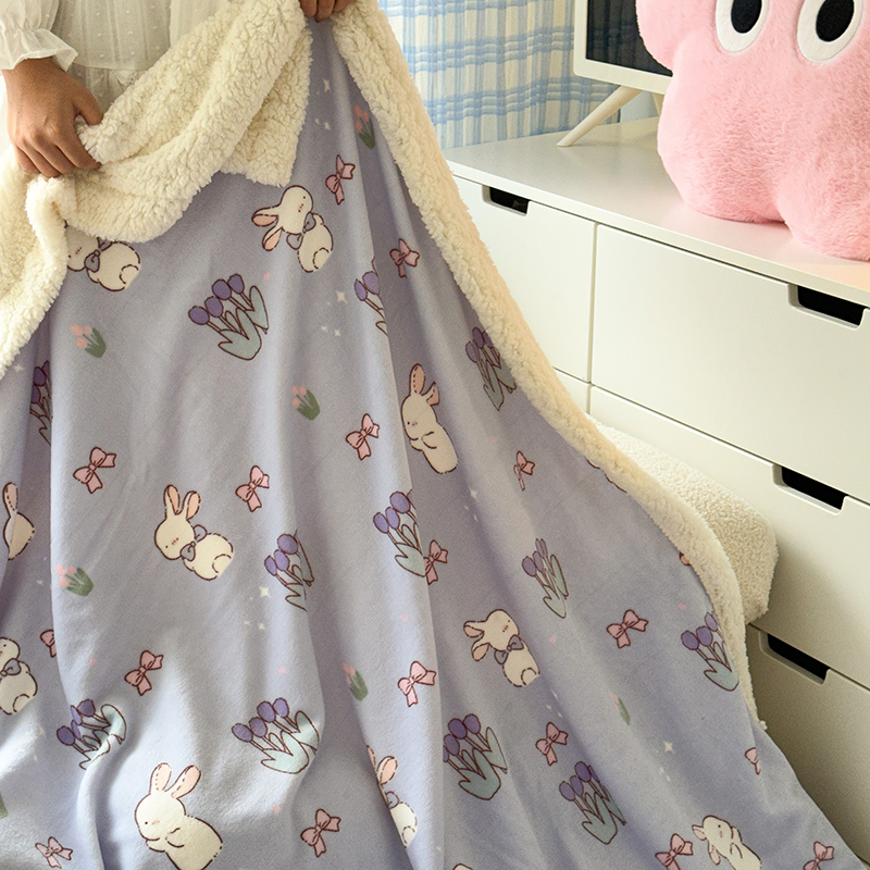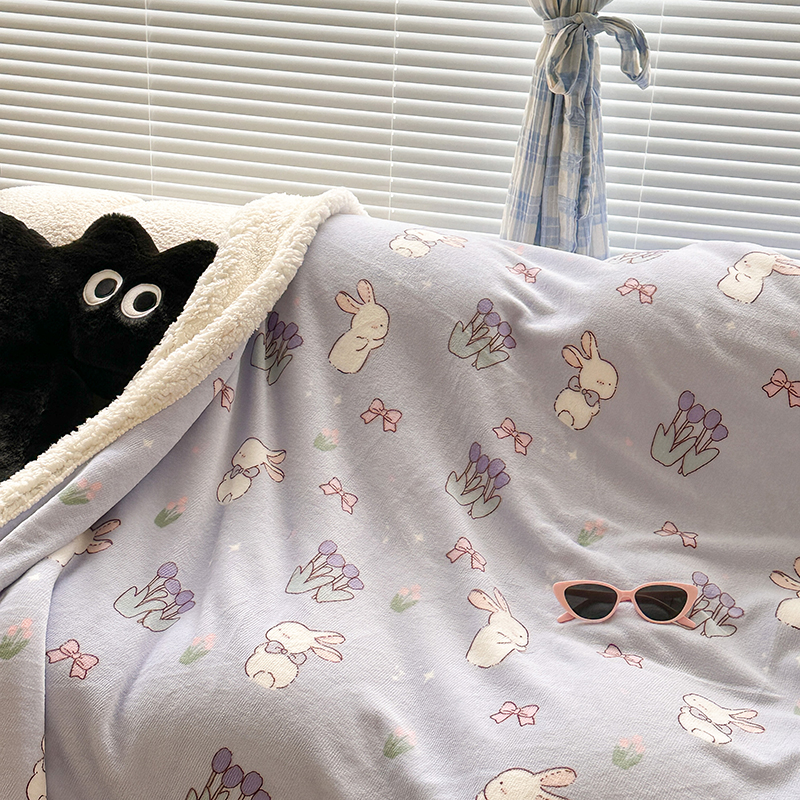 昔可家纺 2023新款ins风牛奶绒羊羔绒印花毛毯(风格二) 萌萌紫底郁金香兔