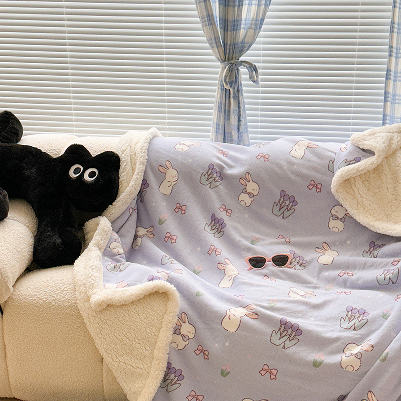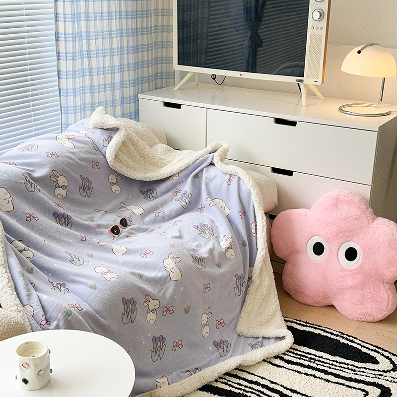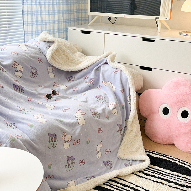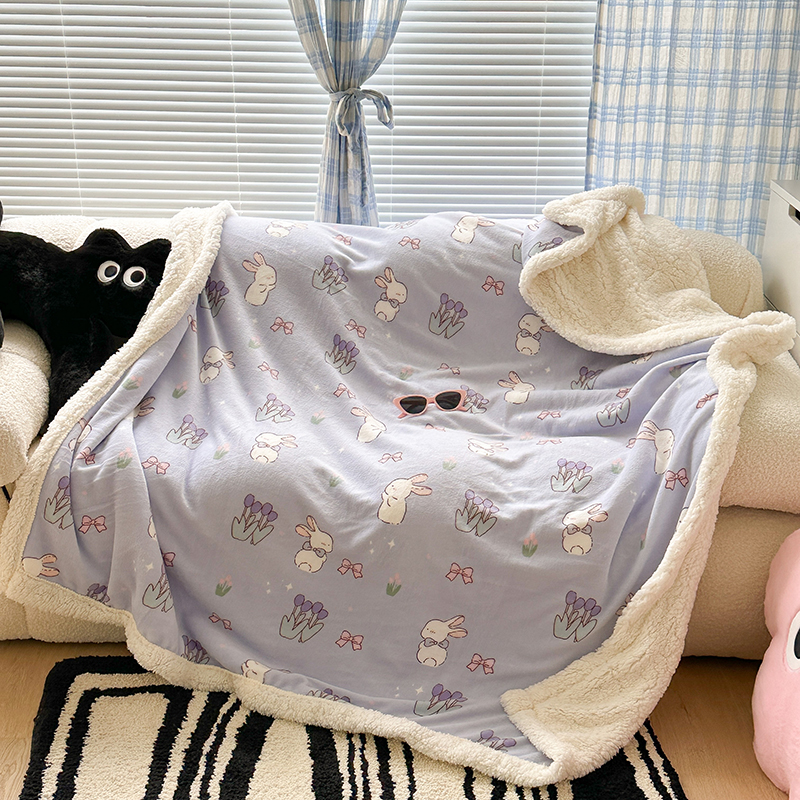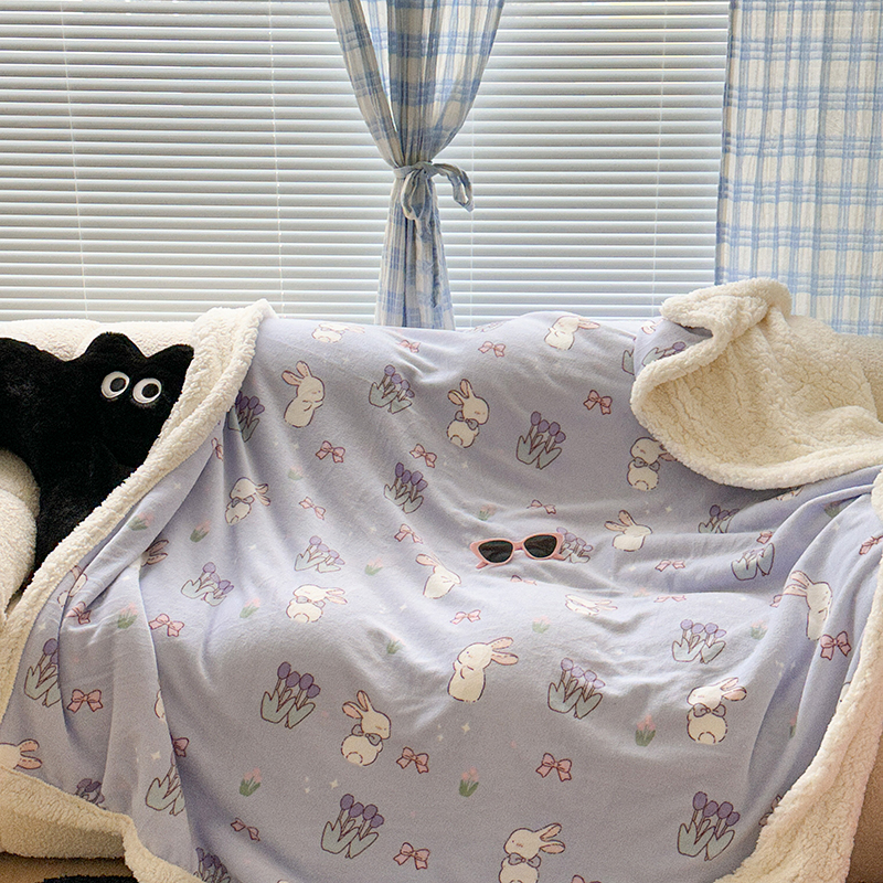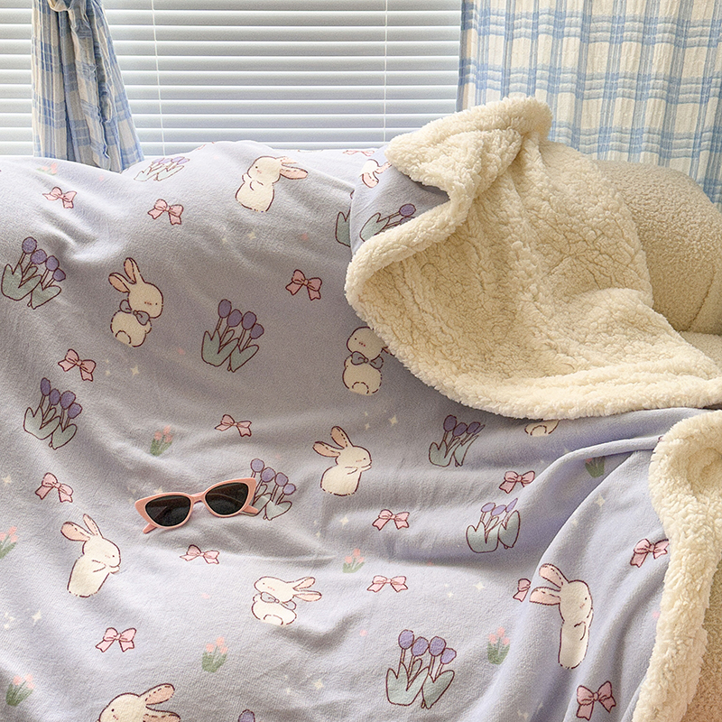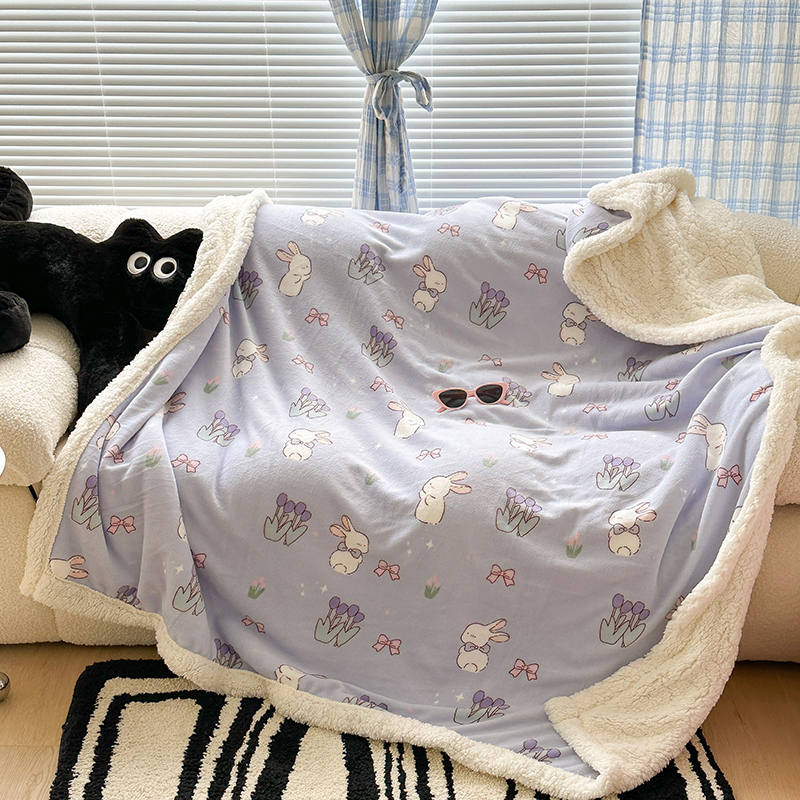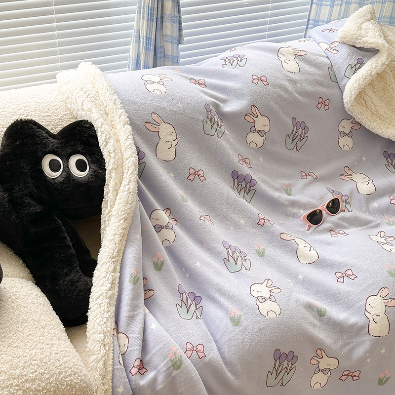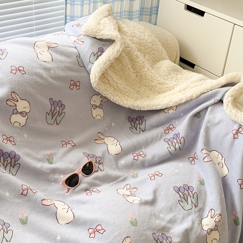 昔可家纺 2023新款ins风牛奶绒羊羔绒印花毛毯(风格二) 萌萌紫底郁金香兔