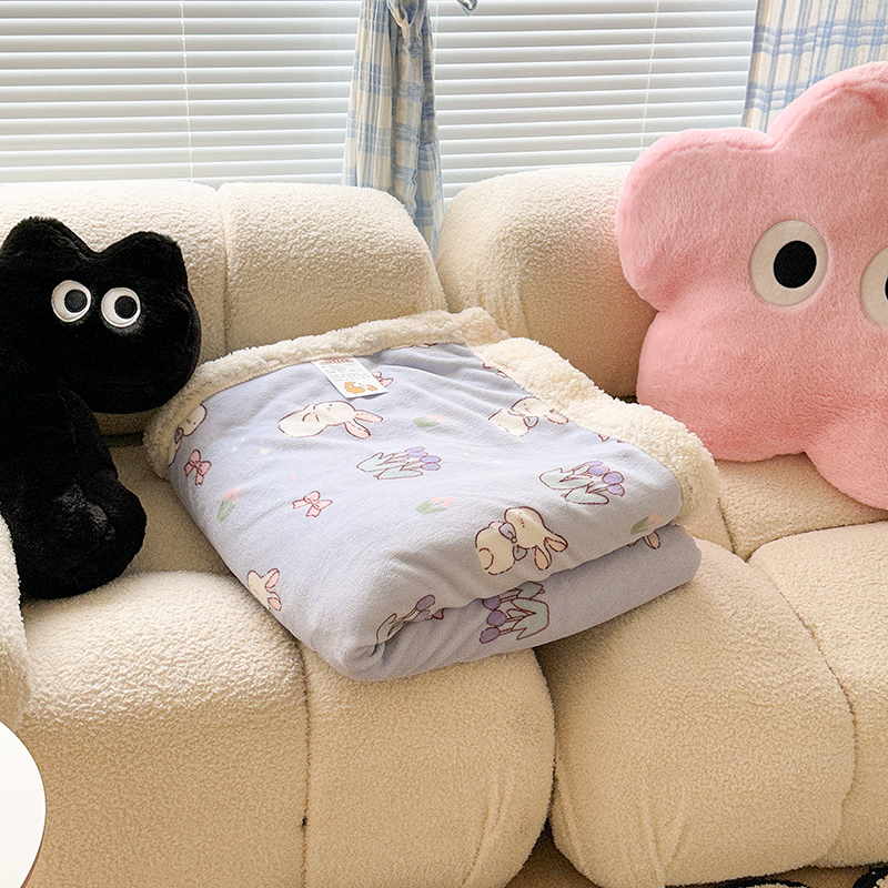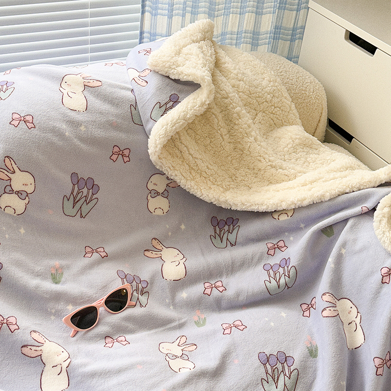 商品名称:昔可家纺 2023新款ins风牛奶绒羊羔绒印花毛毯(风格二) 萌萌紫底郁金香兔