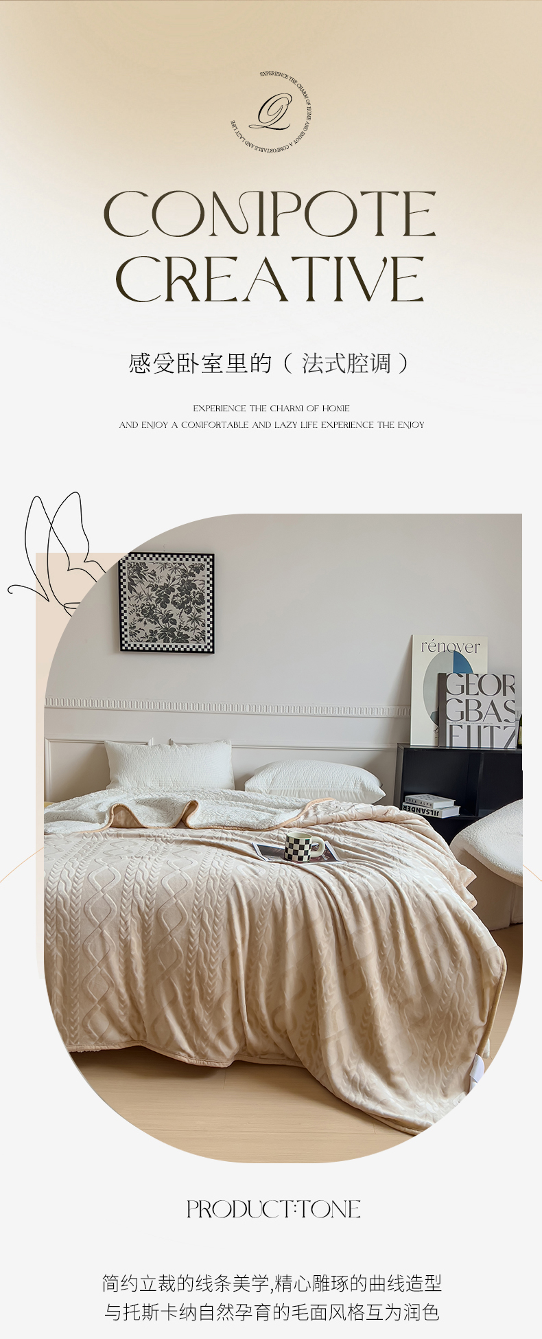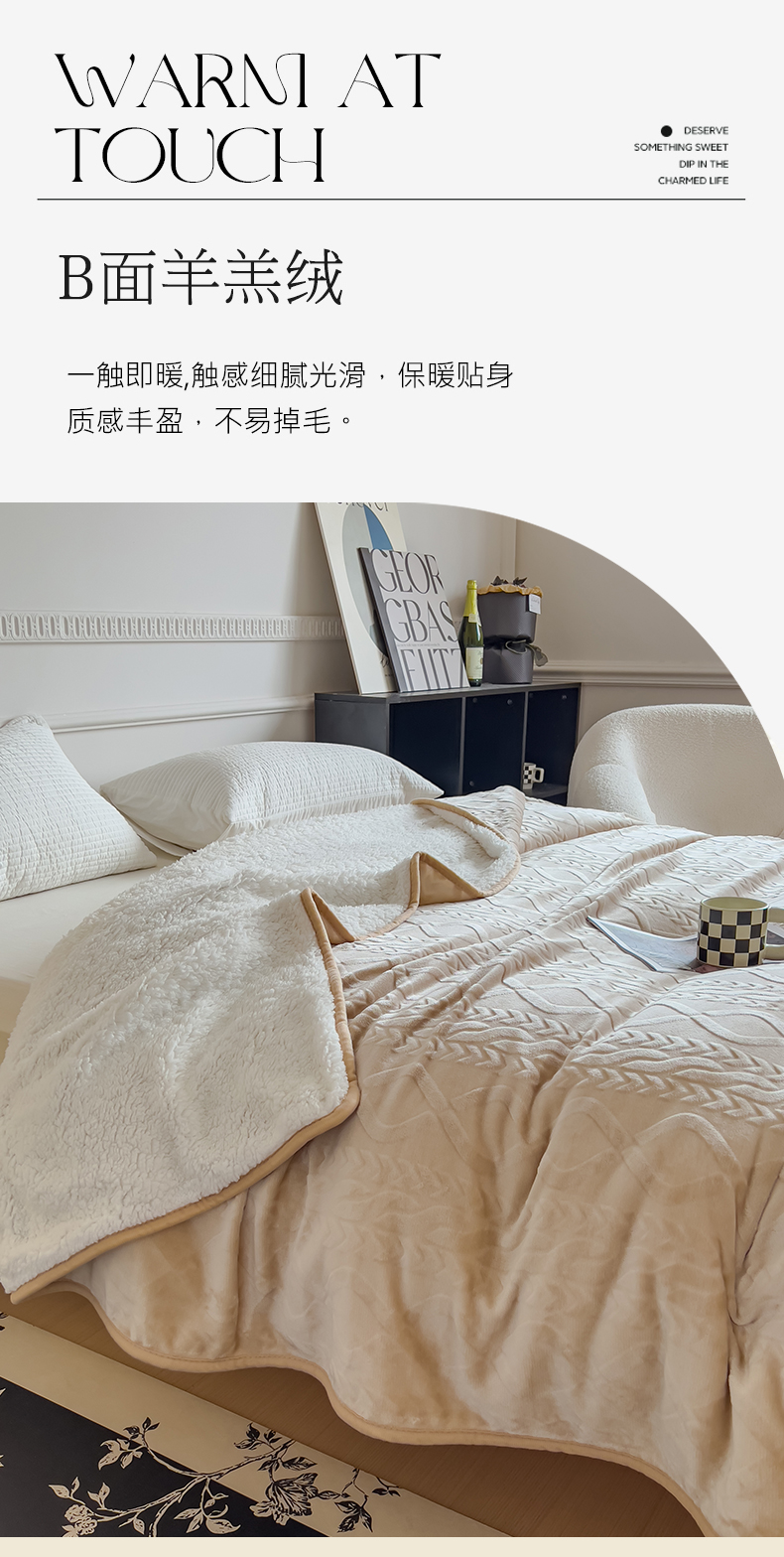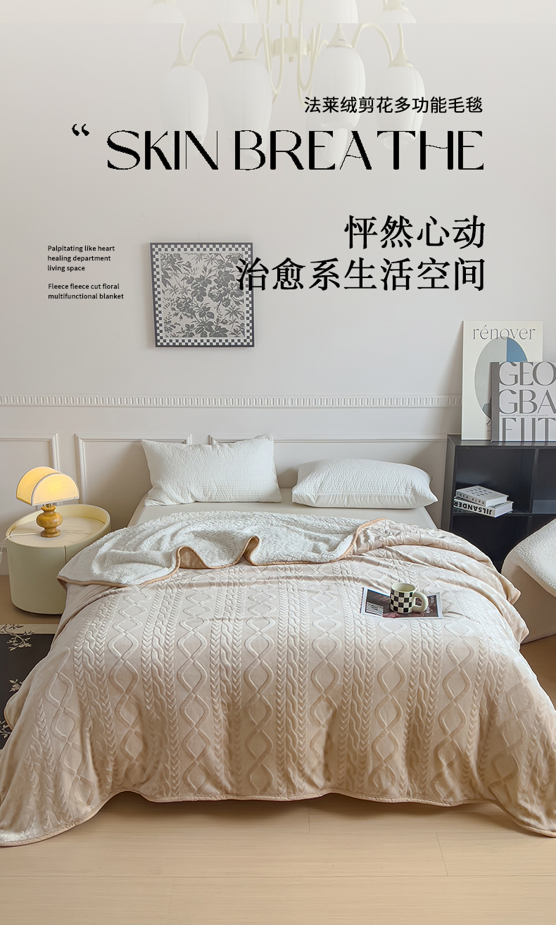 (总)宜家坊 2023新款秋冬高克重法莱绒羊羔绒立体剪花纯色多功能毛毯,奶油白,浅奶咖,绅士灰,胭脂粉,烟灰蓝,优雅棕