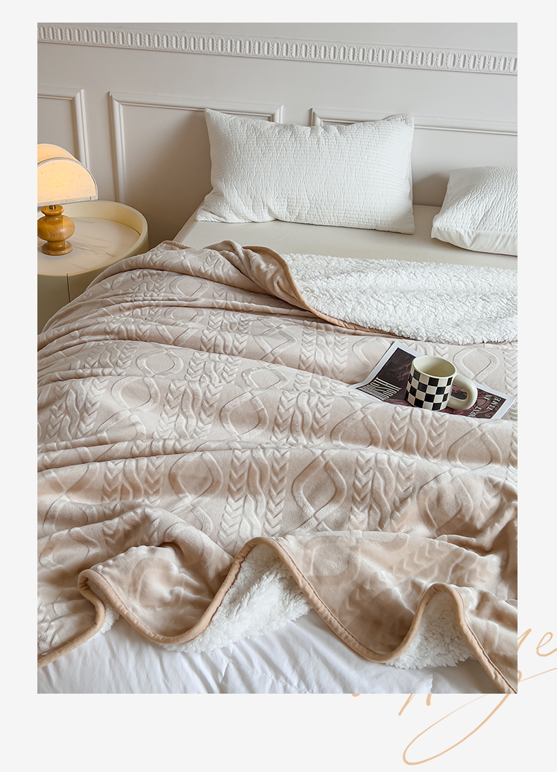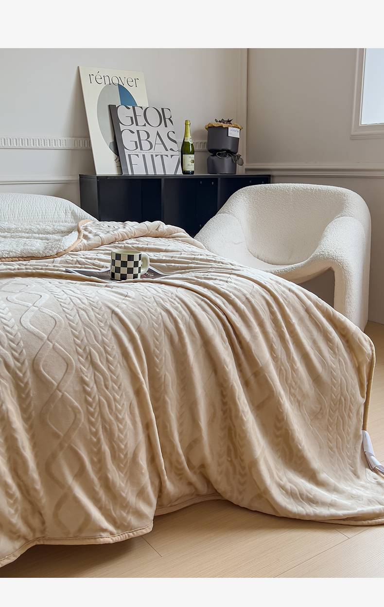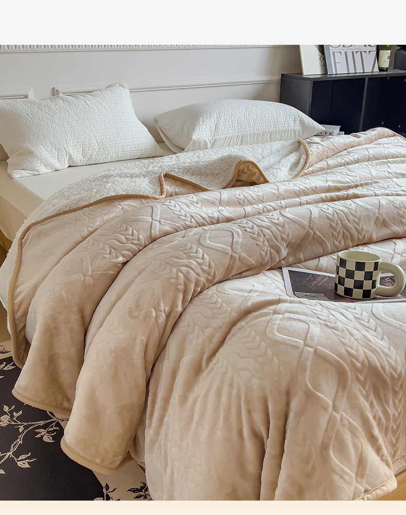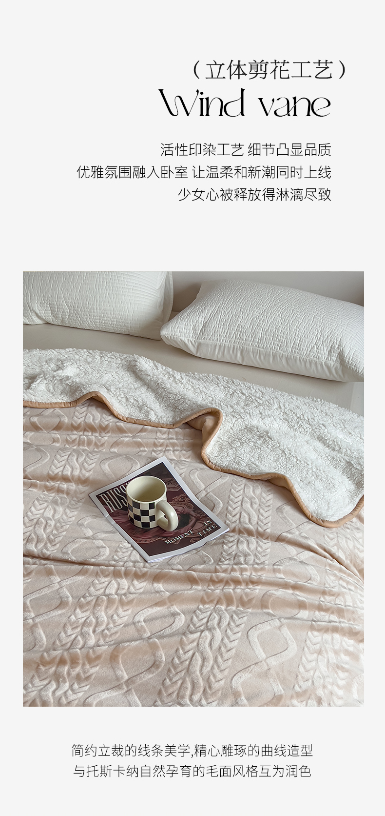 宜家坊 新款秋冬高克重法莱绒羊羔绒立体剪花纯色多功能毛毯 浅奶咖