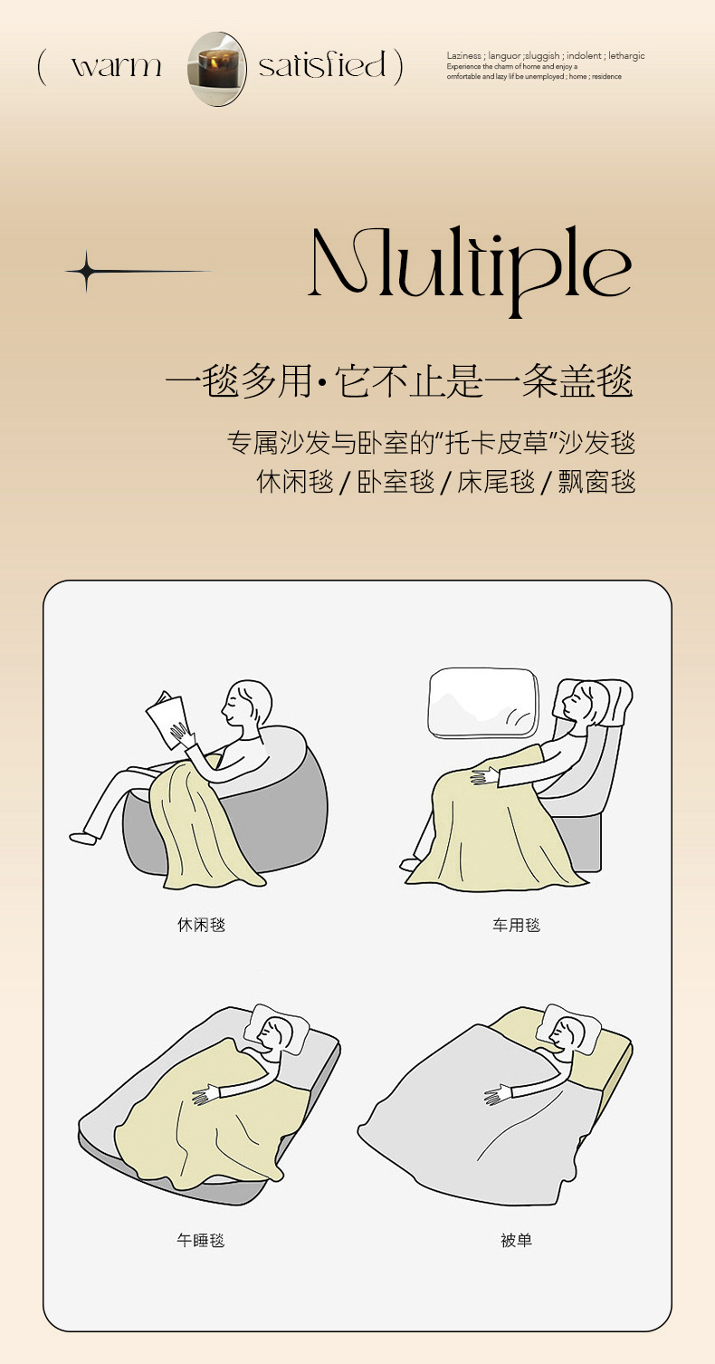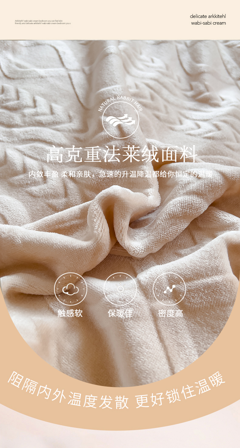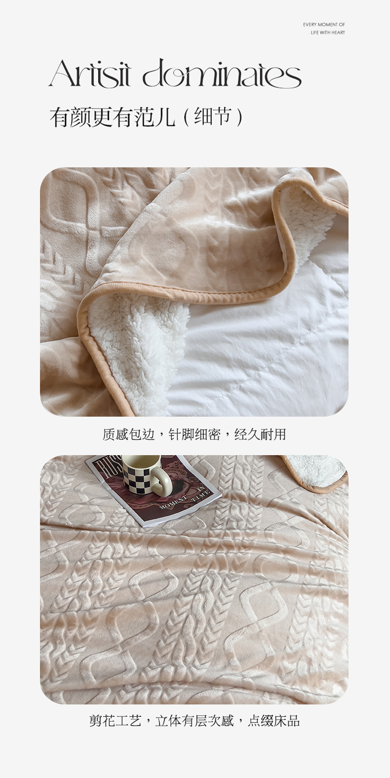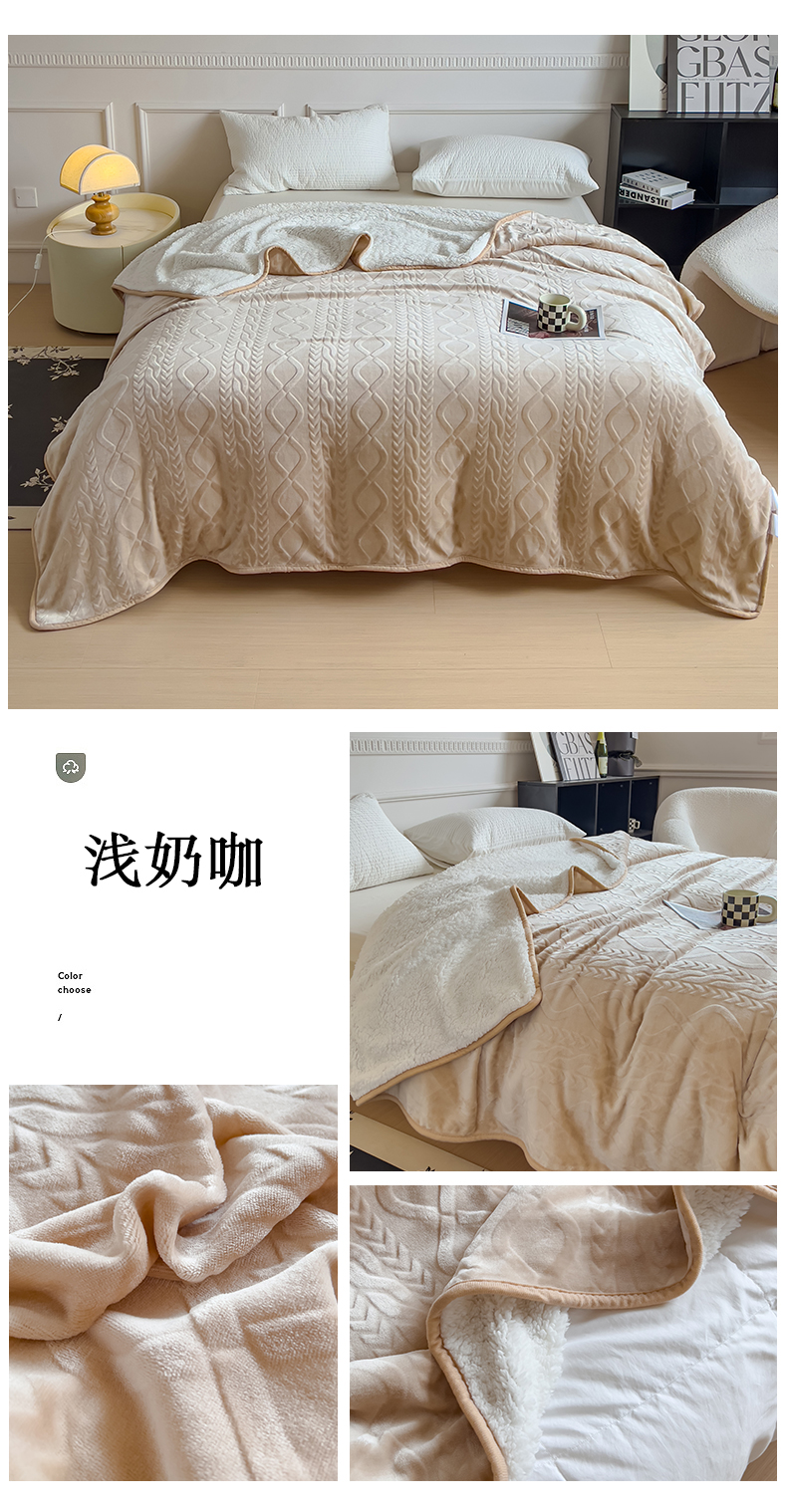 商品名称:宜家坊 新款秋冬高克重法莱绒羊羔绒立体剪花纯色多功能毛毯 浅奶咖